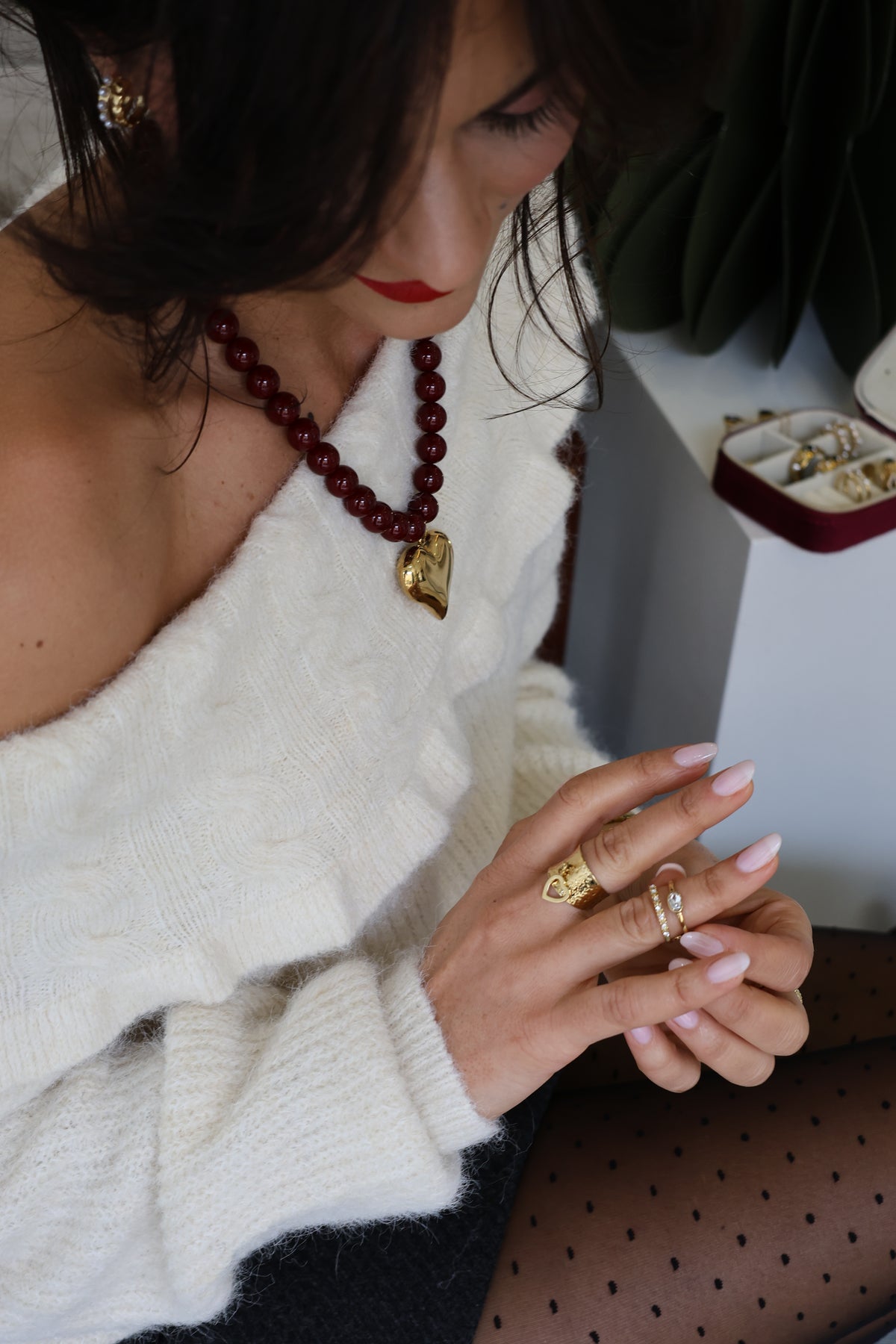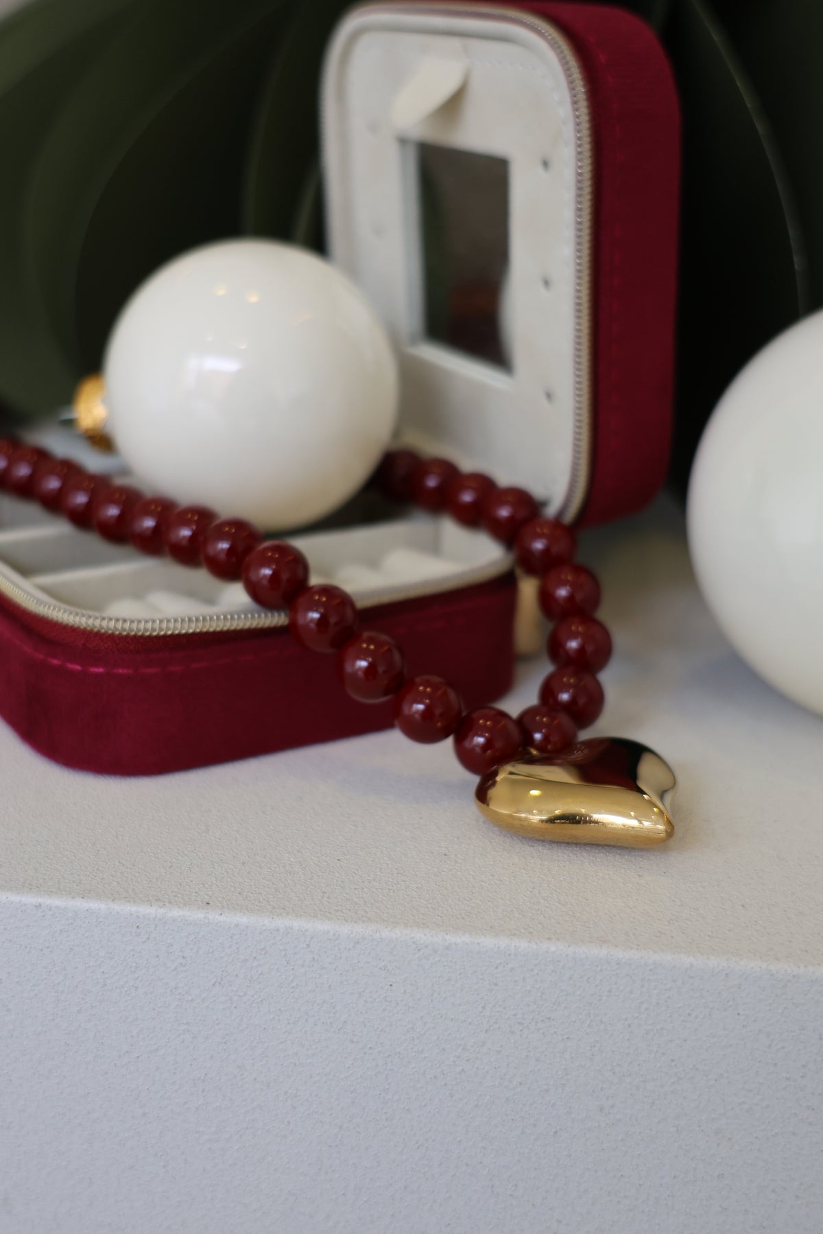Colar pérolas bordô com pendente dourado em formato coração, Coleção Fall-Winter25.