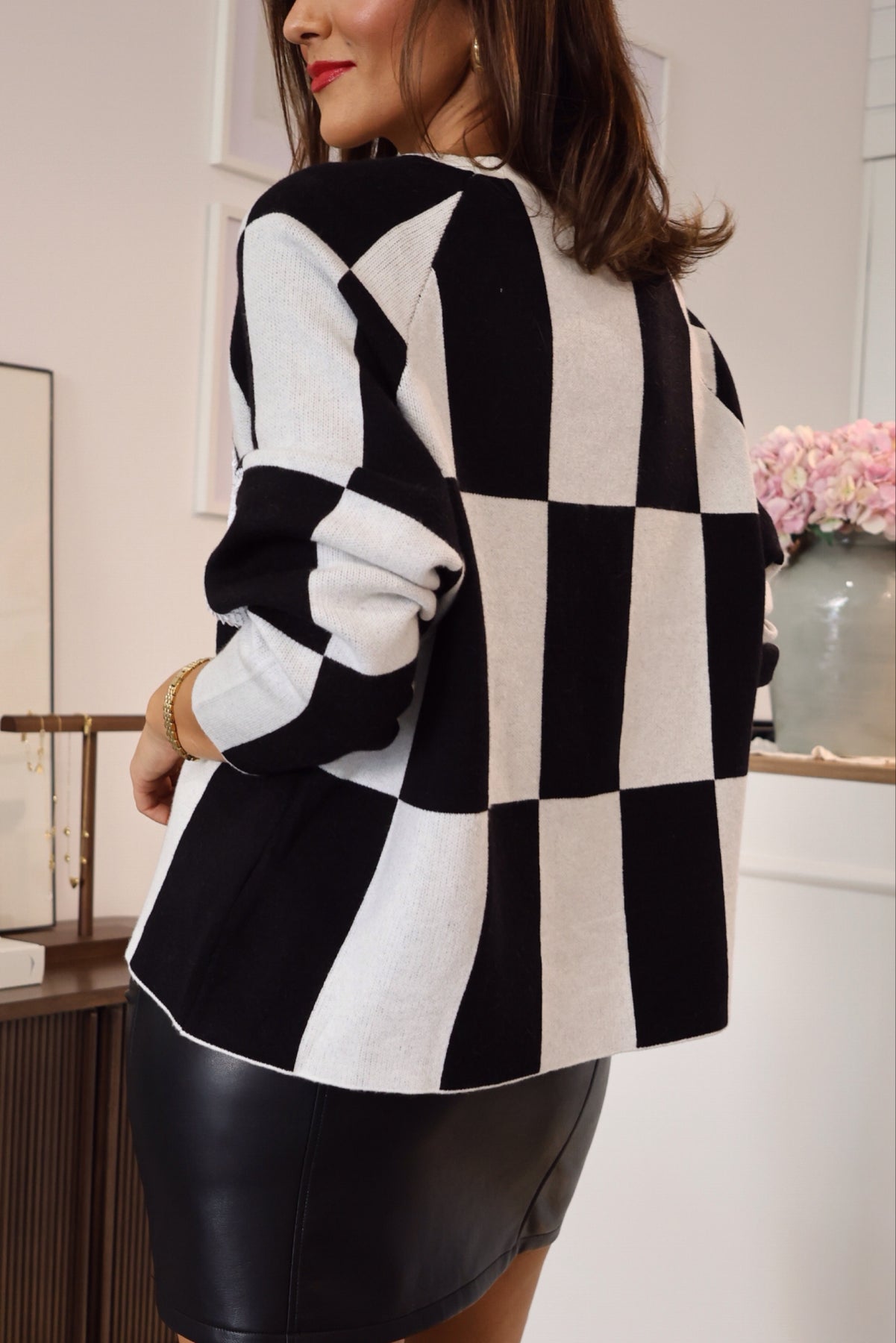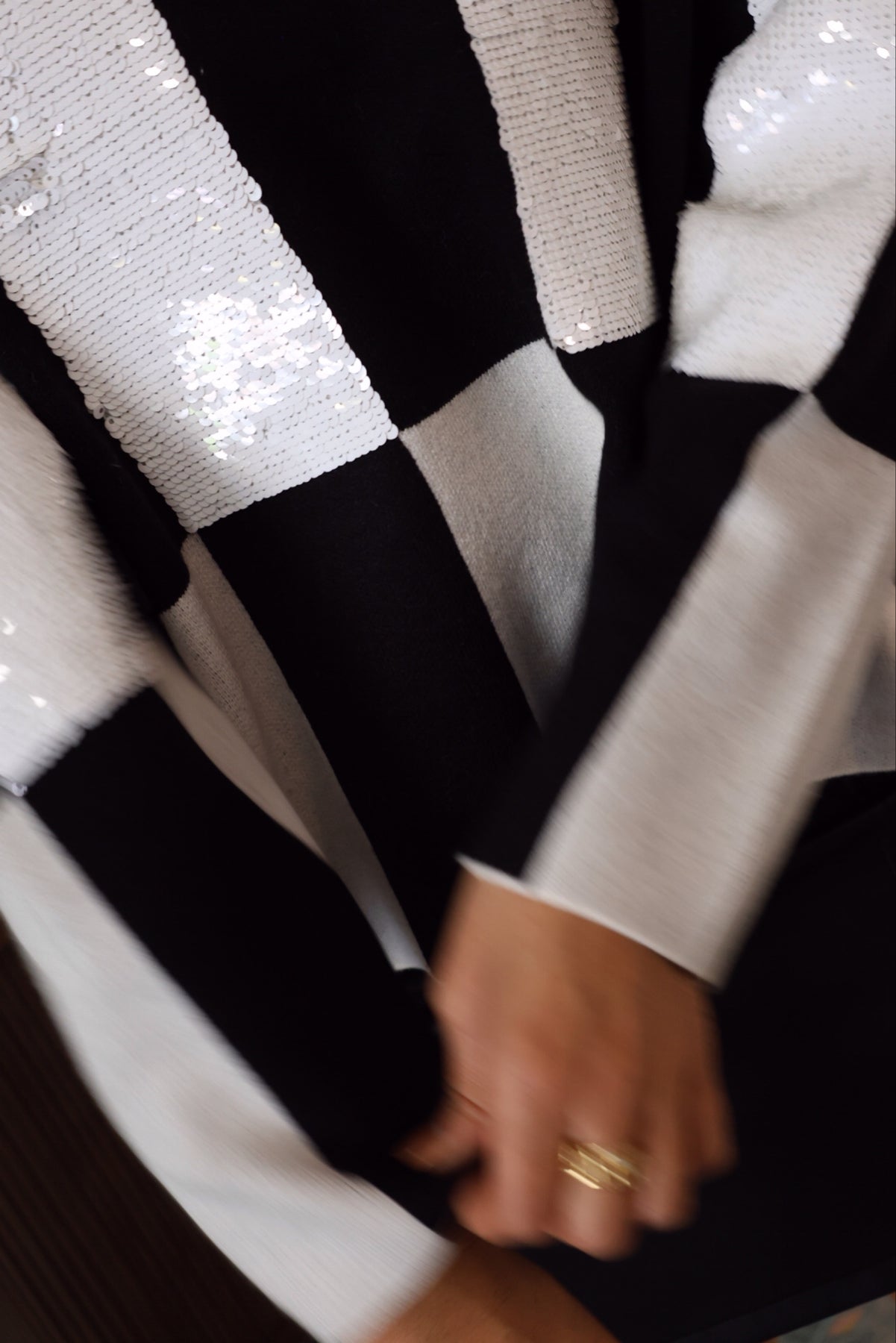 Descrição do produto. Camisola de malha aos quadrados com lantejolas nos braços e peito, Nova Temporada F25.