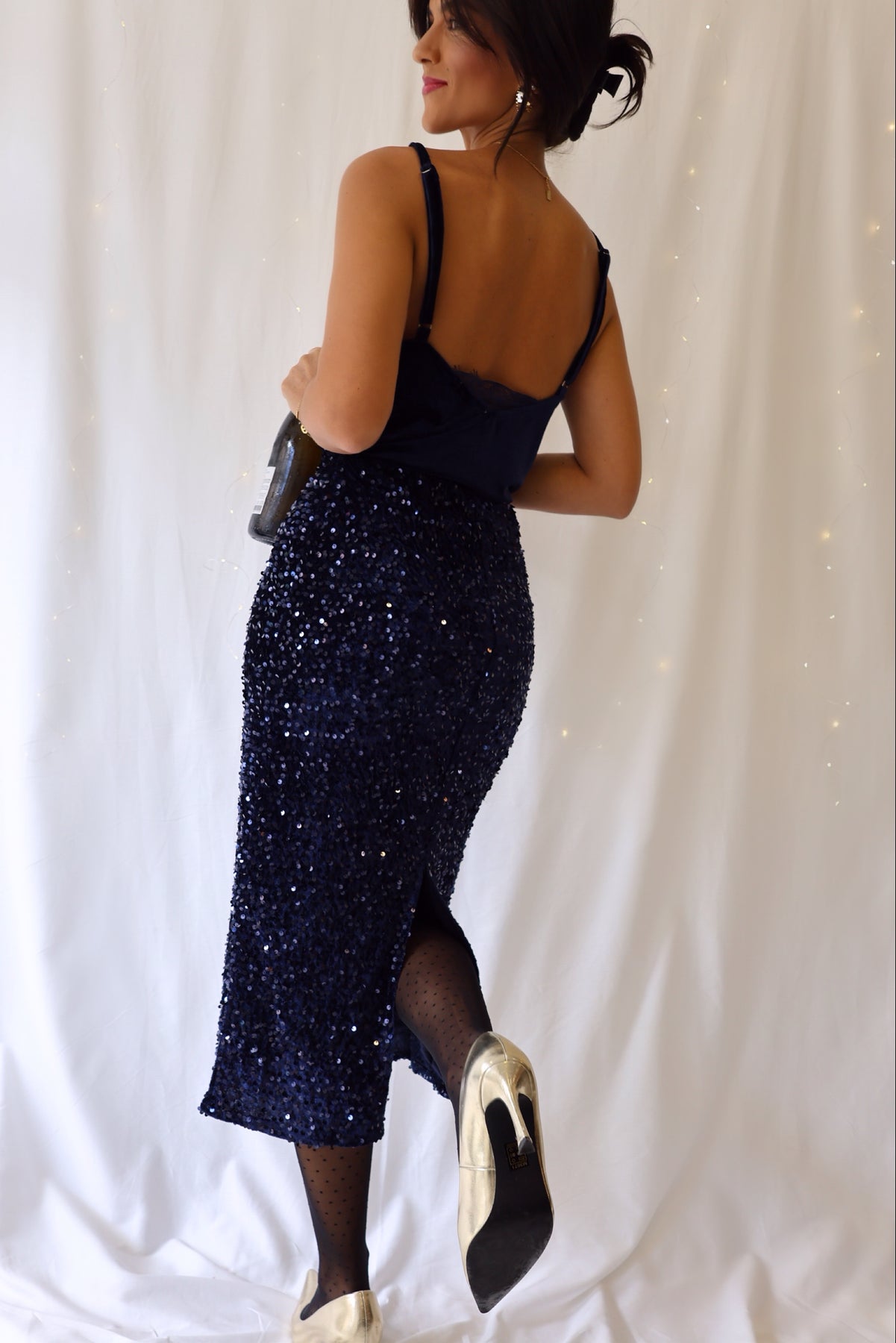 Saia midi em lantejoulas, tecido veludo, pequena racha atrás e forrada por dentro, Coleção Fall-Winter25.