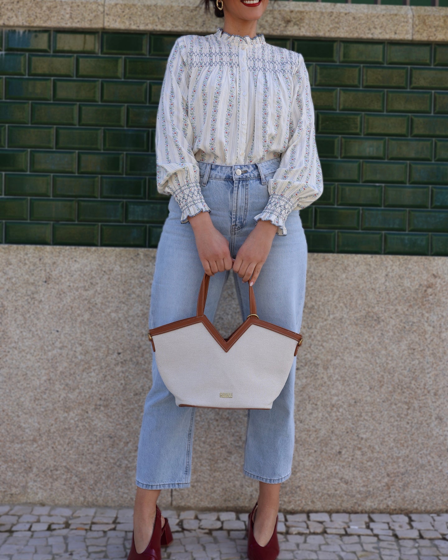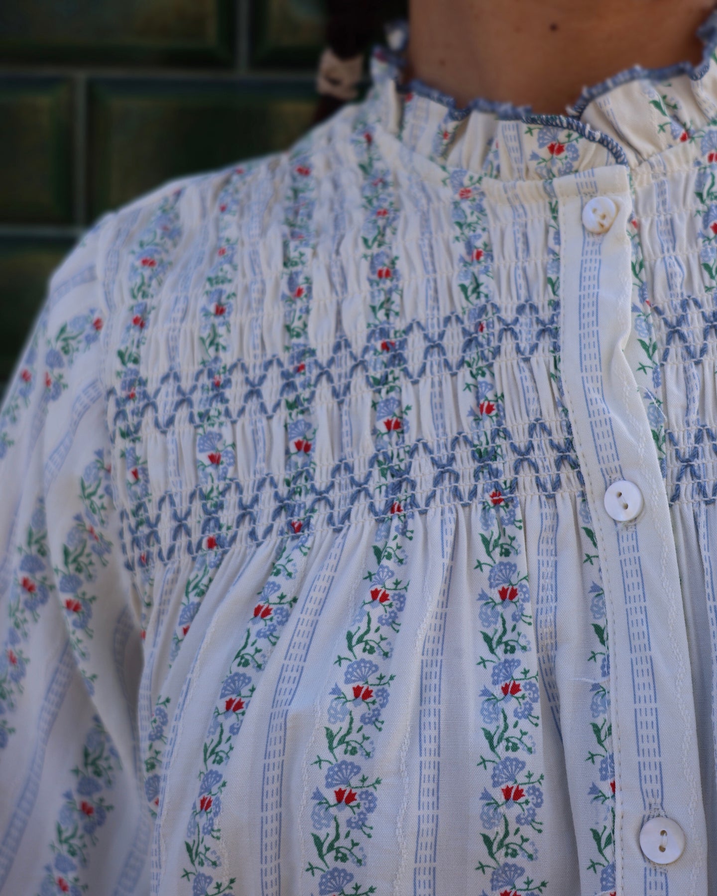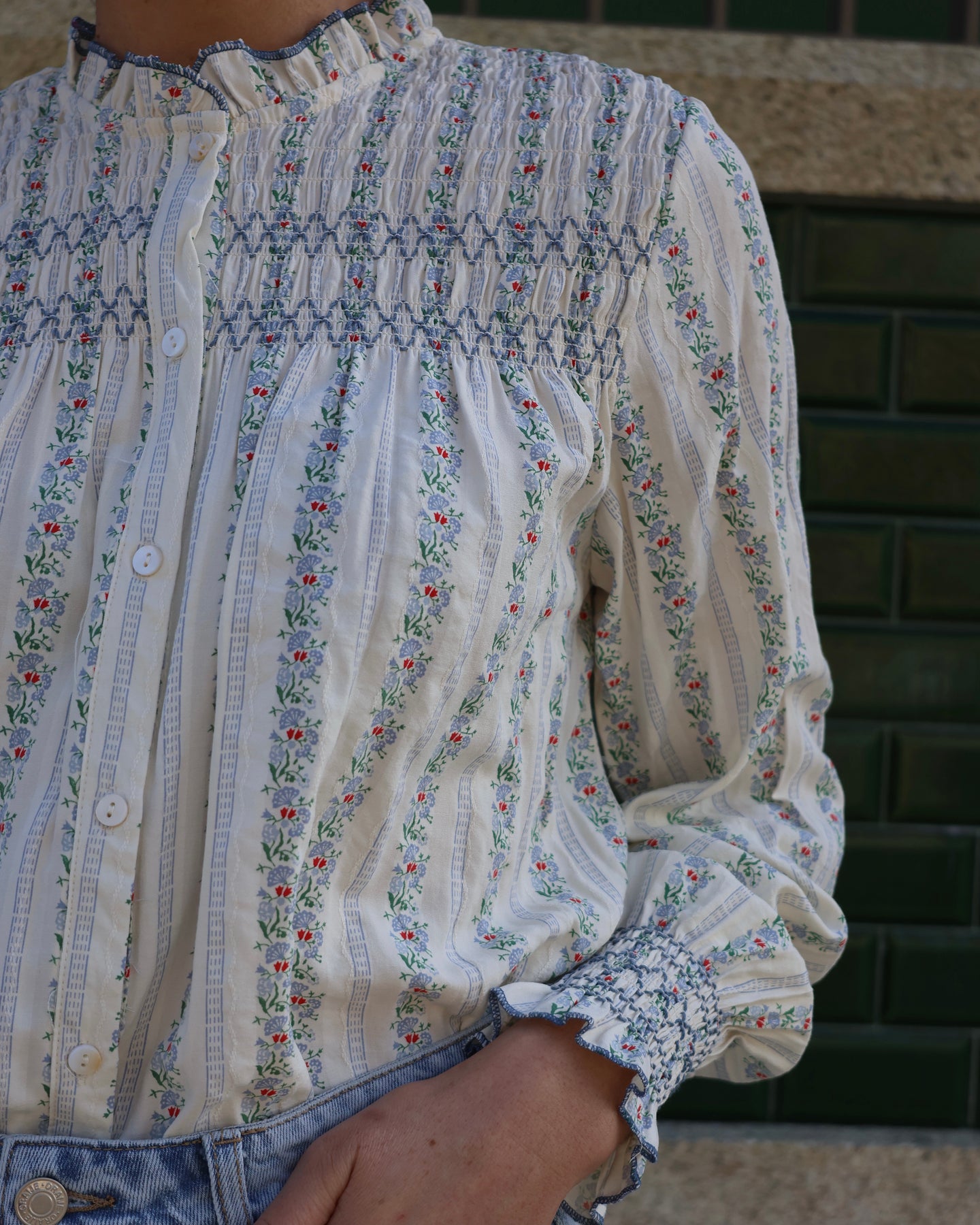 Blusa em manga comprida com padrão floral, efeito franzido no punho e parte de cima. Coleção Primavera 2026.