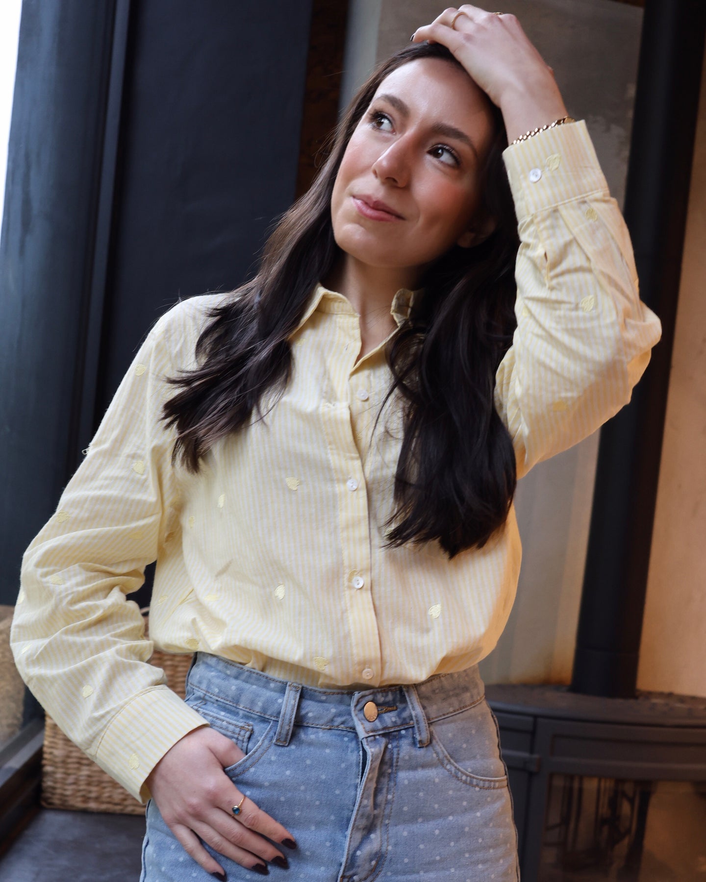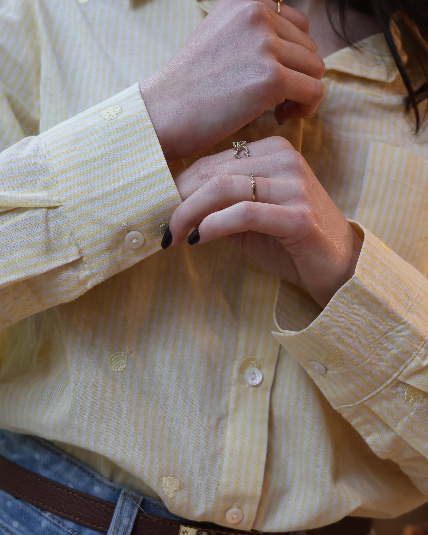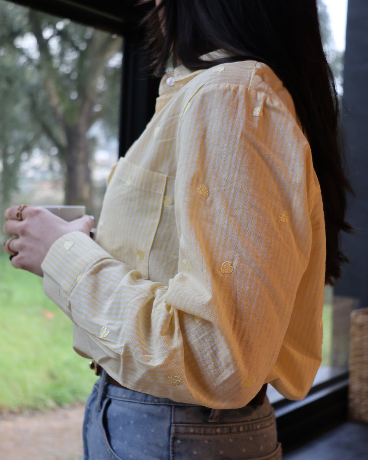 Camisa de manga comprida, em algodão, com listas brancas e corações amarelos bordados. Coleção Primavera 2026.