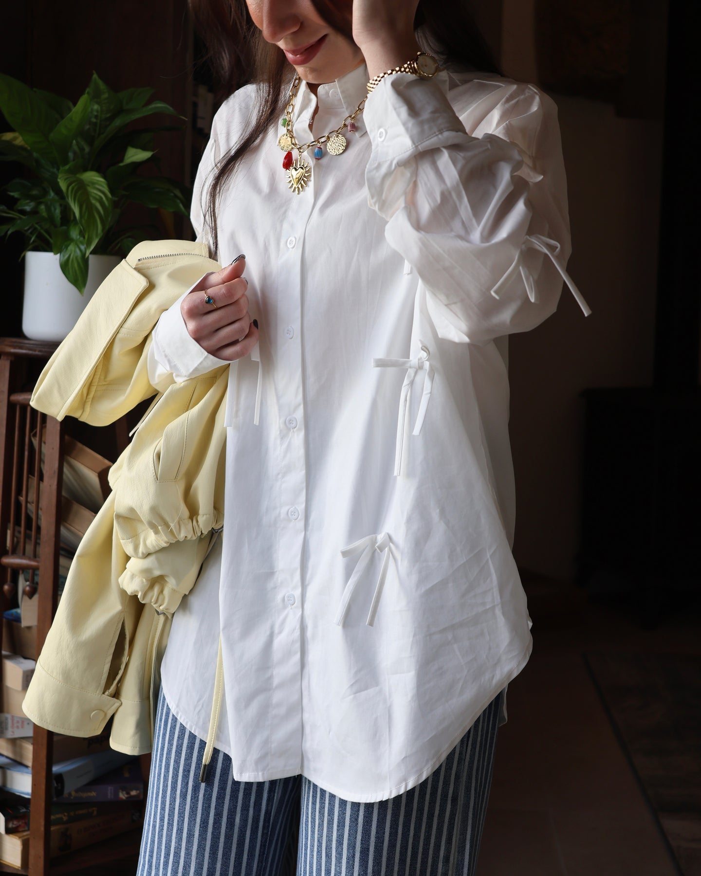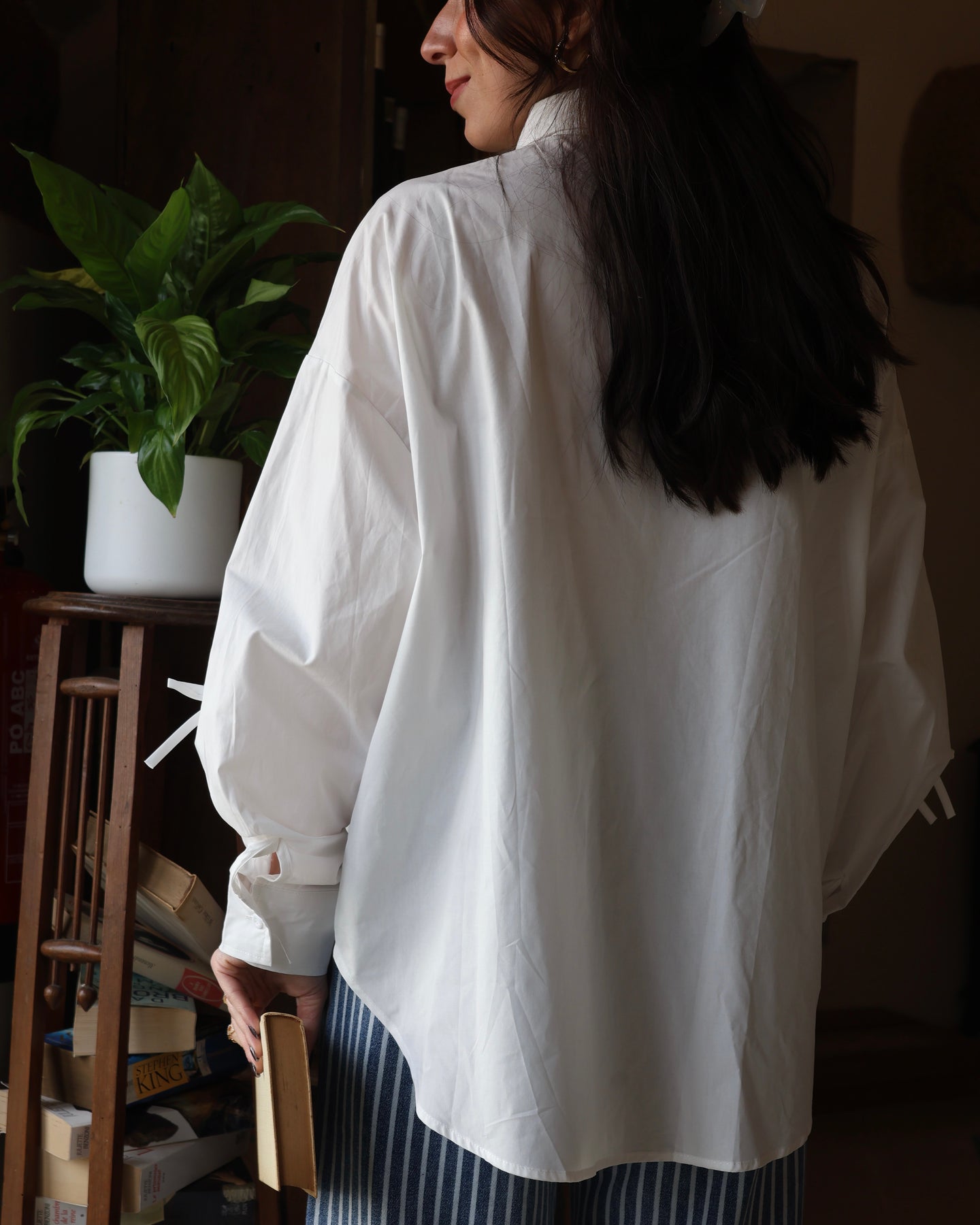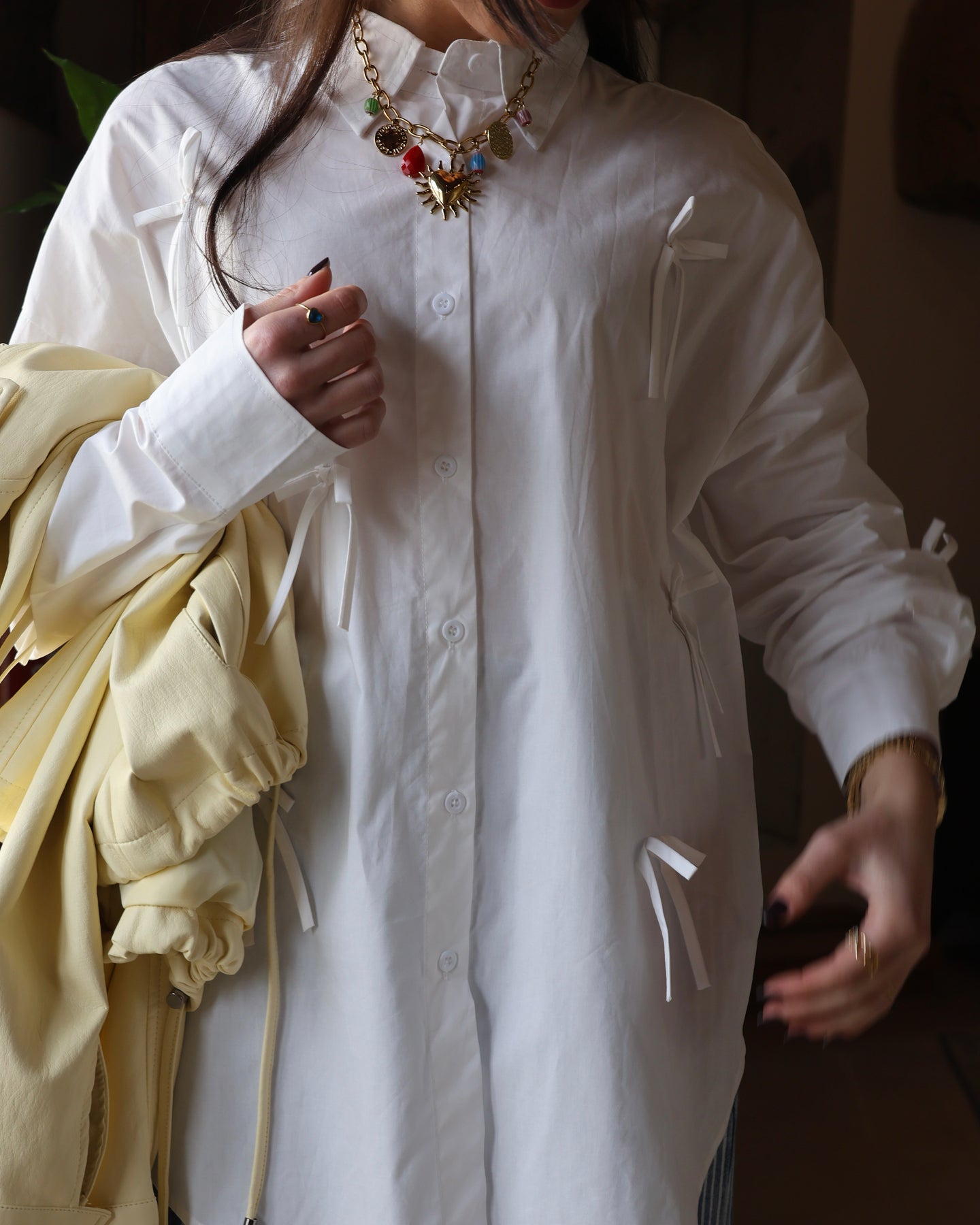 Camisa de manga comprida, em algodão, com aplicações laços e corte oversize. Coleção Primavera 2026.