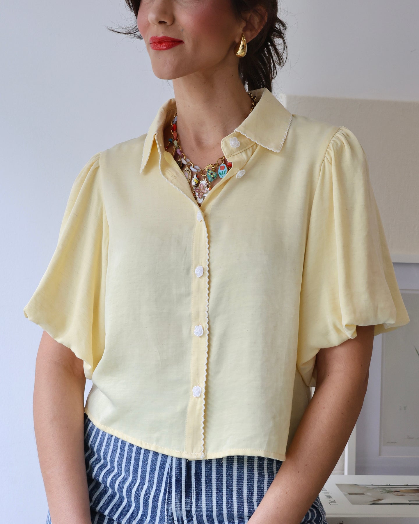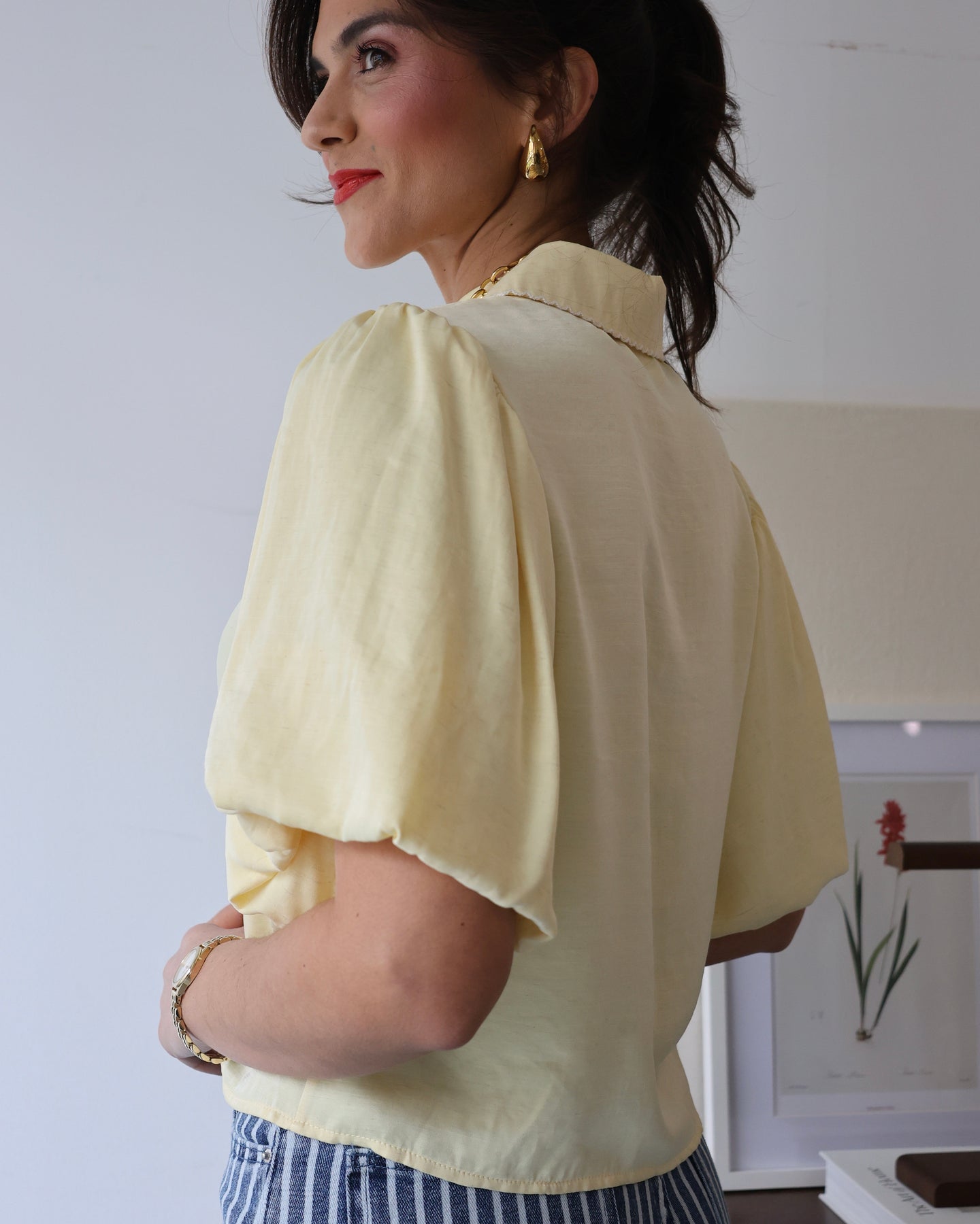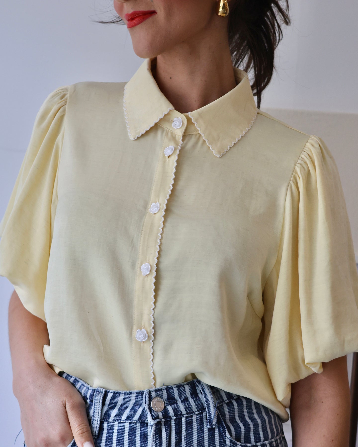 Camisa em manga curta balão, tecido acetinado, botões em formato flor. Coleção Primavera 2026.