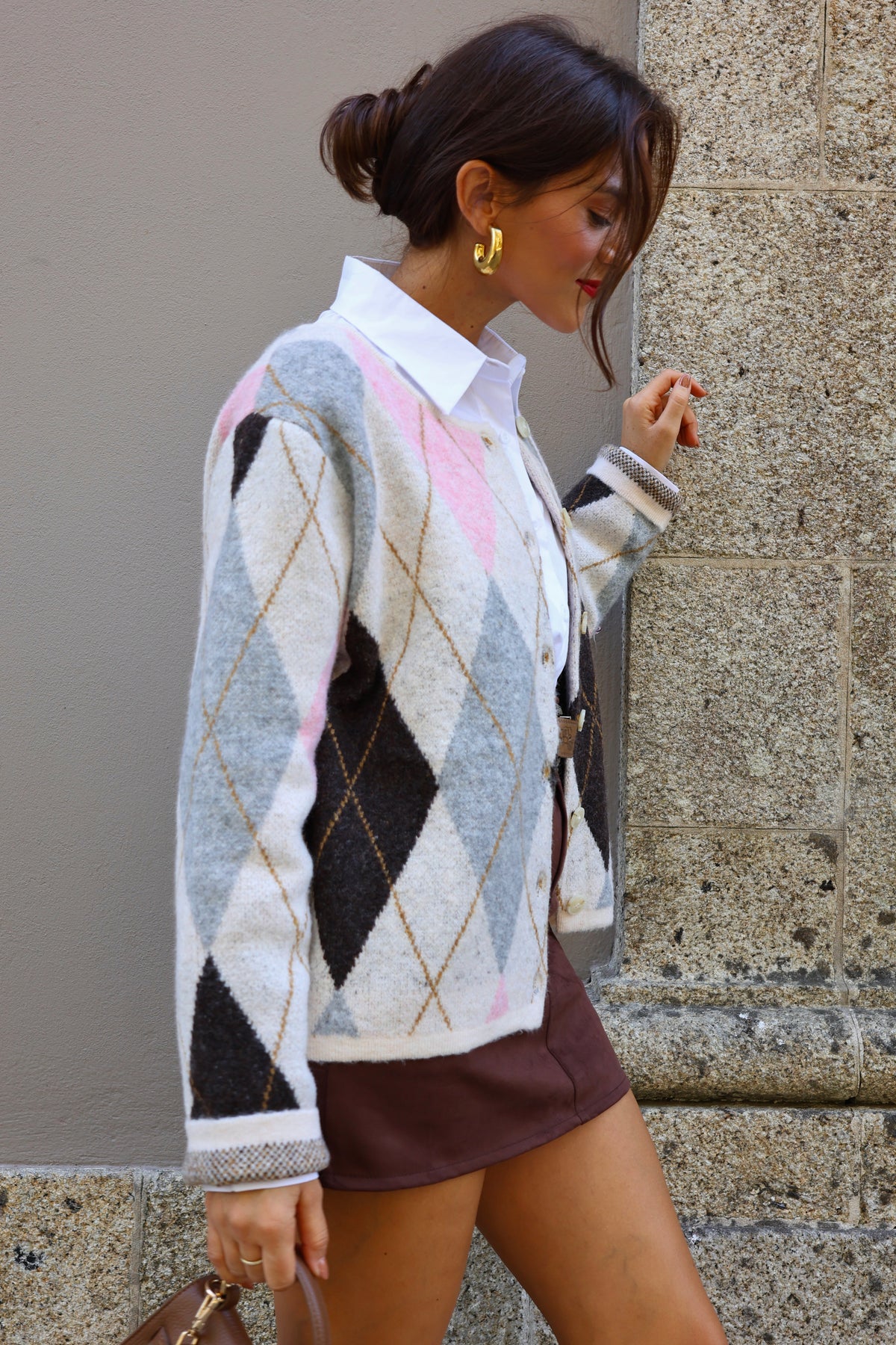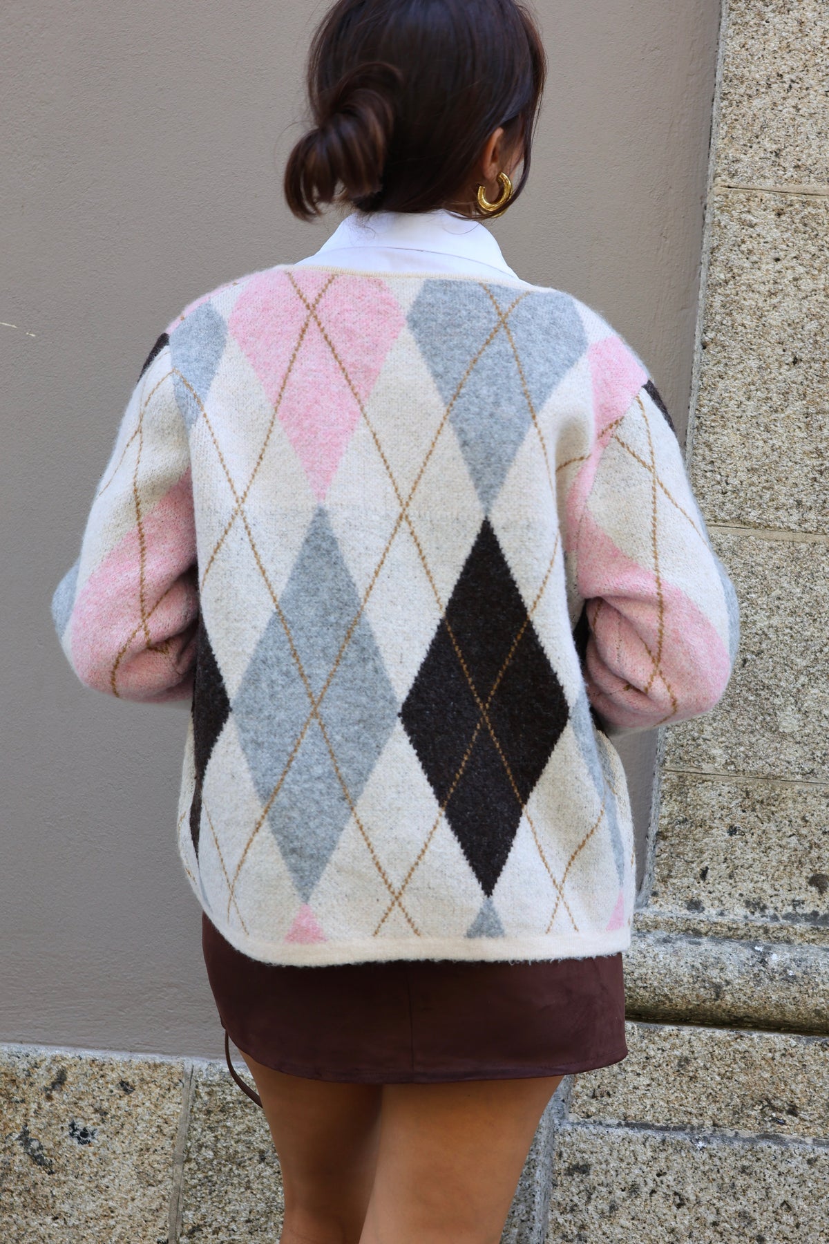 Casaco losango manga comprida com gola redonda e malha macia, composto por lã, Fall-Winter 2025.