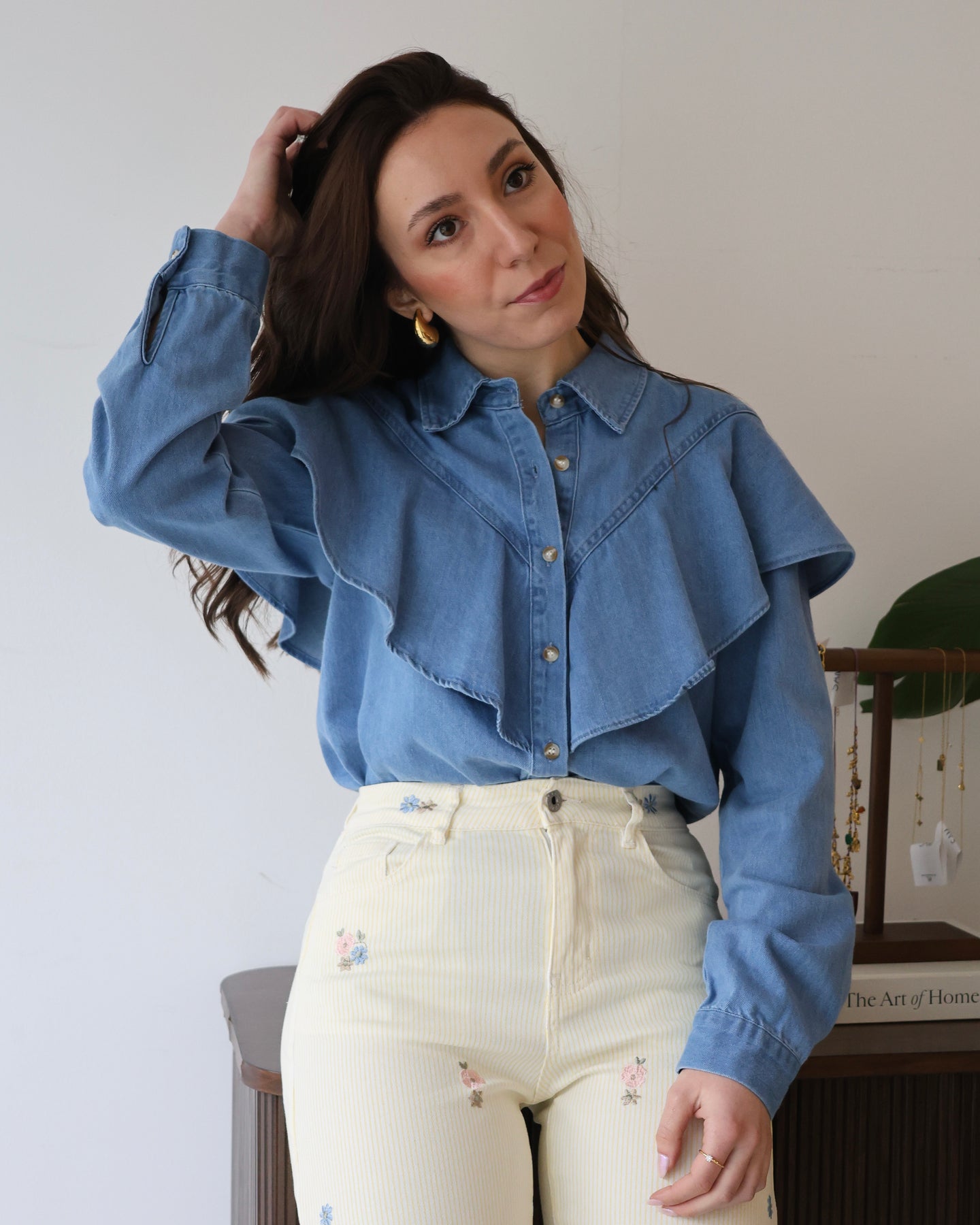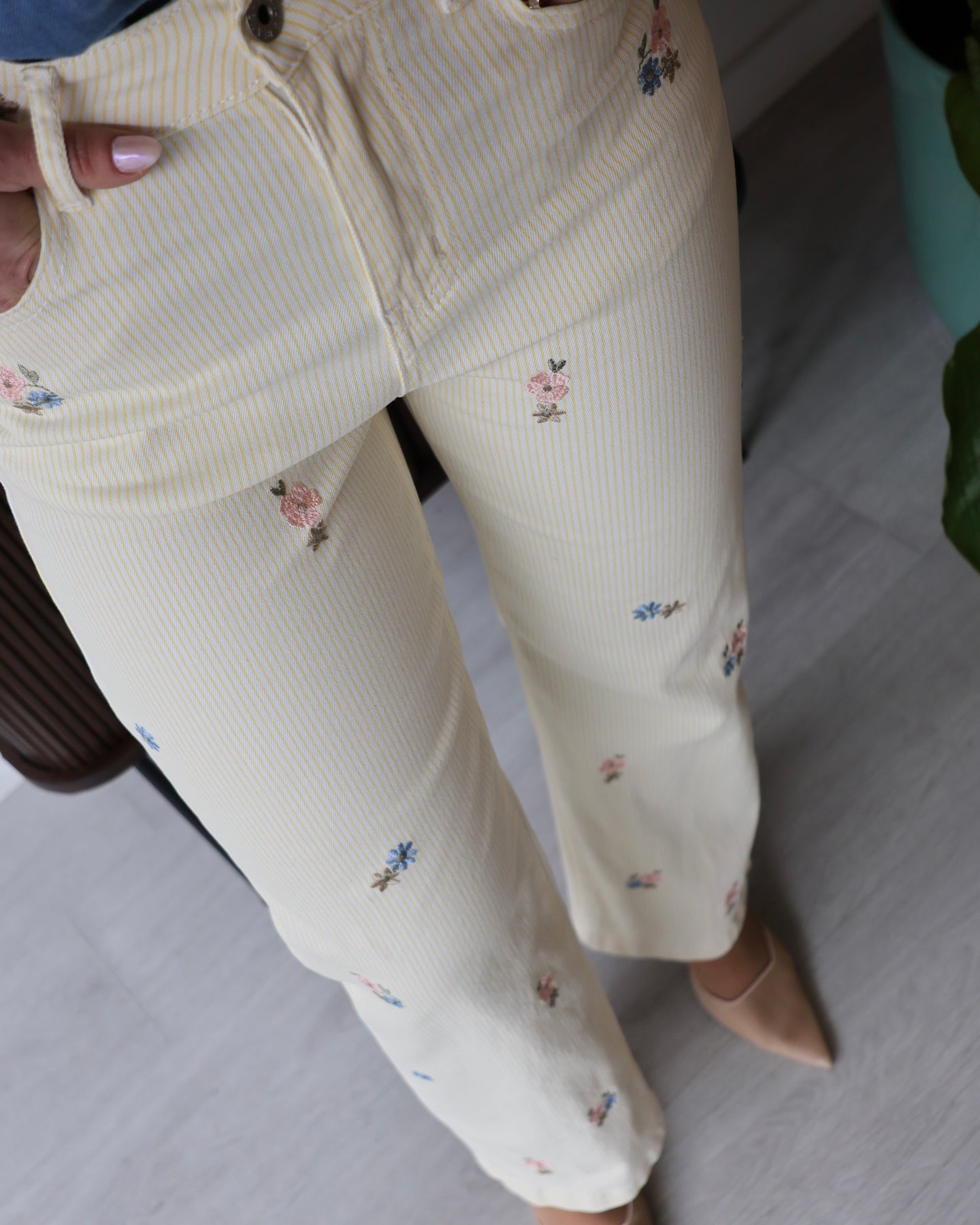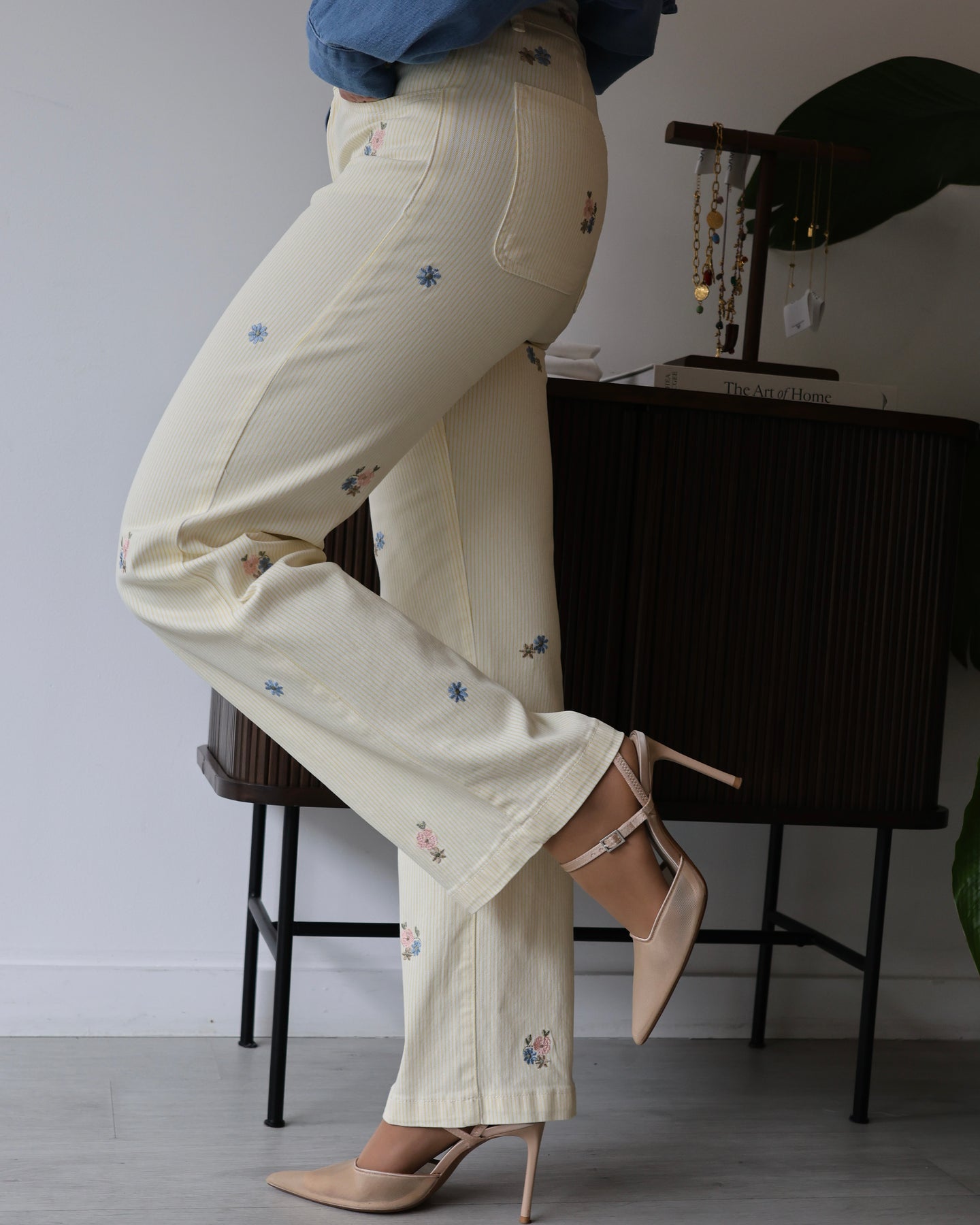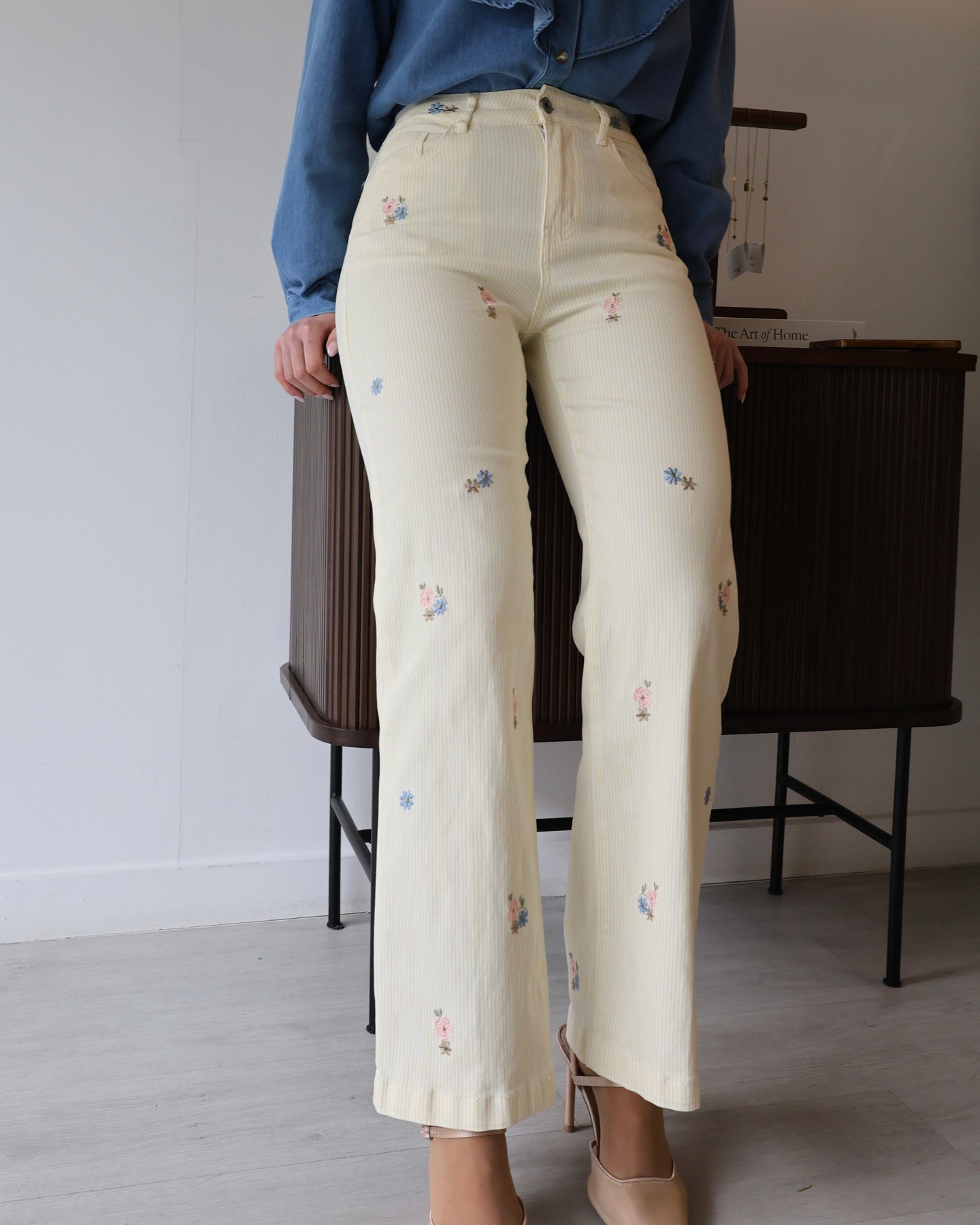 Jeans em ganga com listas amarelas e flores bordadas, corte a direito, cintura subida.  Coleção Primavera 2026.