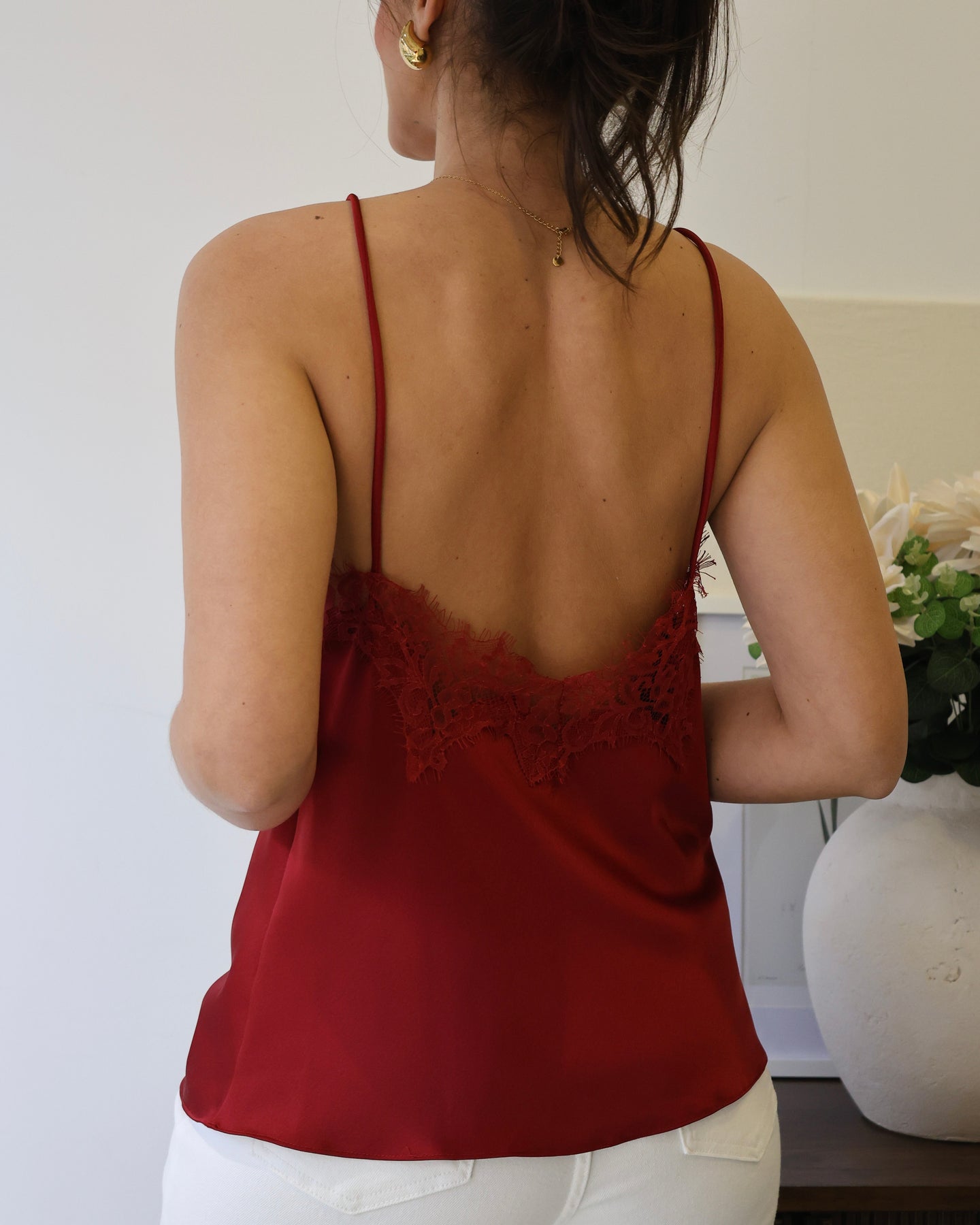 Top cetim em alças, com detalhes em renda. Coleção Primavera 2026.