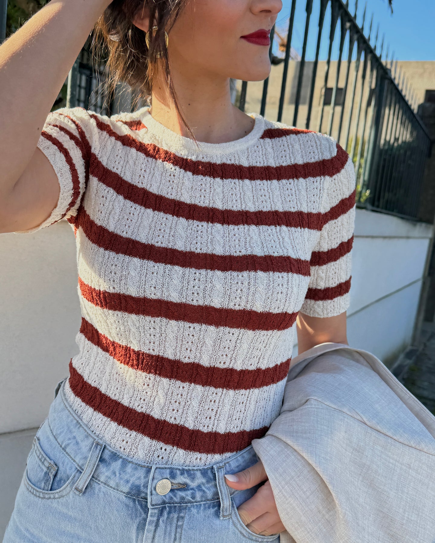 Top em malha tricotada, com listas castanhas, em manga curta. Coleção Primavera 2026.