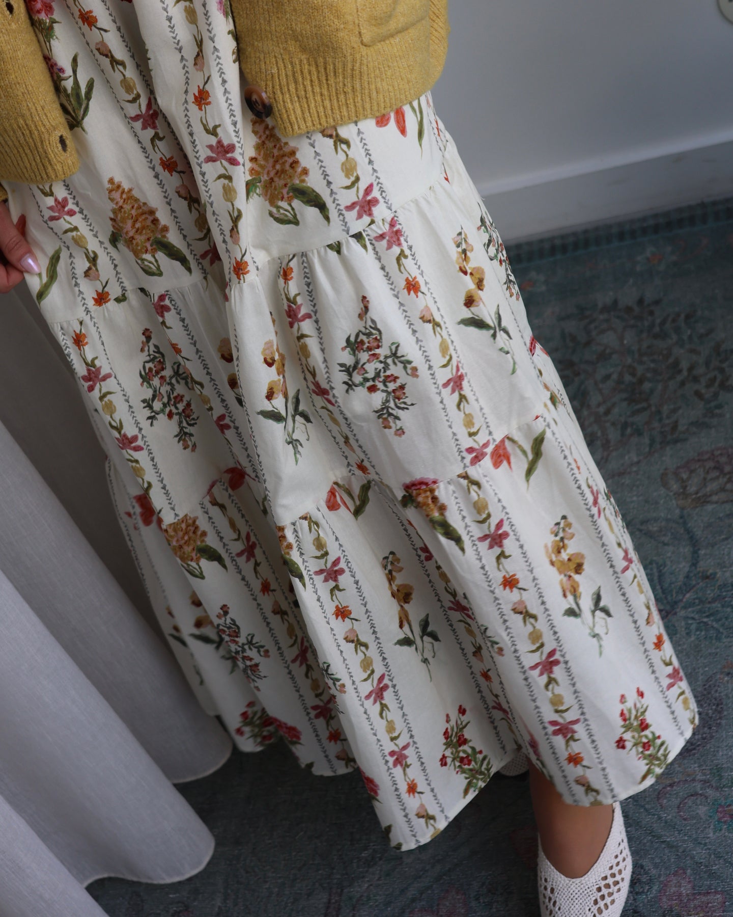 Vestido midi de alças, decote em V, padrão floral, tecido leve e fluído. Coleção Primavera 2026.