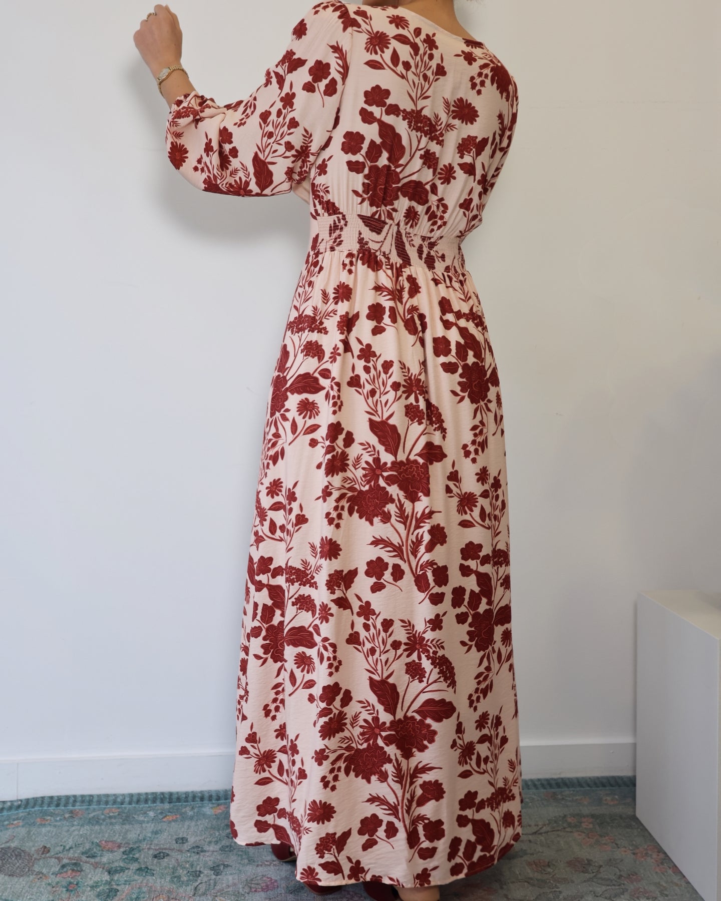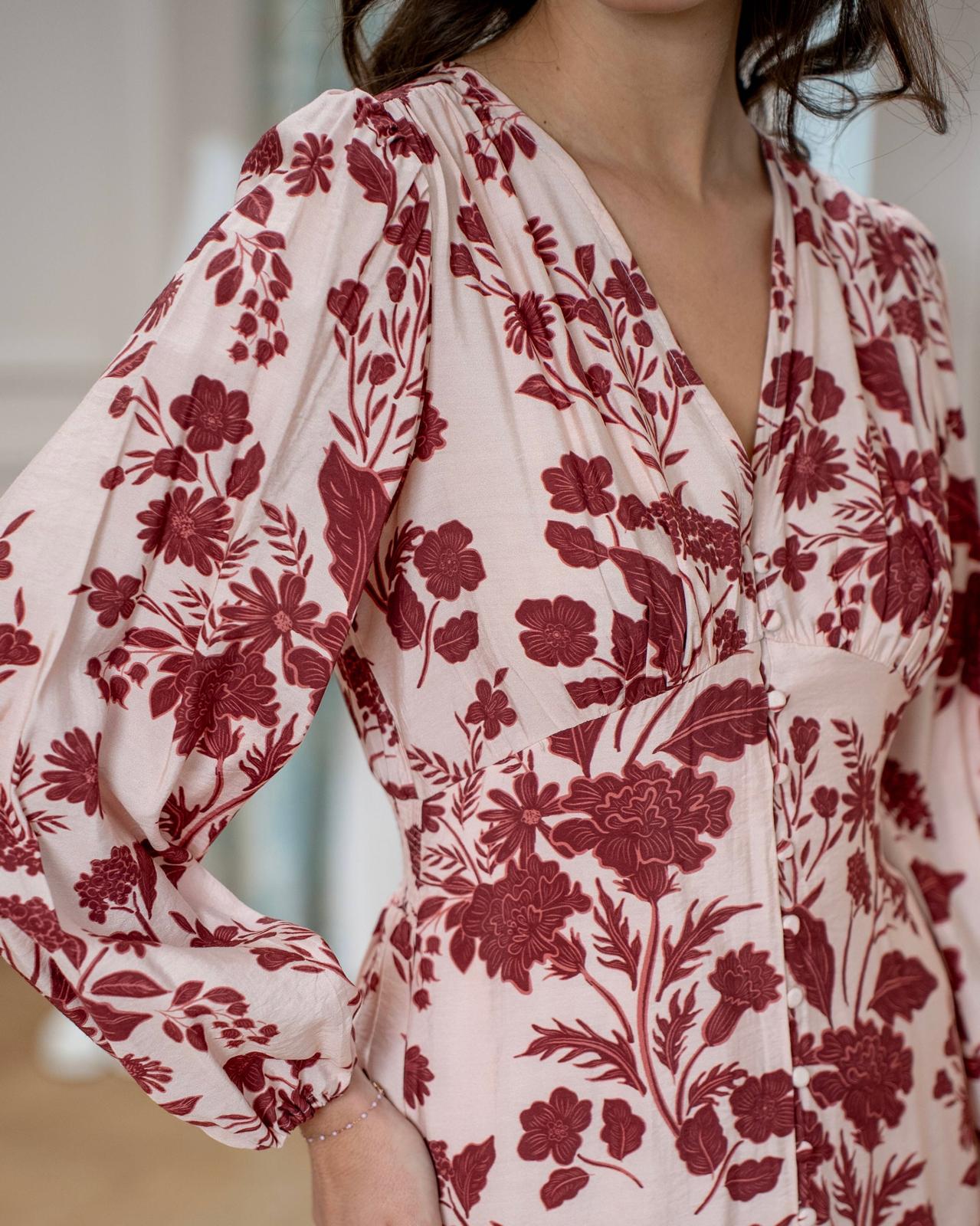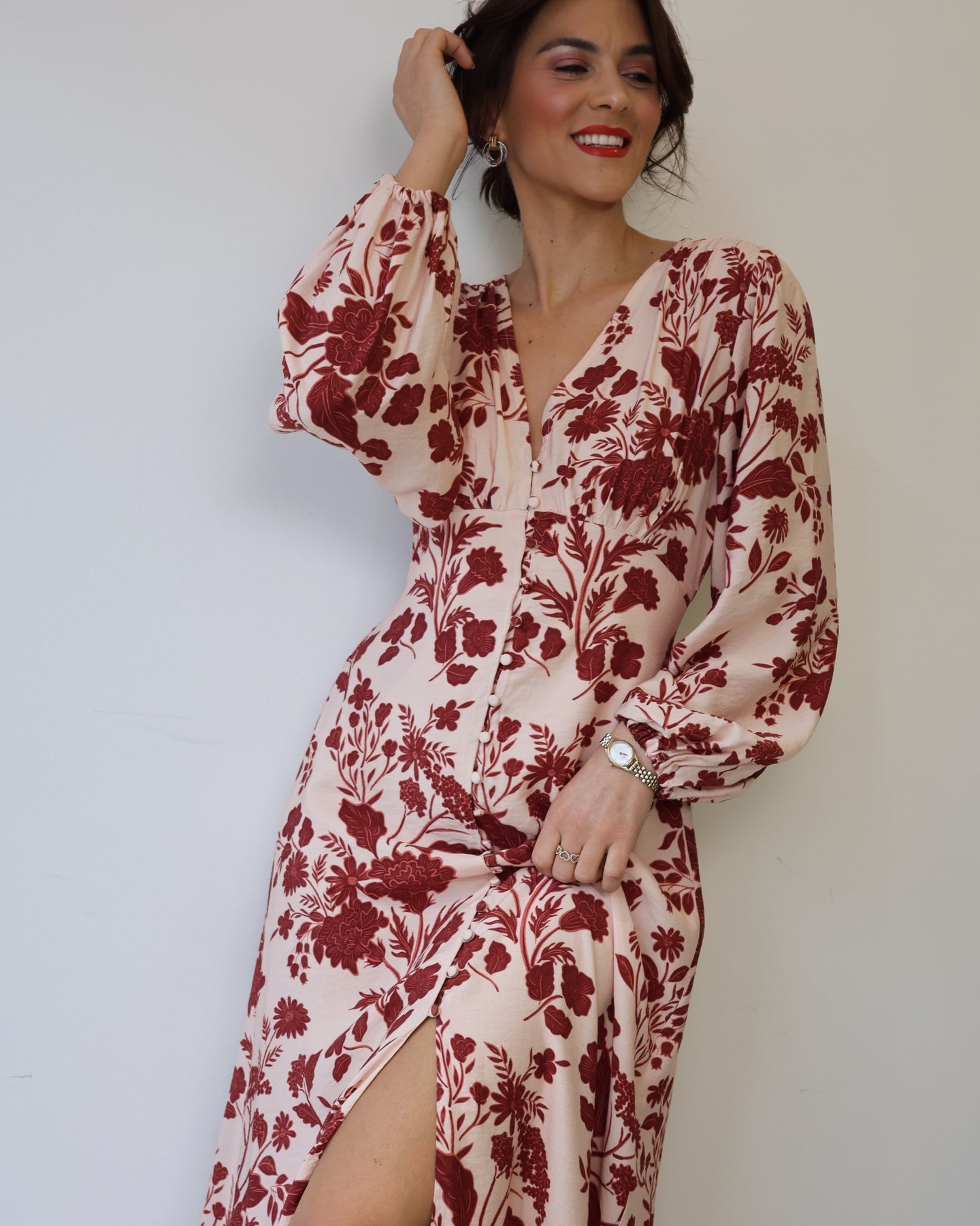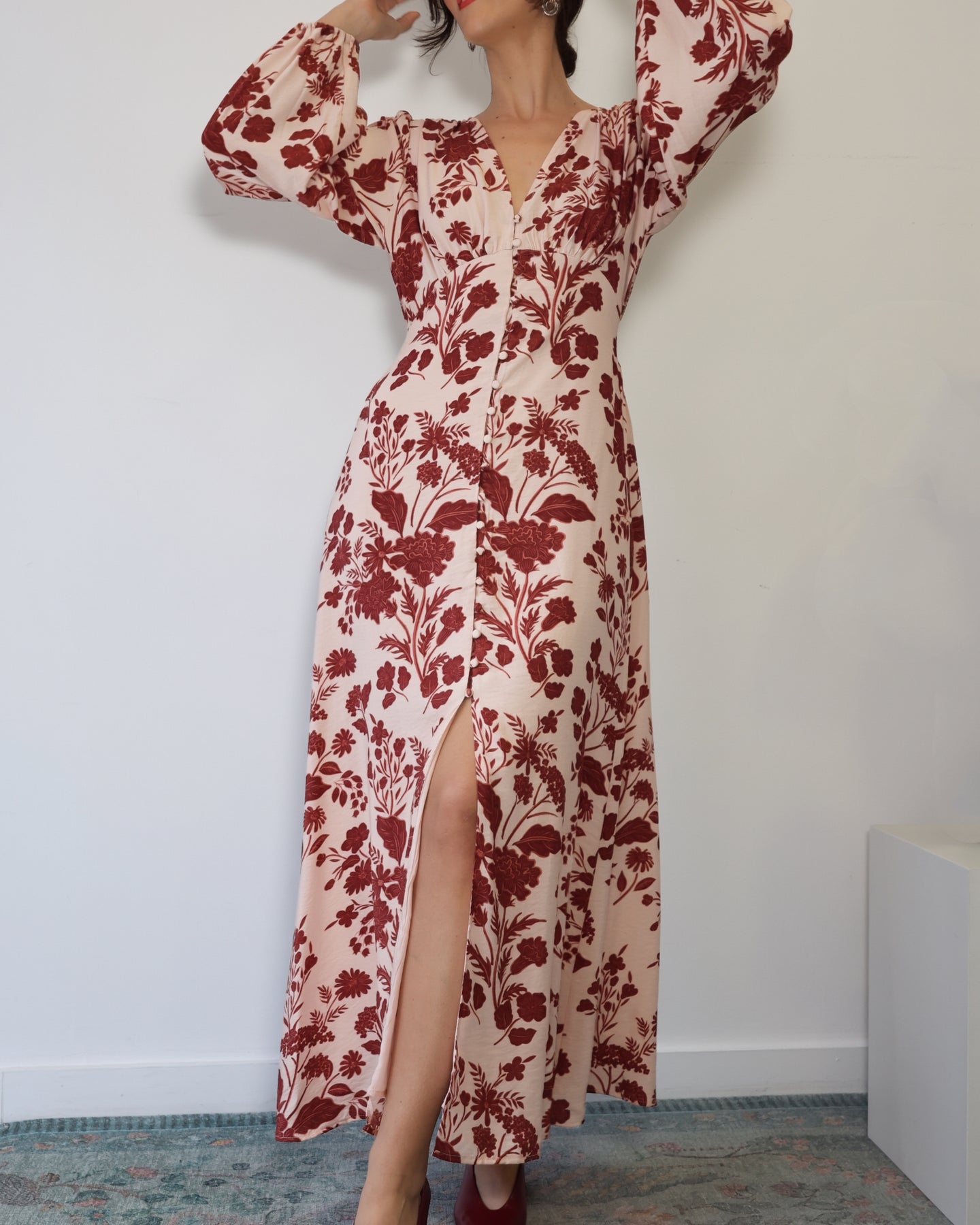 Vestido midi com padrão floral, decote em bico, racha frontal. Coleção Primavera 2026.