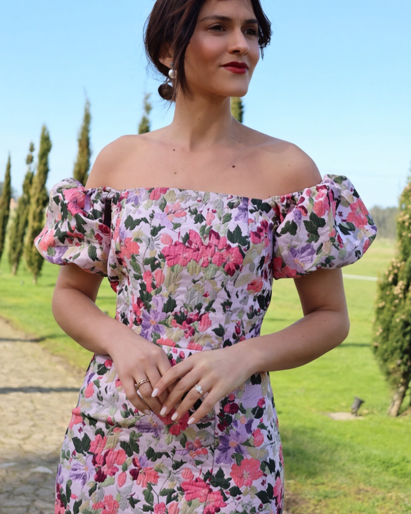 Vestido tecido brocado saia midi a direito, manga balão com elástico no braço, decote quadrado, racha lateral frontal, silhueta clássica com toque feminino.