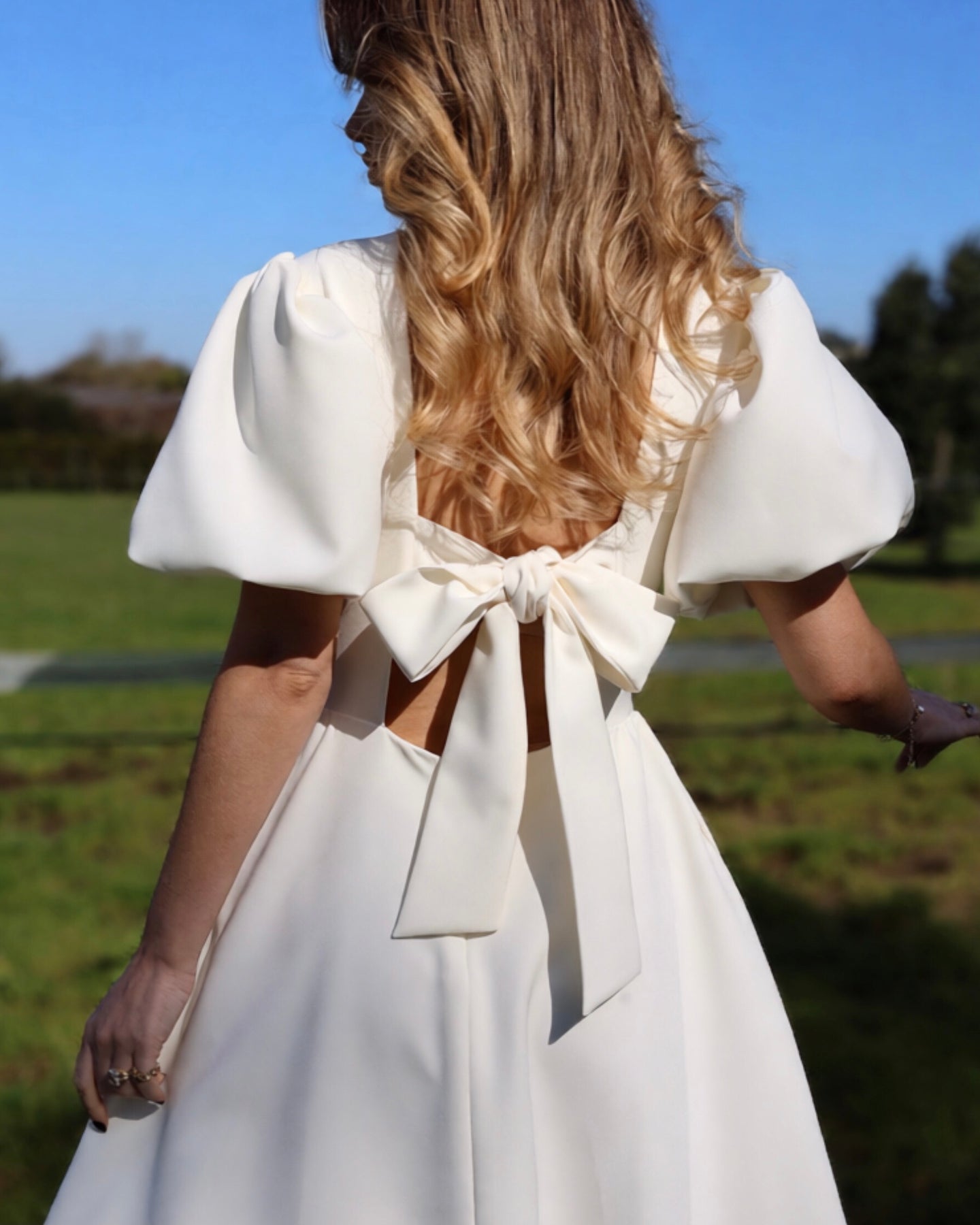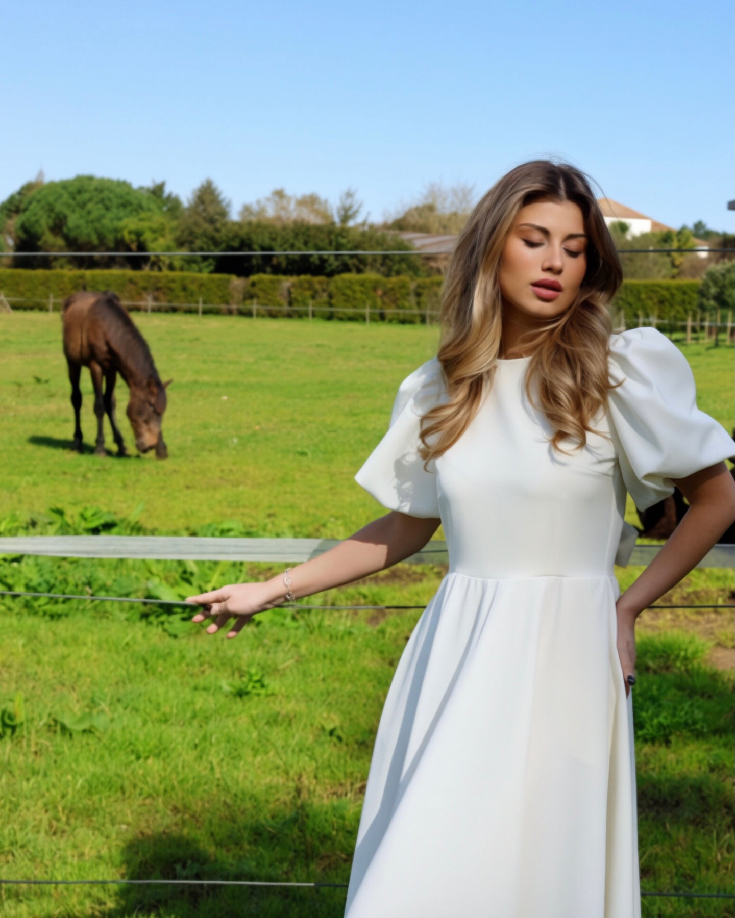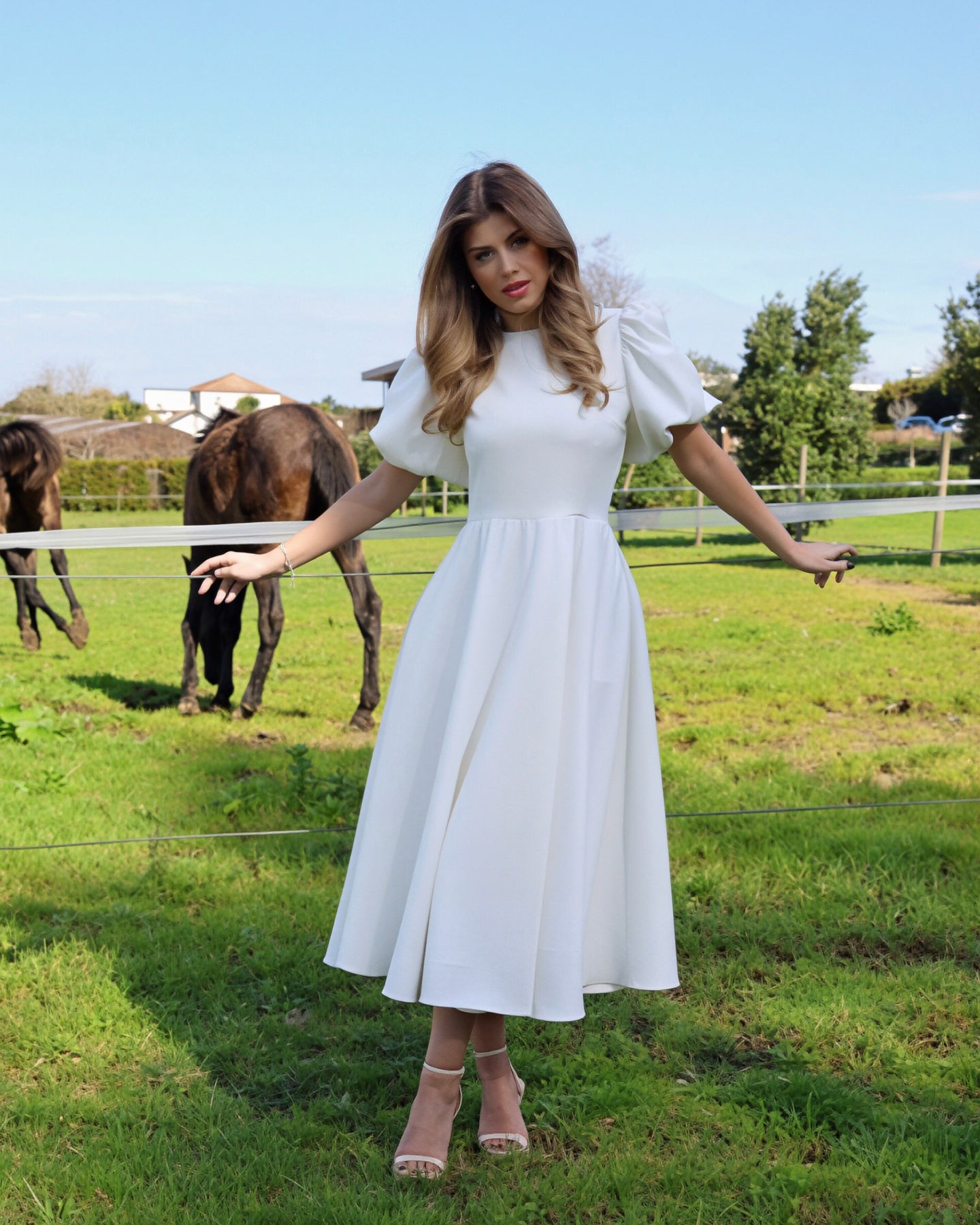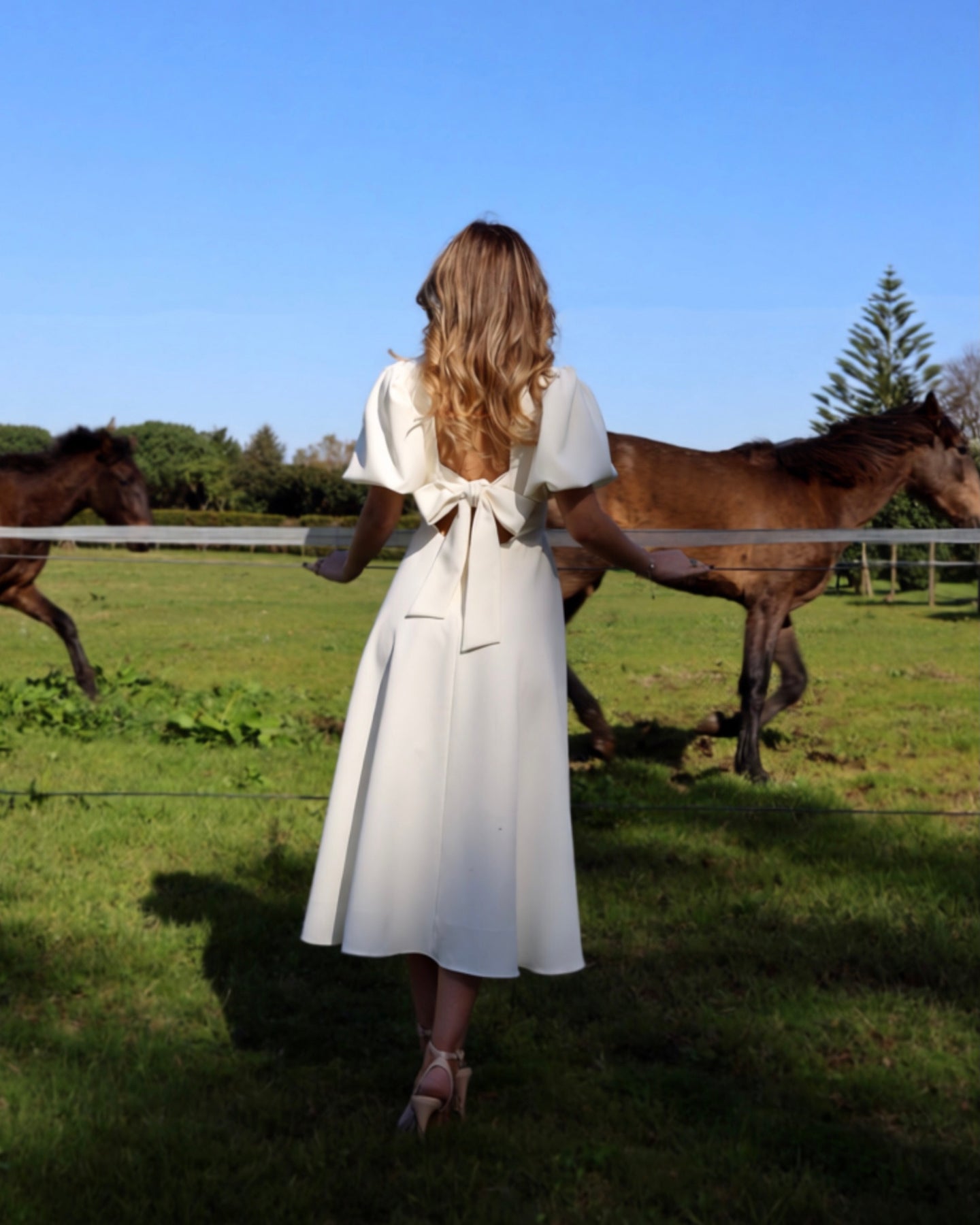 Vestido saia midi efeito evasê com e bolsos laterais, com mangas balão, costas abertas com laço,maravilhoso para festas Batizados e casamentos.