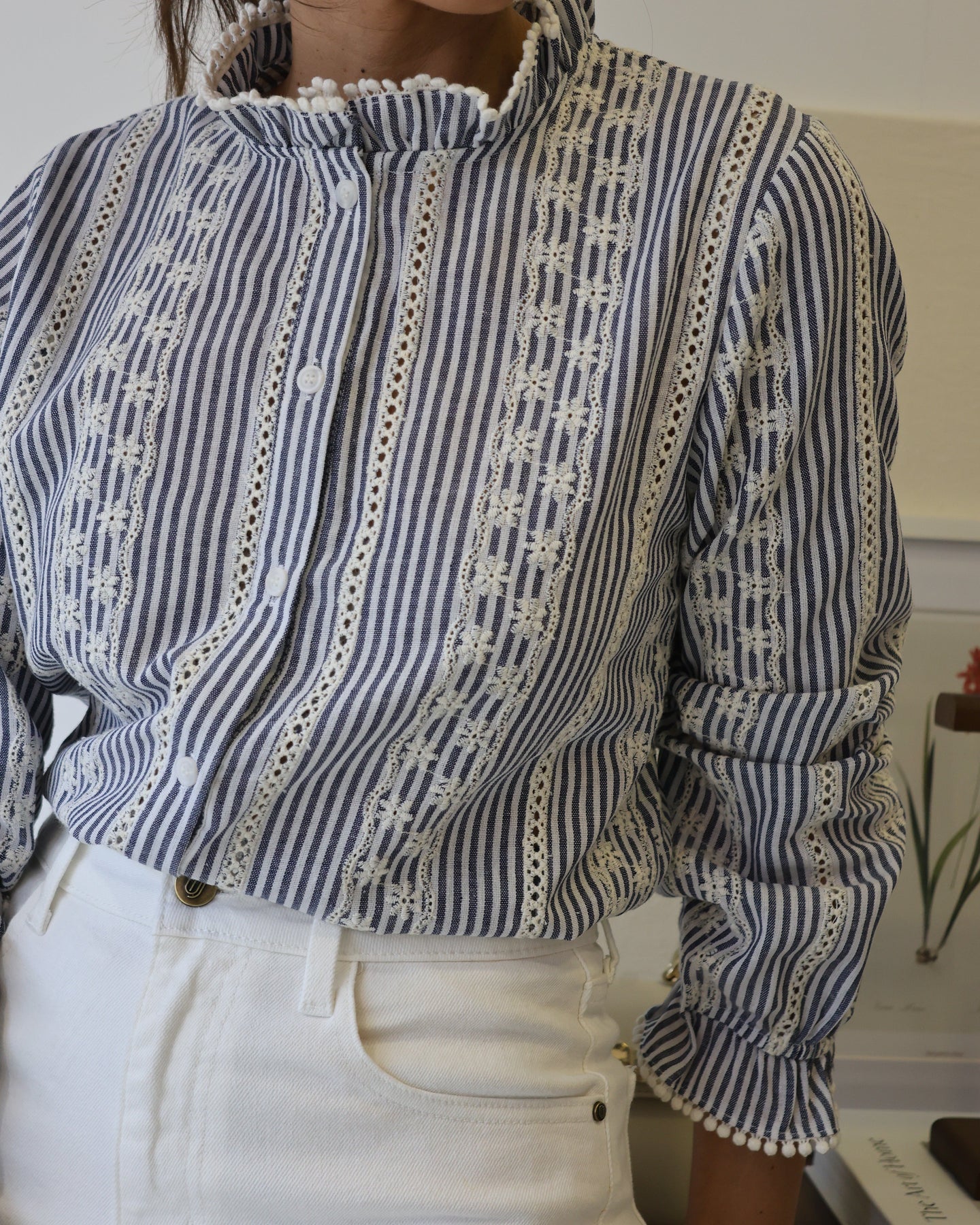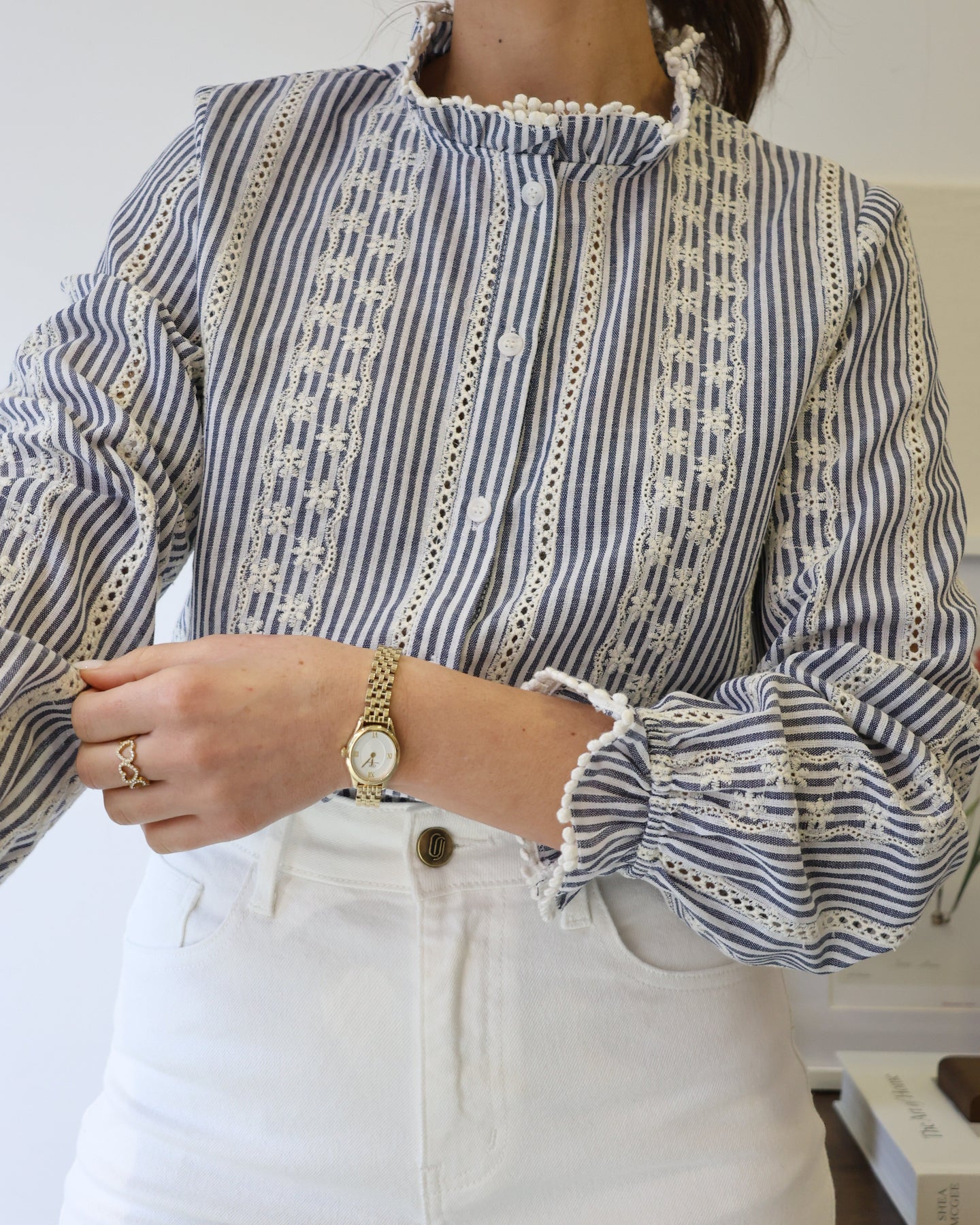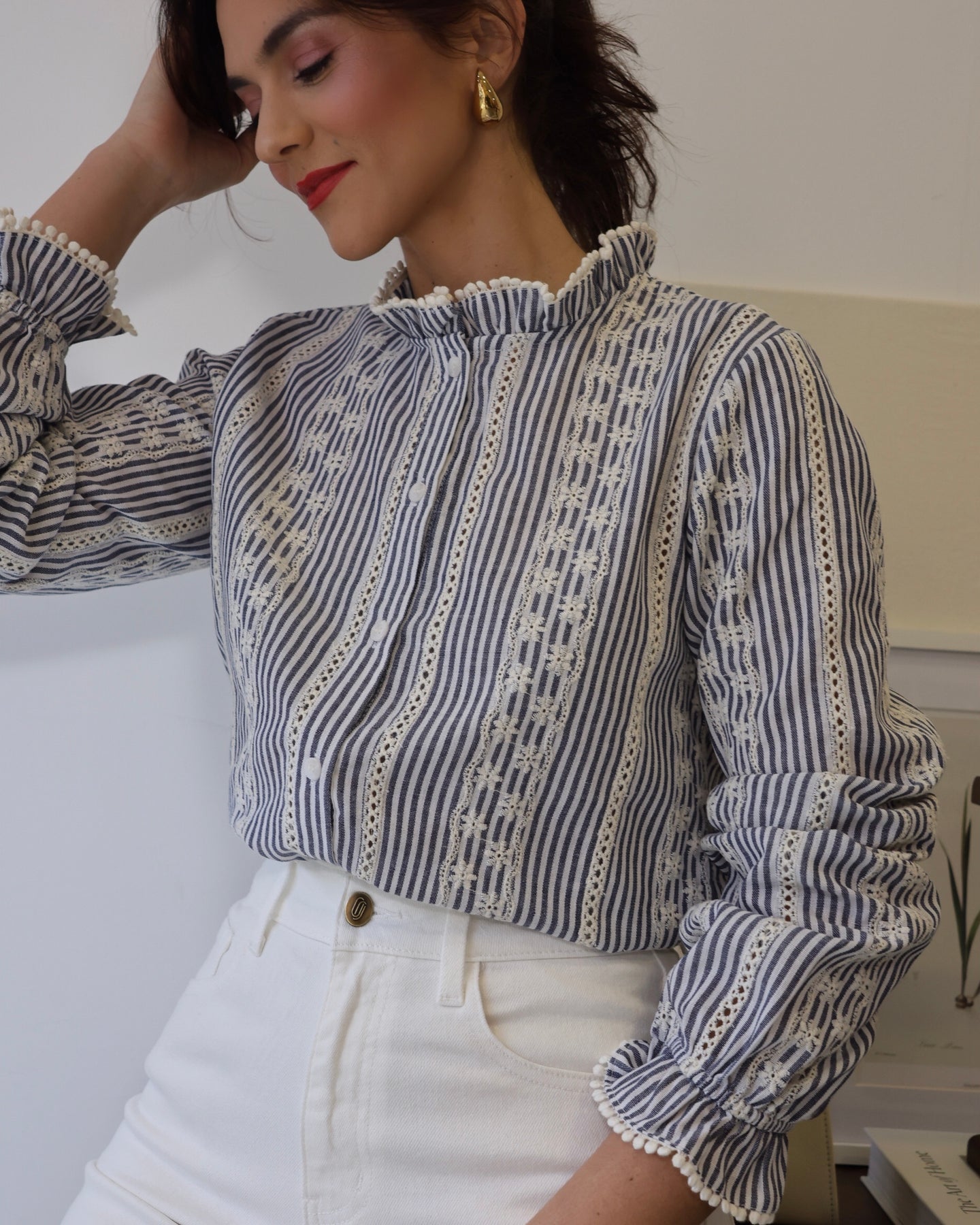 Blusa azul listas e bordados, estilo romântico, gola romântica. Coleção Primavera 2026.