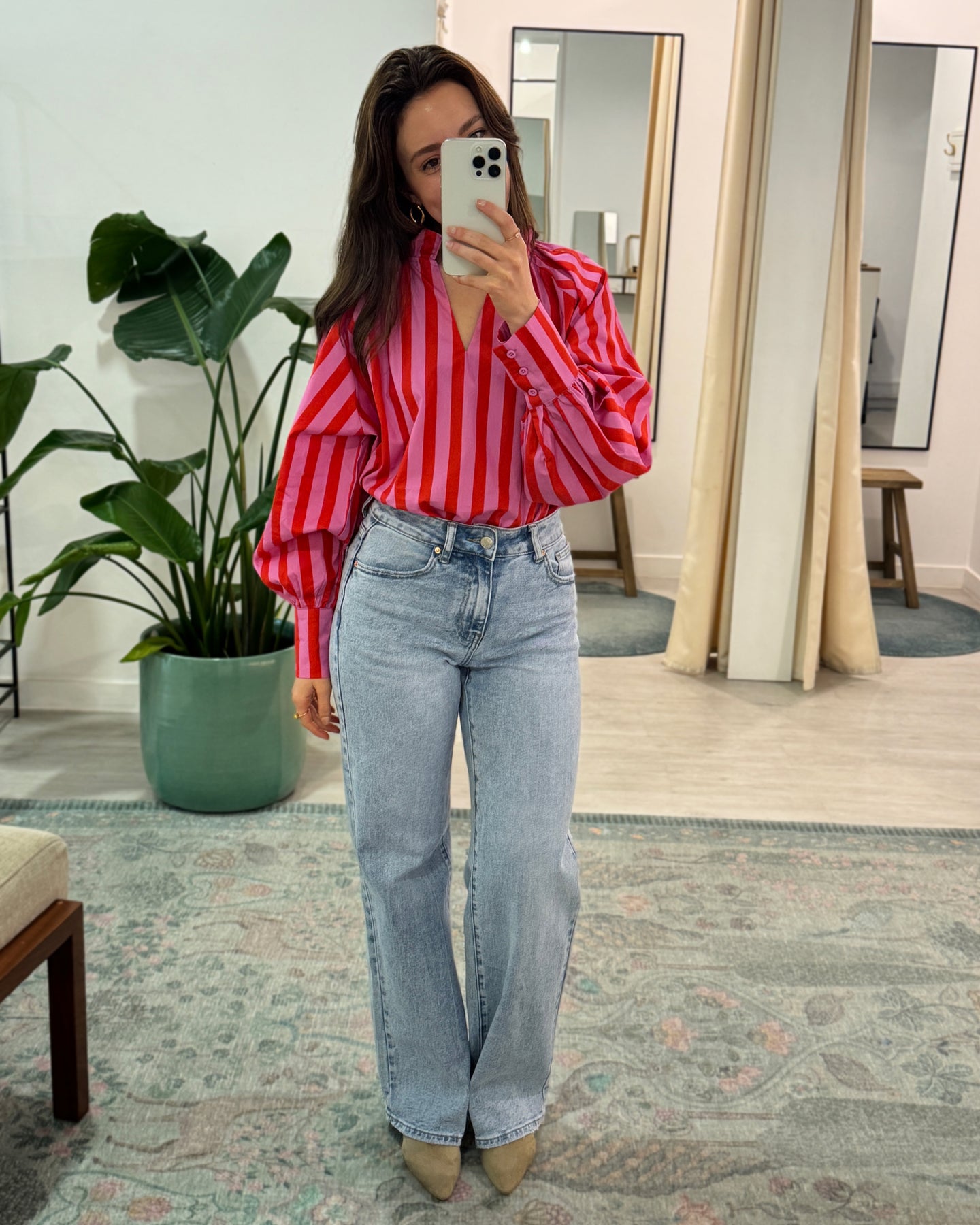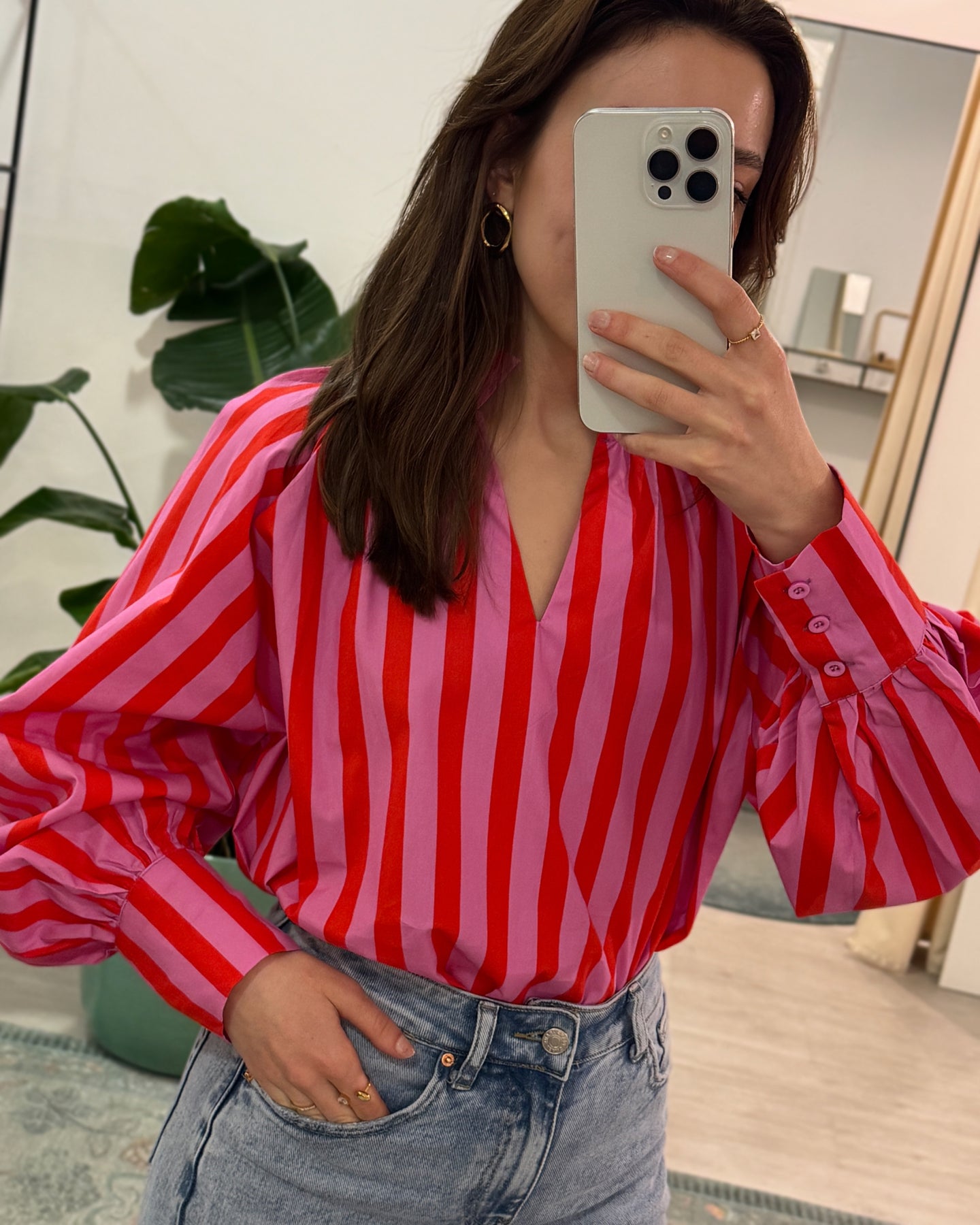 Camisa em algodão, com listas vermelhas e rosa, decote em bico e botões nos punhos. Coleção Primavera 2026.( os jeans são os Aline ver álbum das calças).