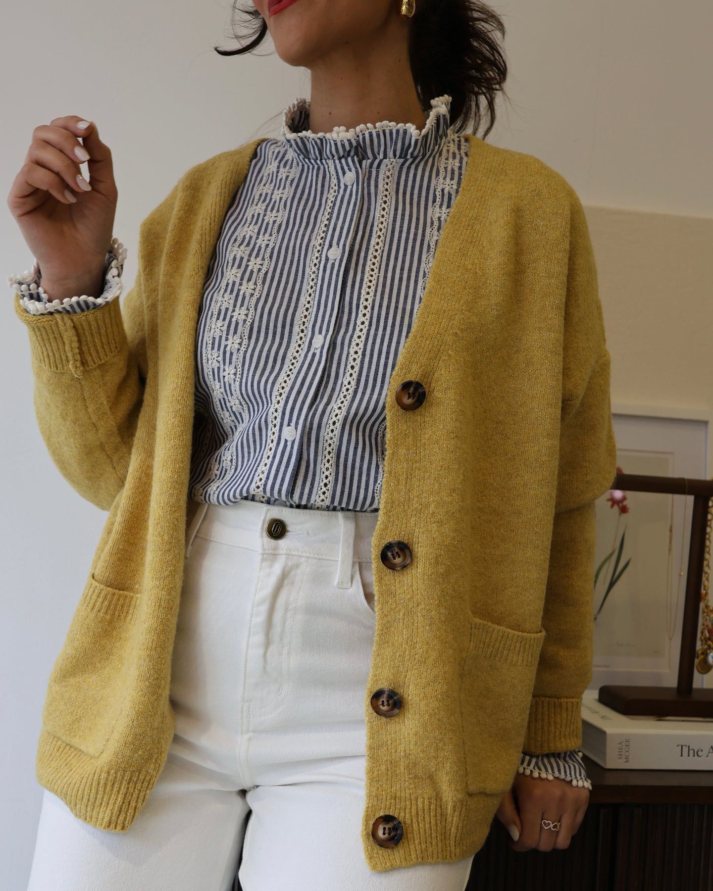 Casaco de manga comprida, composto por lã, decote em bico e bolsos frontais. Coleção Primavera 2026.