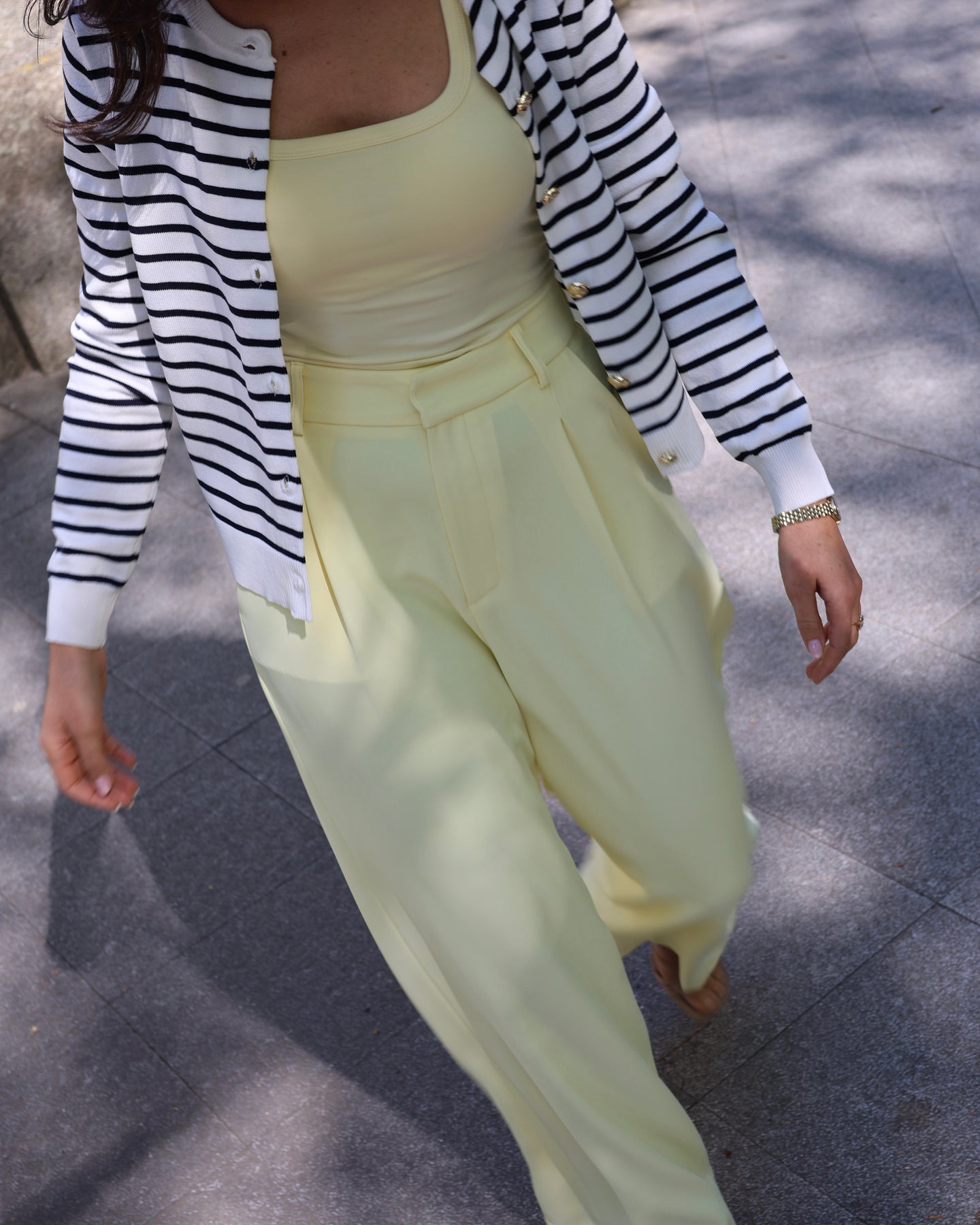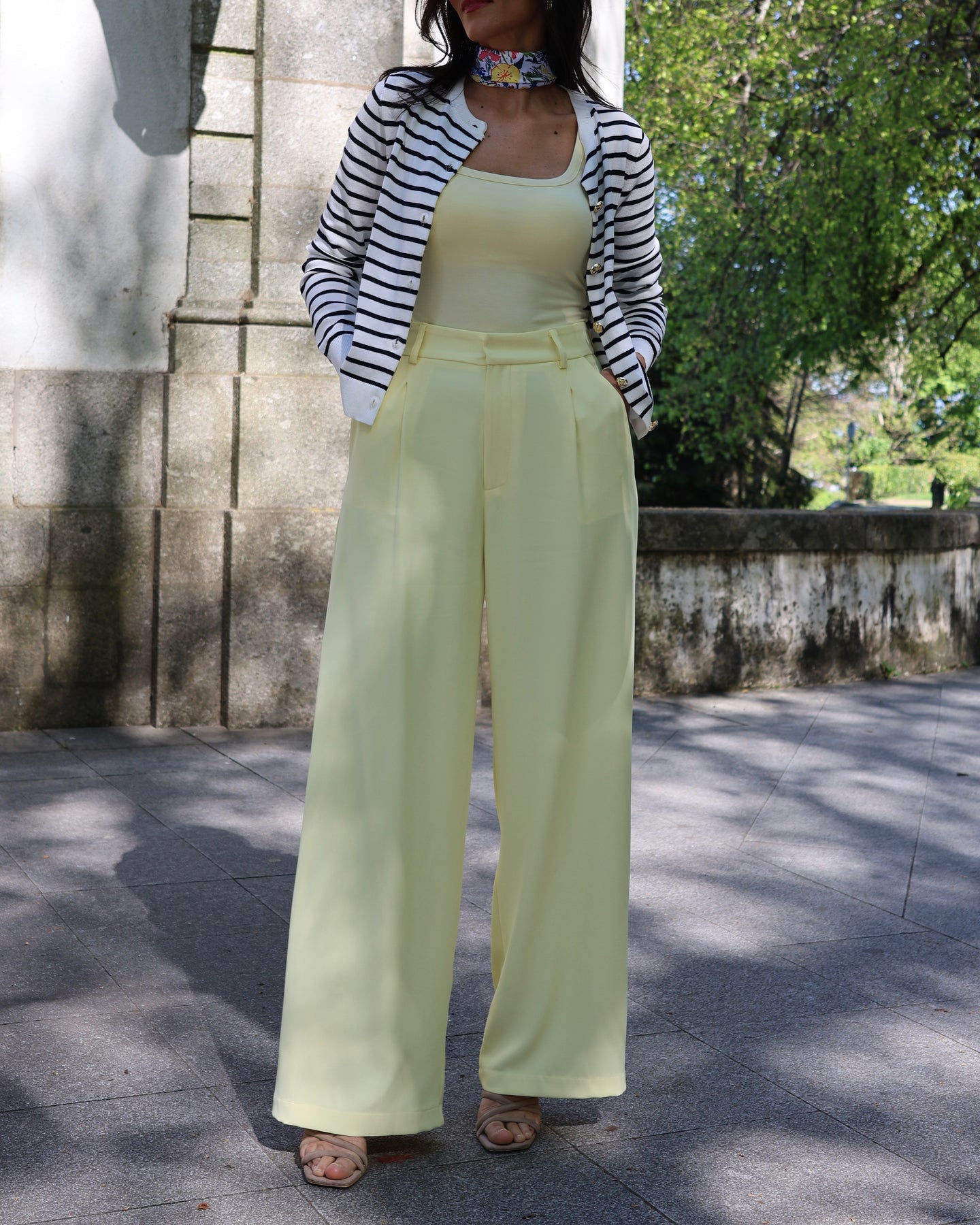 Pantalona de cintura subida, tecido fluído, bolsos laterais, elástico atrás na cintura. Coleção Primavera 2026.