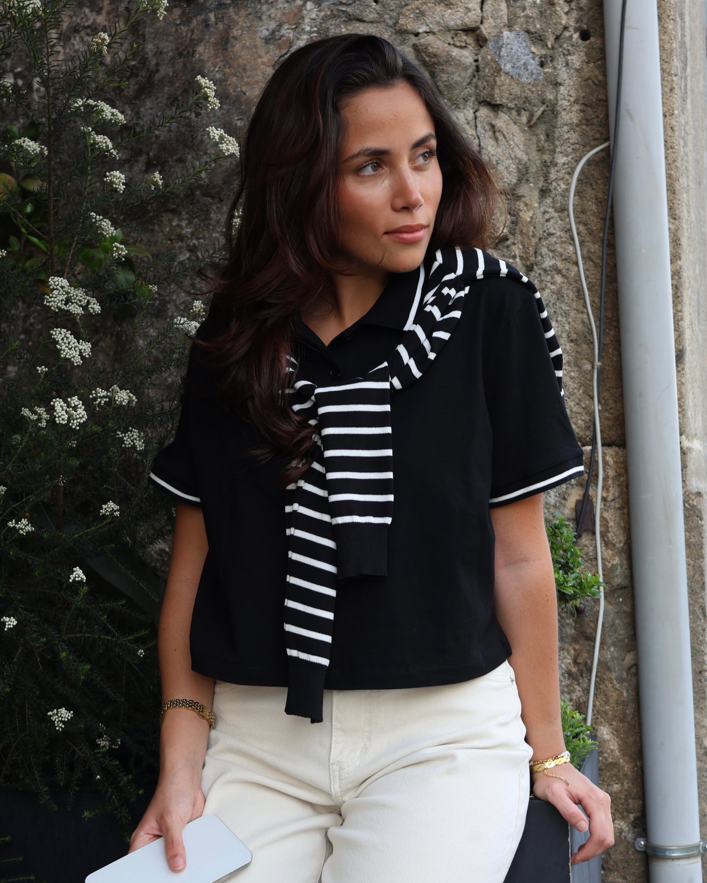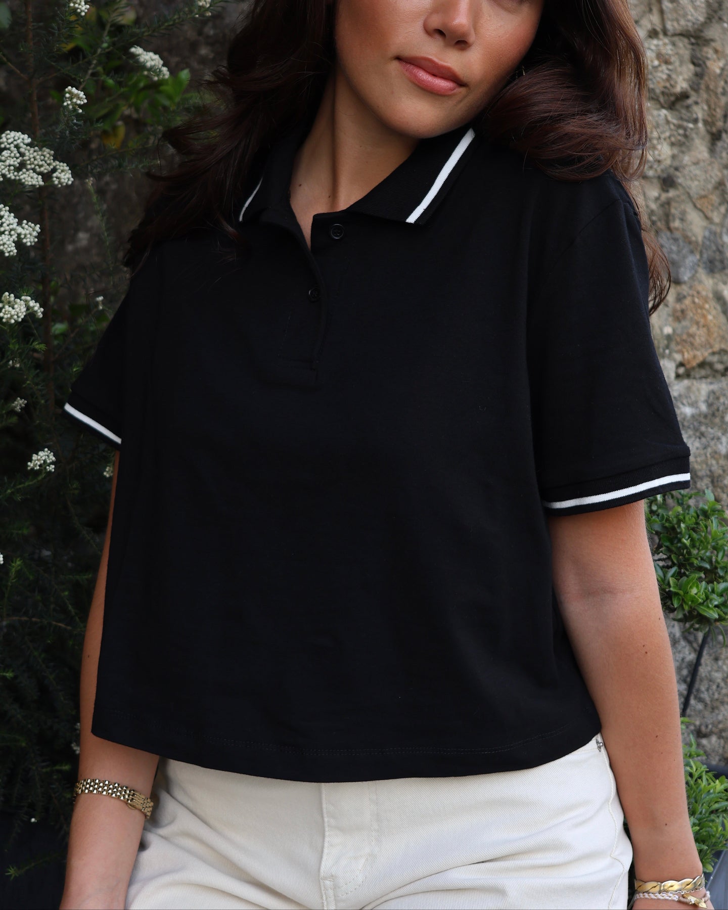 Polo branco com 2 botões. Coleção Primavera 2026.