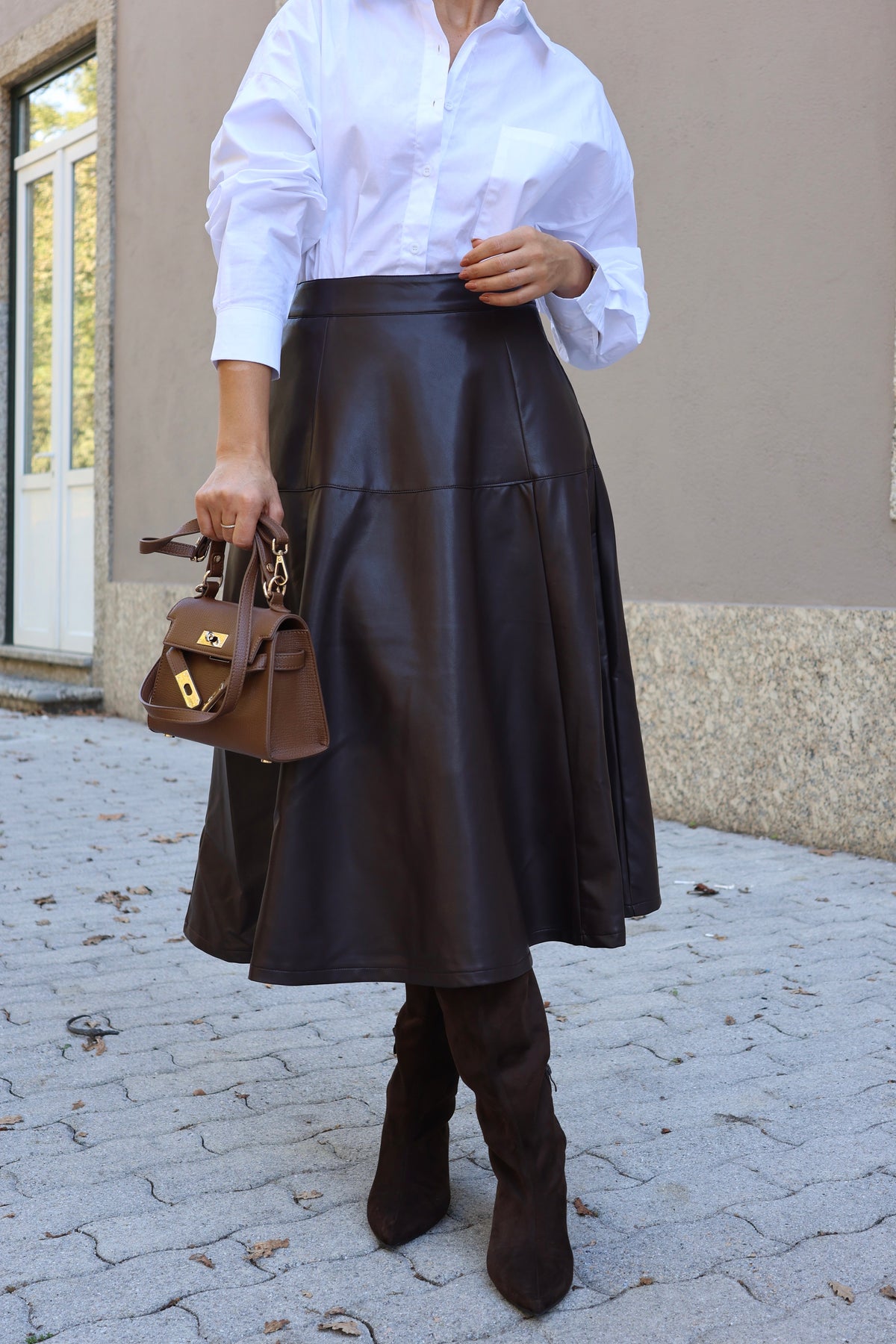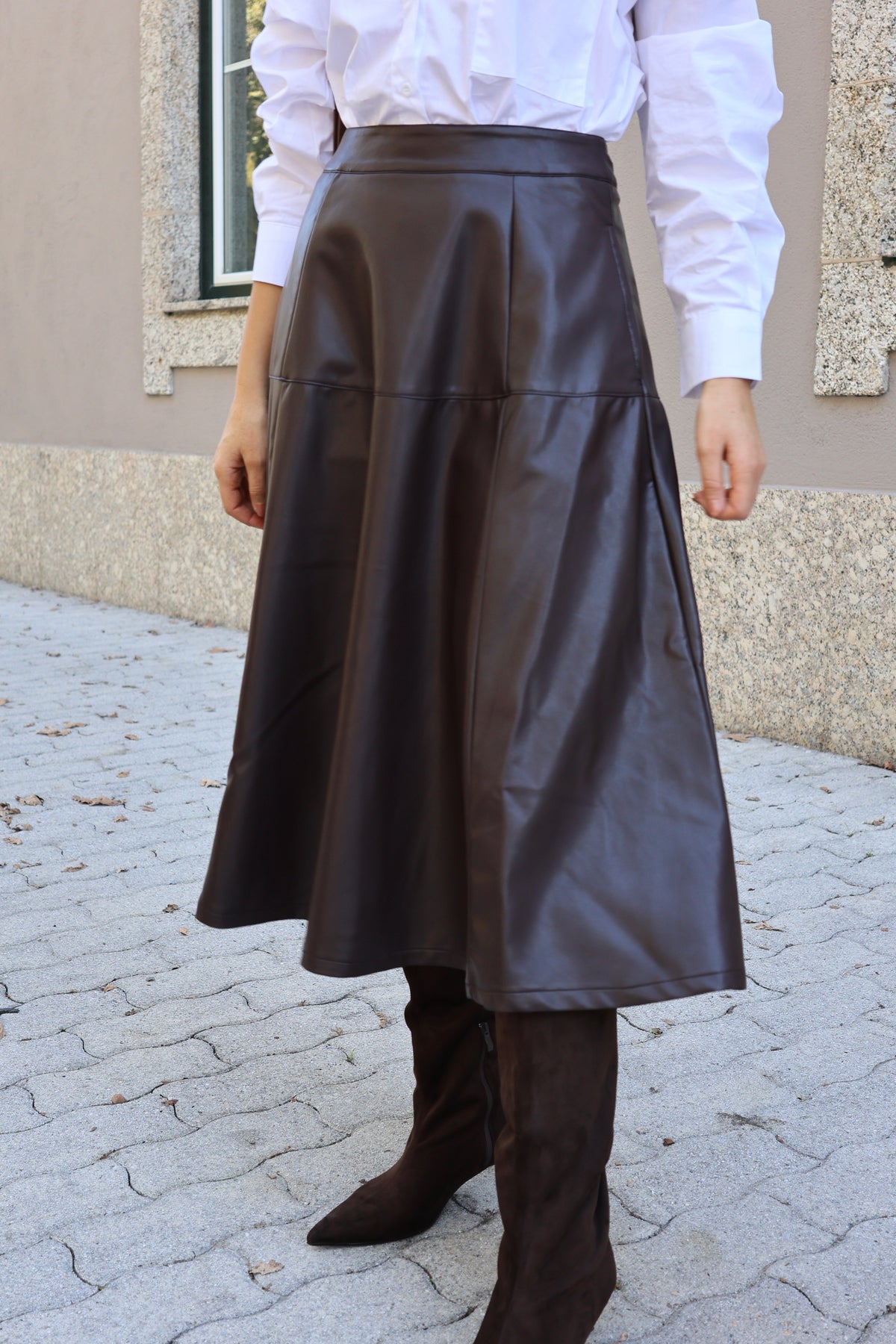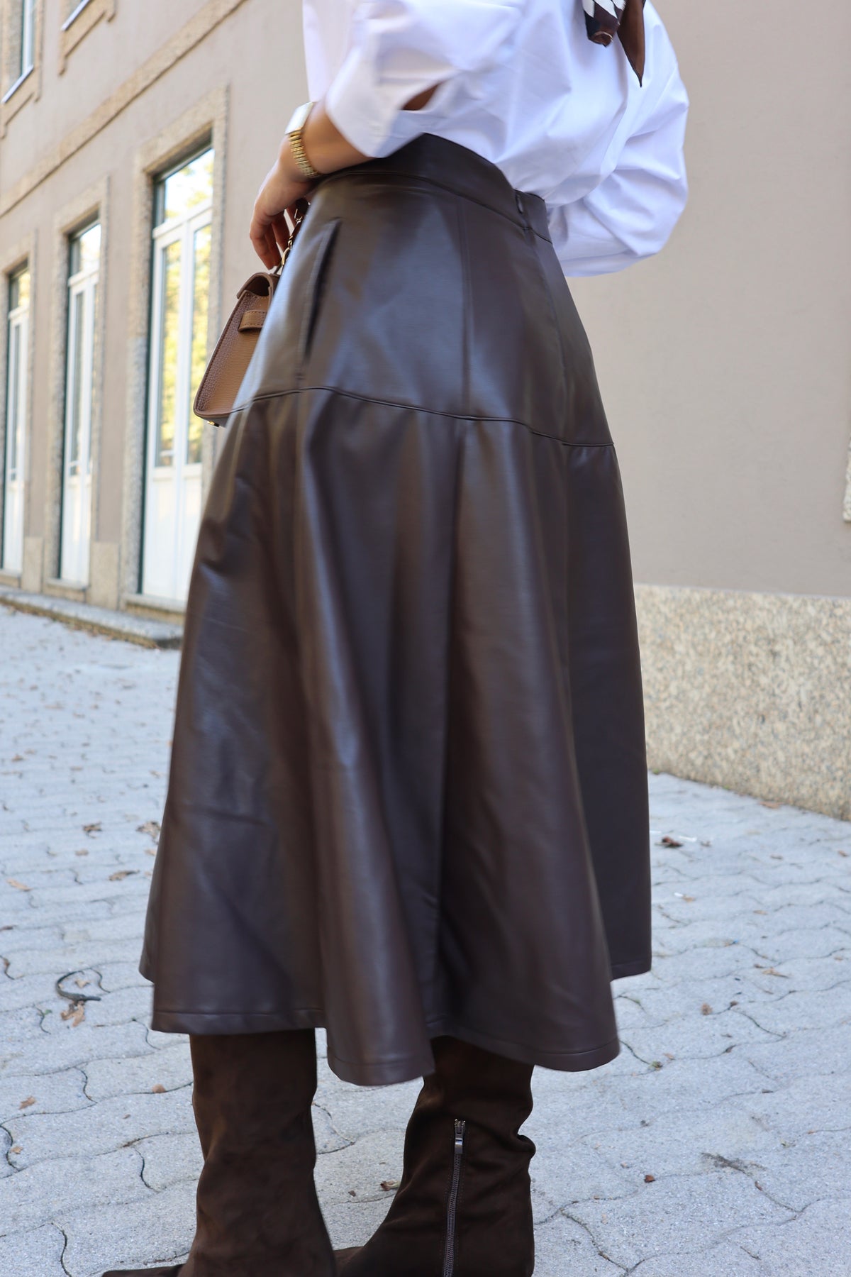 Saia midi em polipele, efeito evasê, com bolsos, cardada por dentro e fecho invisível atrás, Fall-Winter 2025.