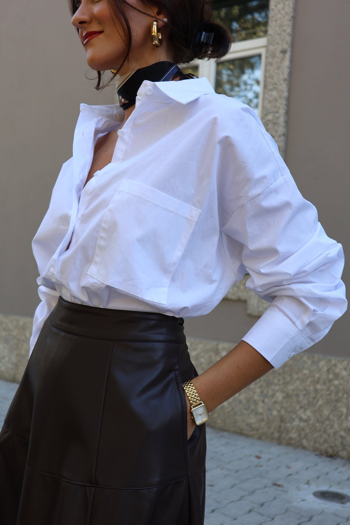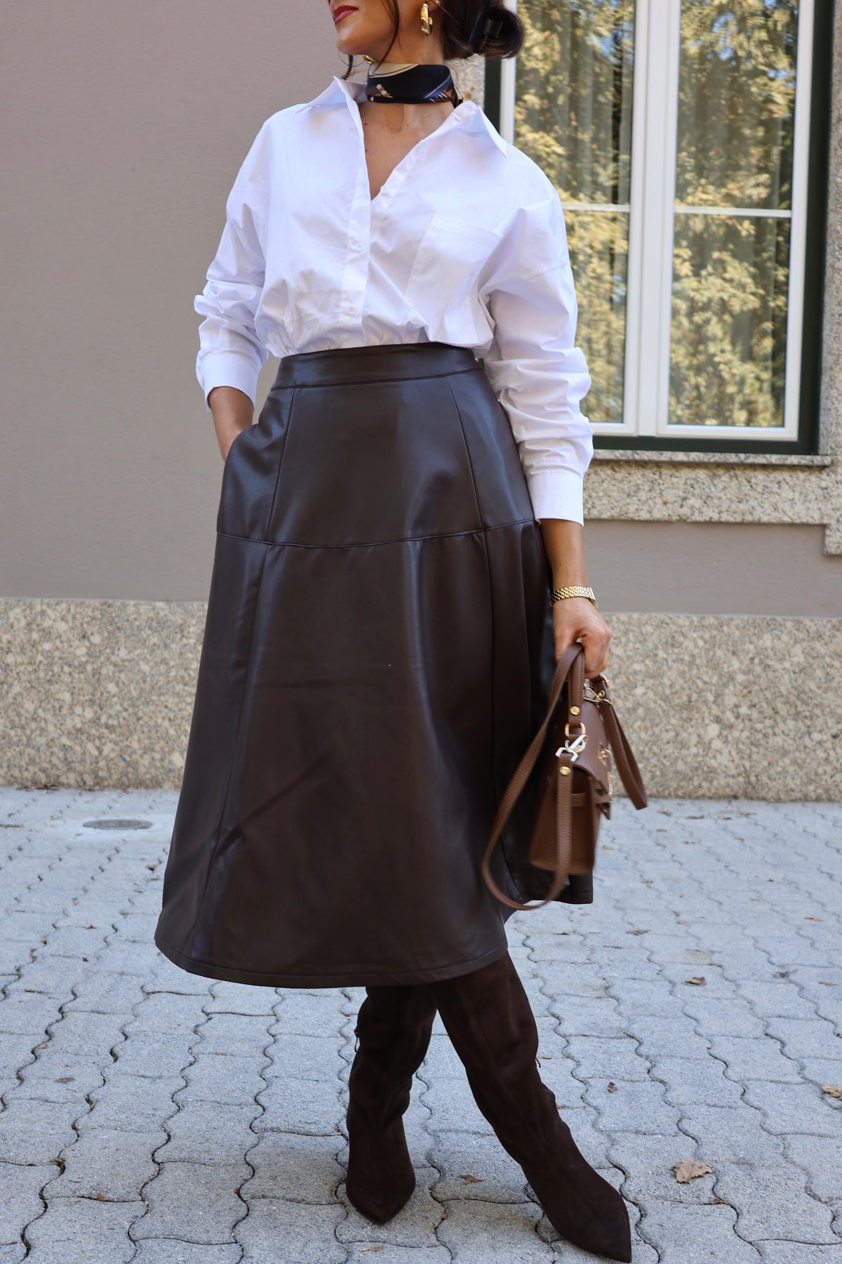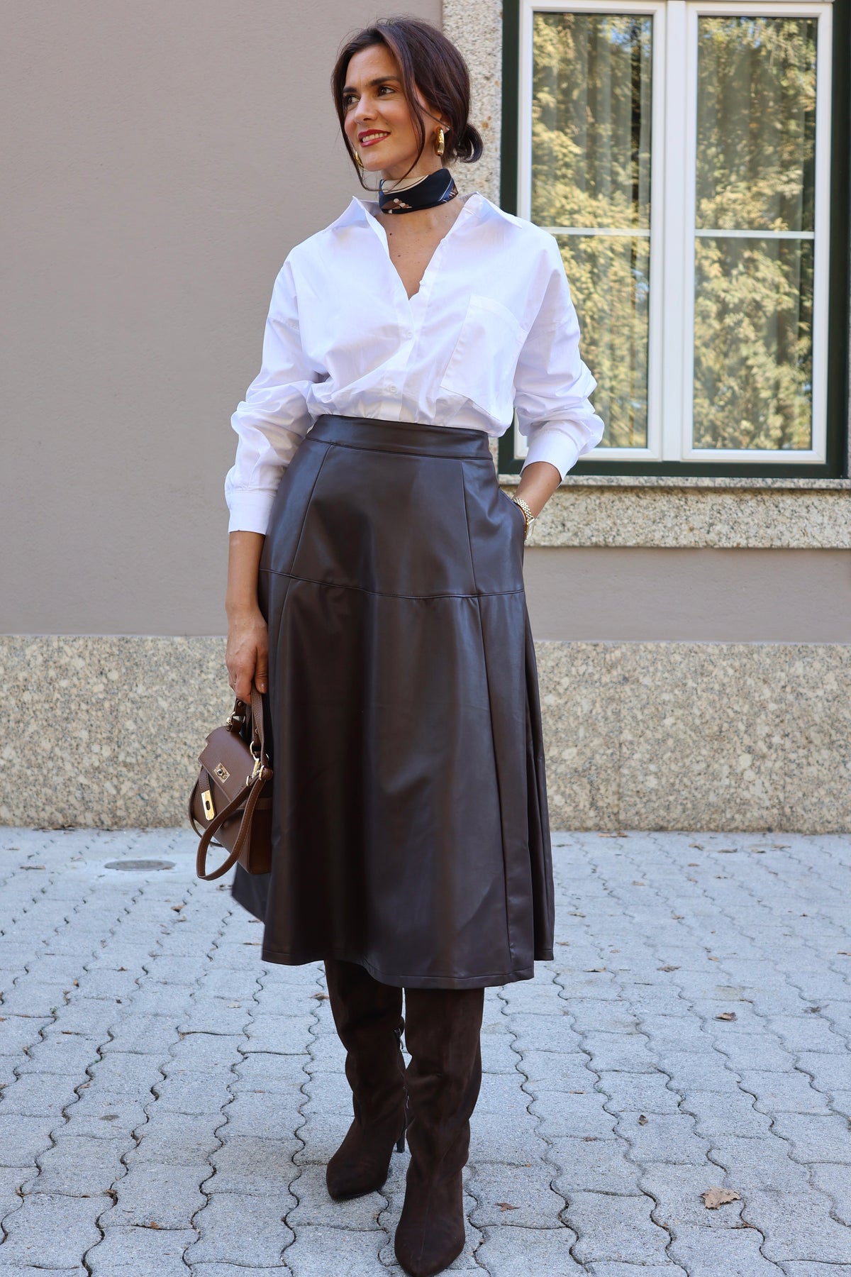 Saia midi em polipele, efeito evasê, com bolsos, cardada por dentro e fecho invisível atrás, Fall-Winter 2025.