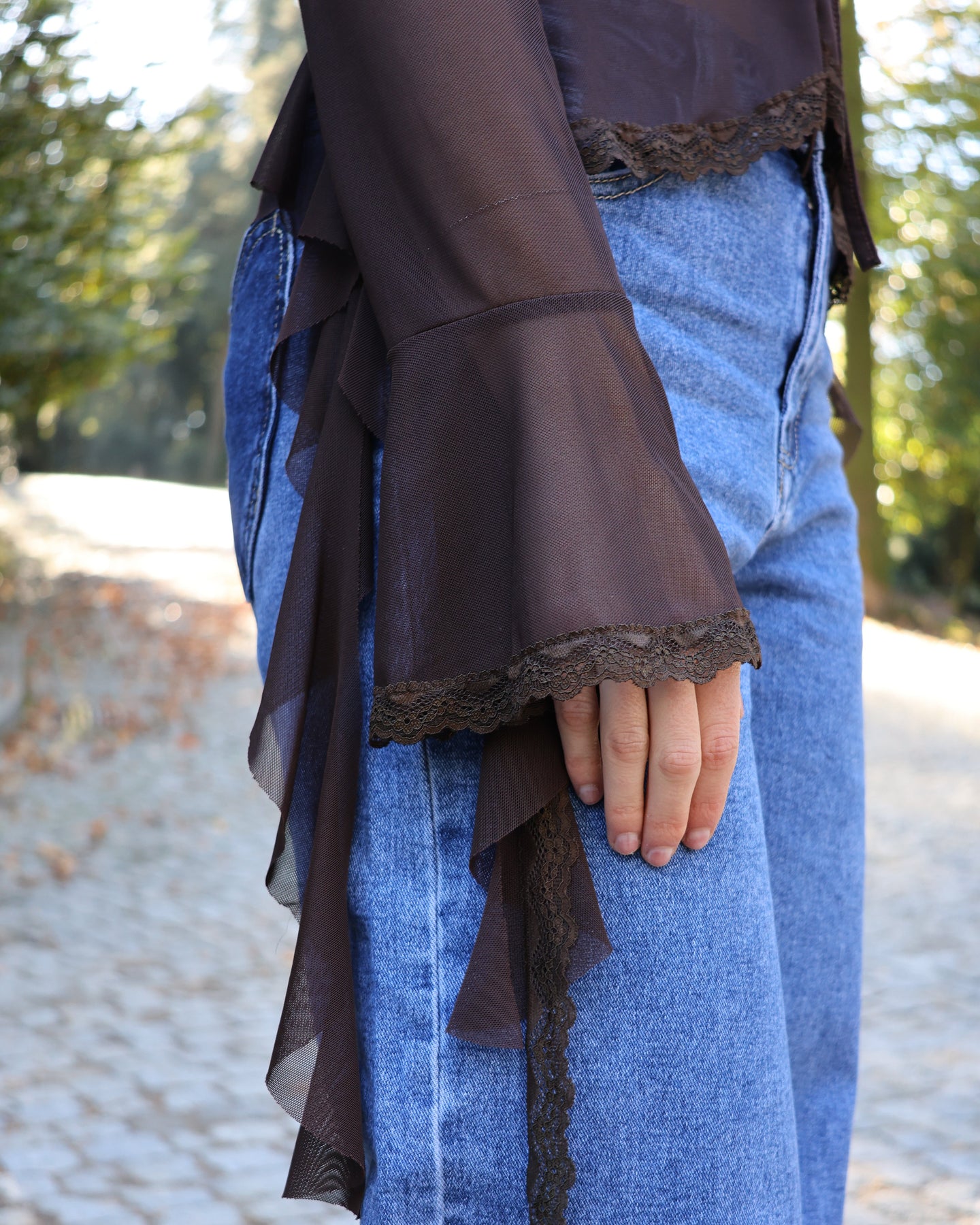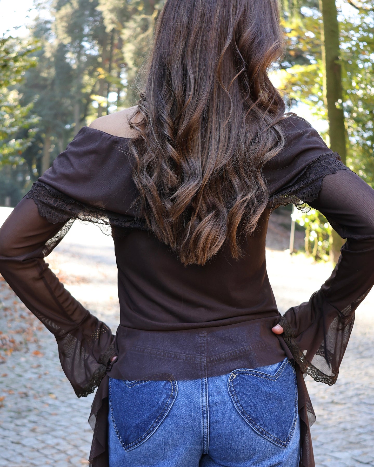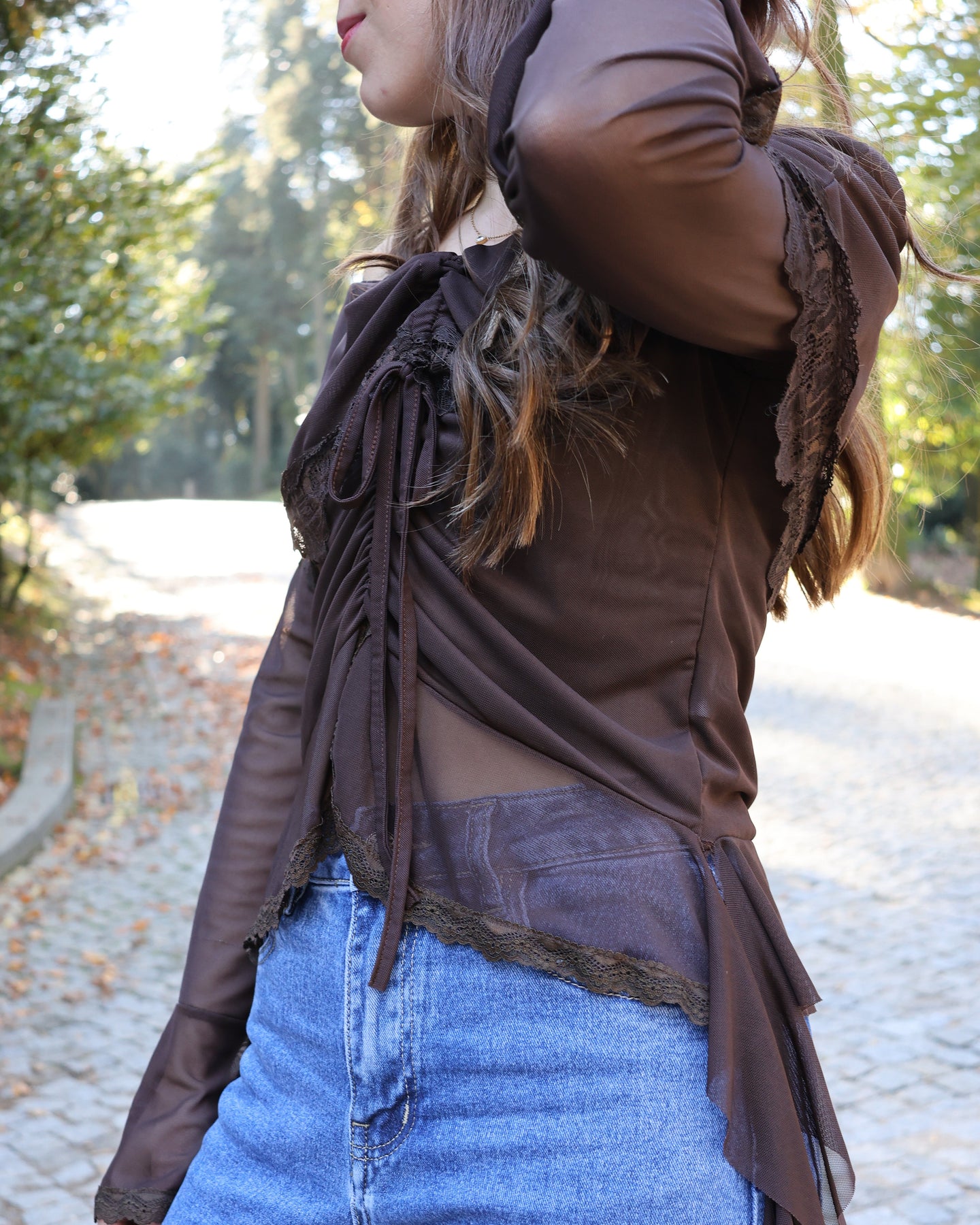 Descrição do produto. Top com alguma transparência, detalhes em renda, decote ombro a ombro e franzido frontal ajustável, Coleção Fall-Winter25.