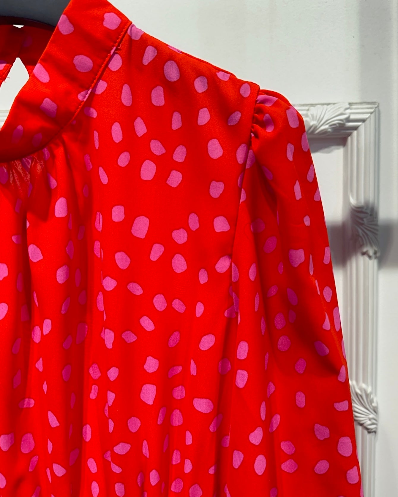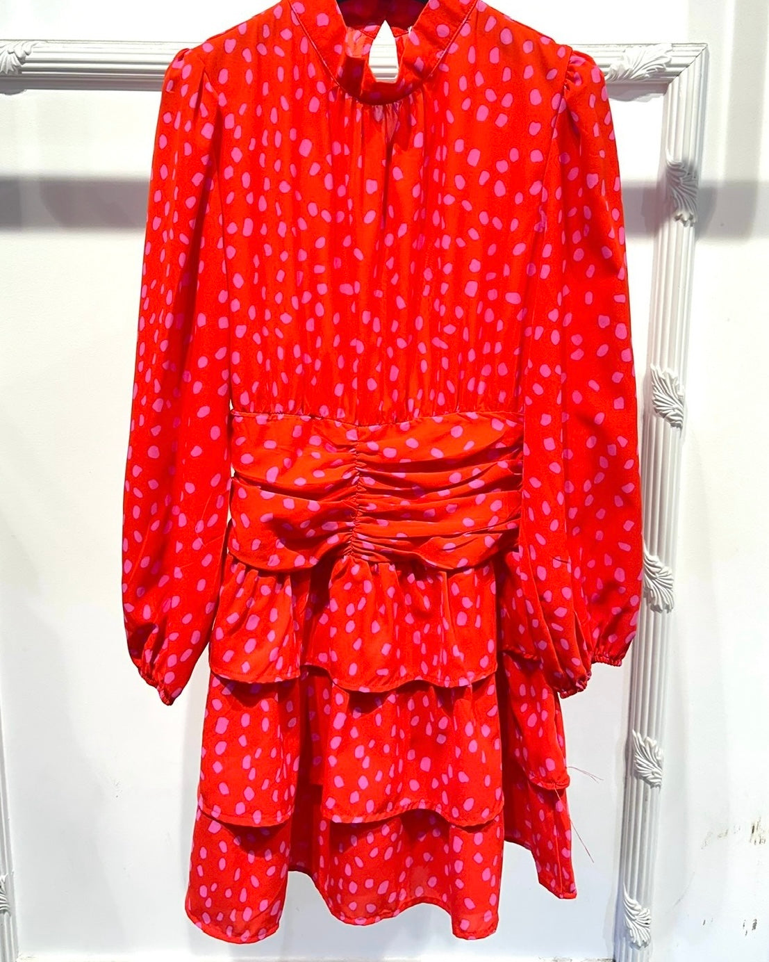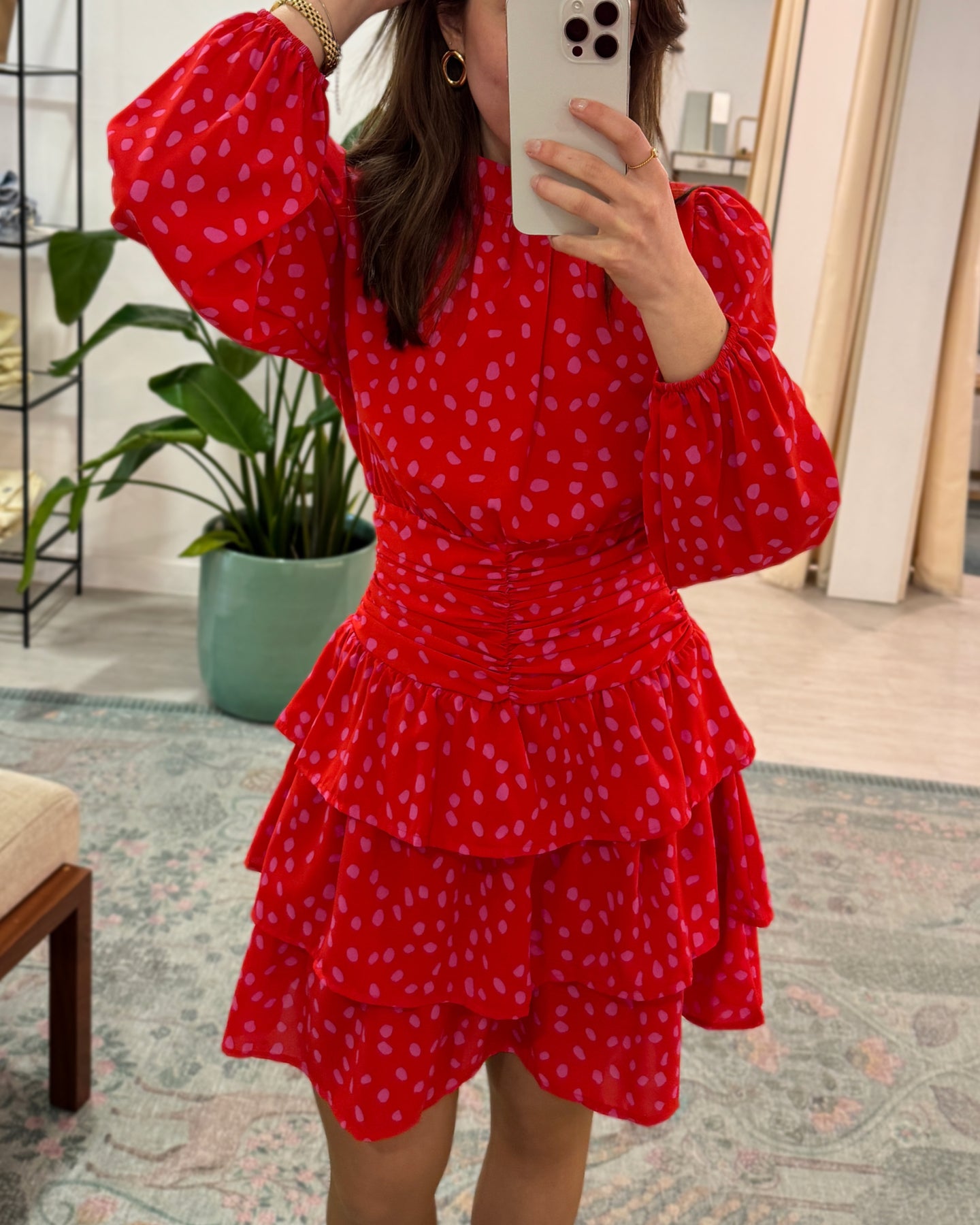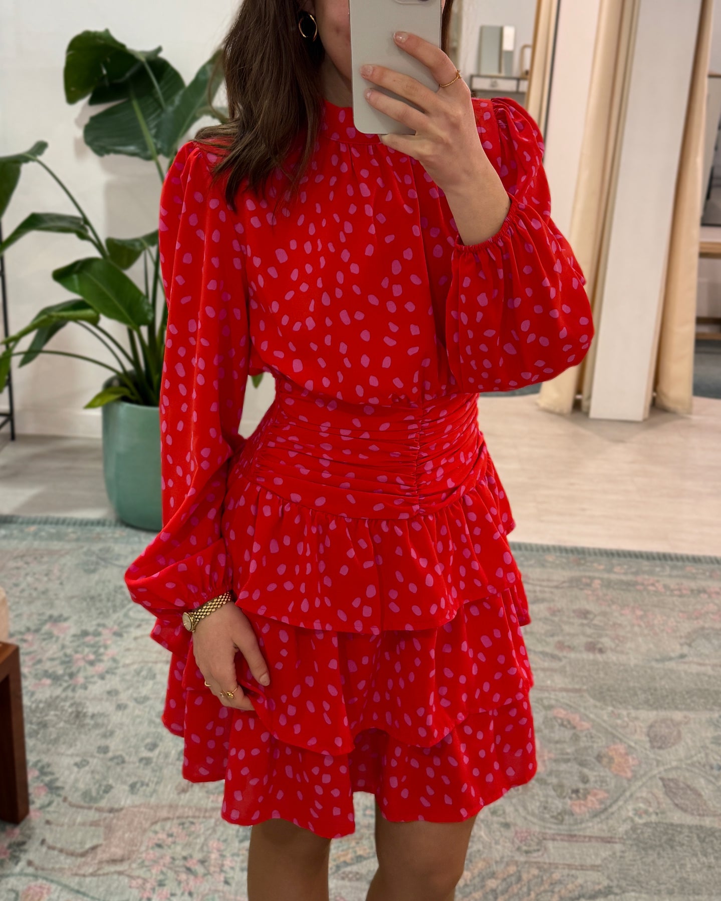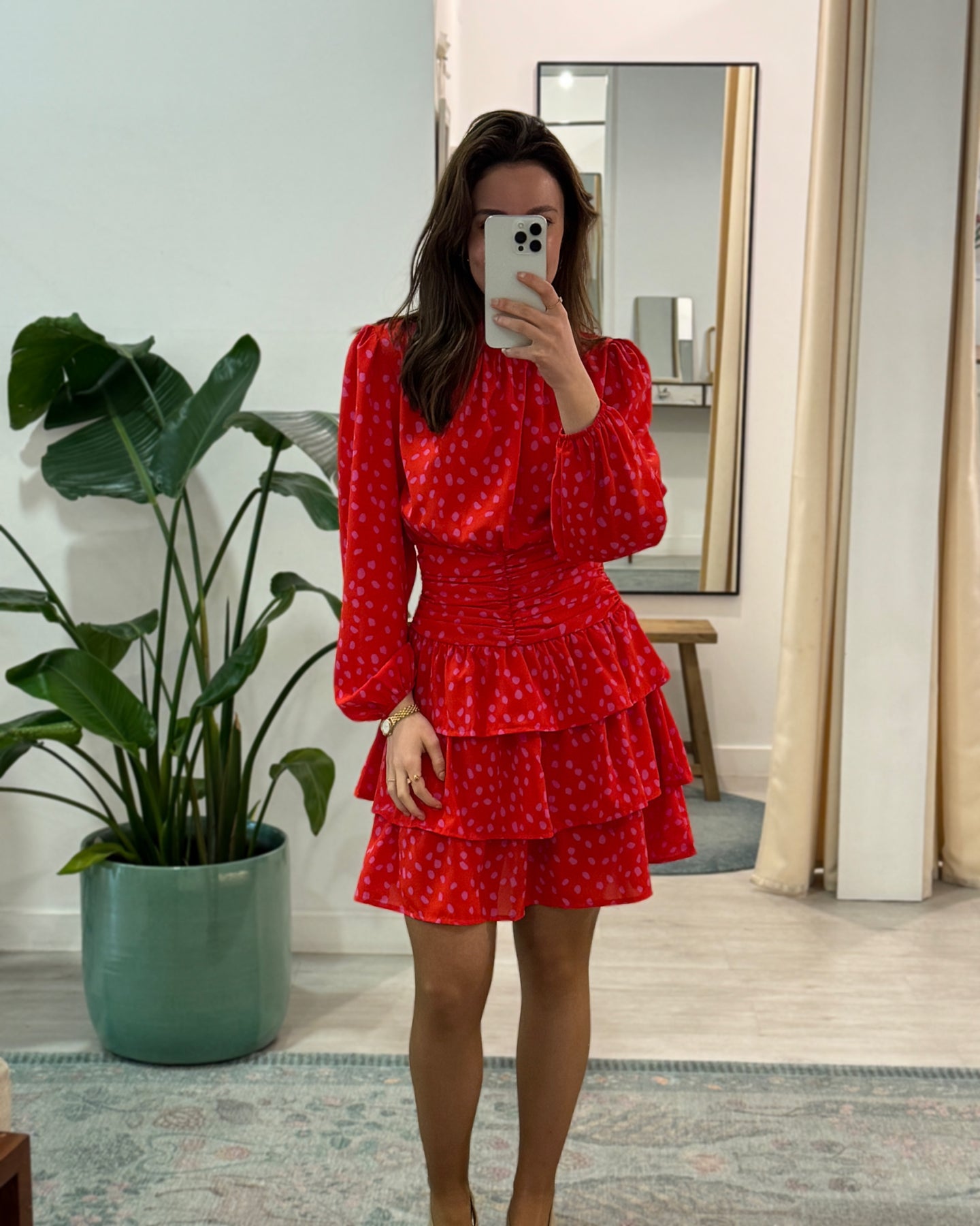 Vestido com estampado, folhos na parte de baixo, manga comprida bufante, tecido leve e fluído. Coleção Primavera 2026.