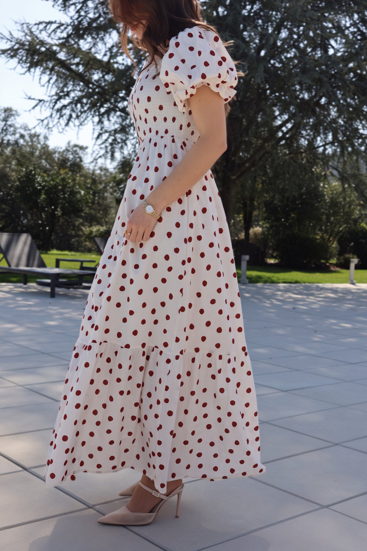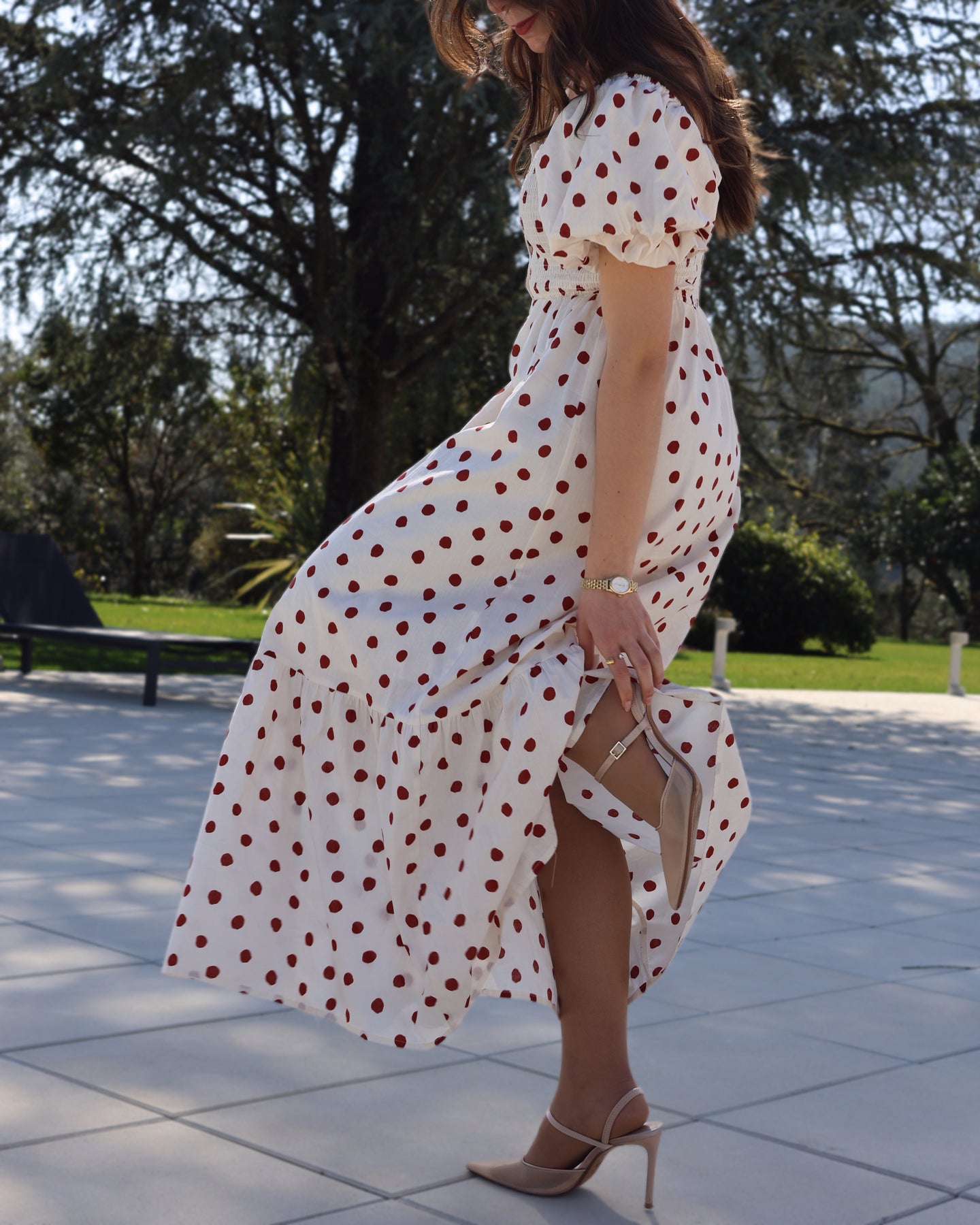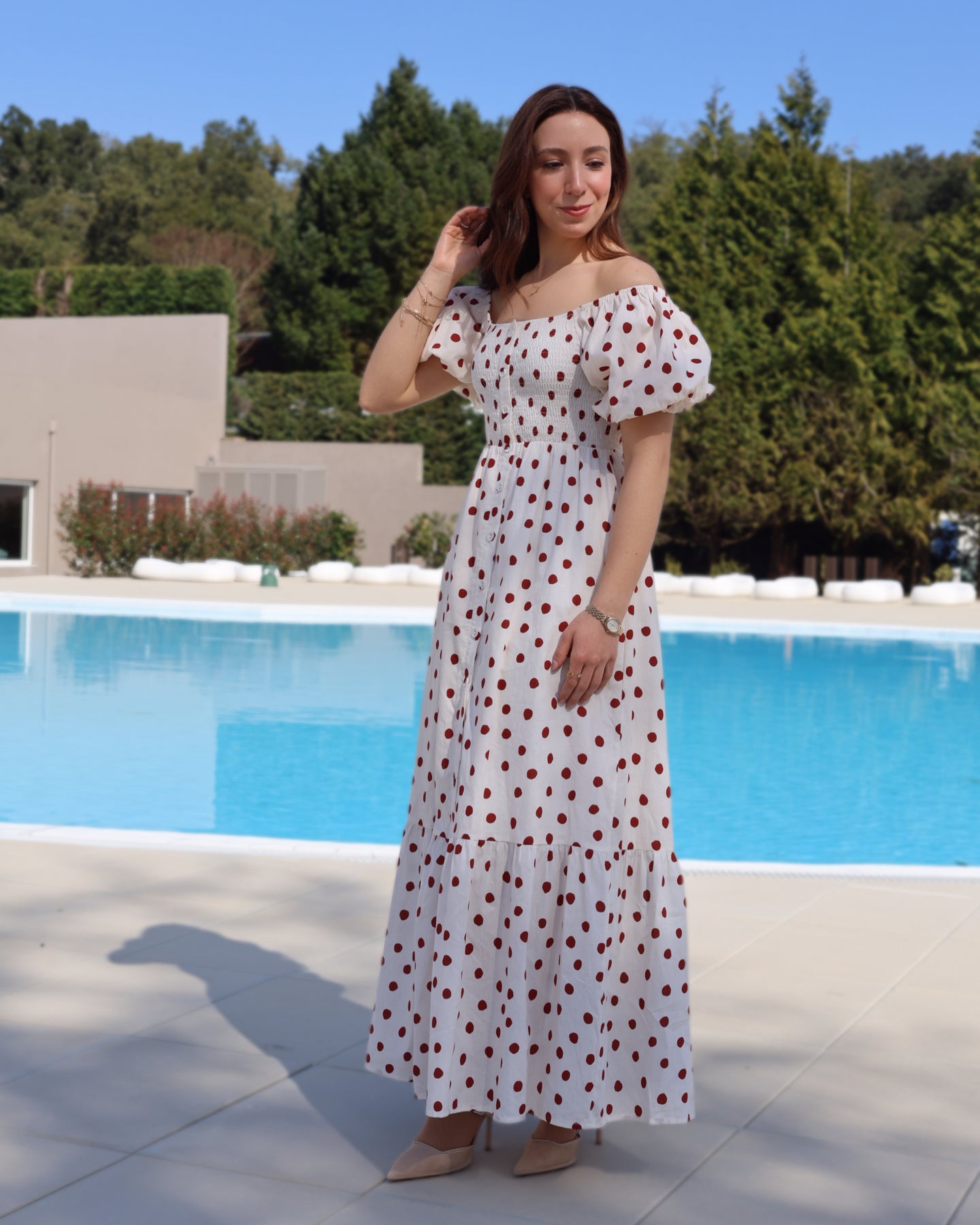 Vestido midi com estampado bolas, manga balão, acabamento franzido no peito, botões forrados, racha frontal. Coleção Primavera 2026.