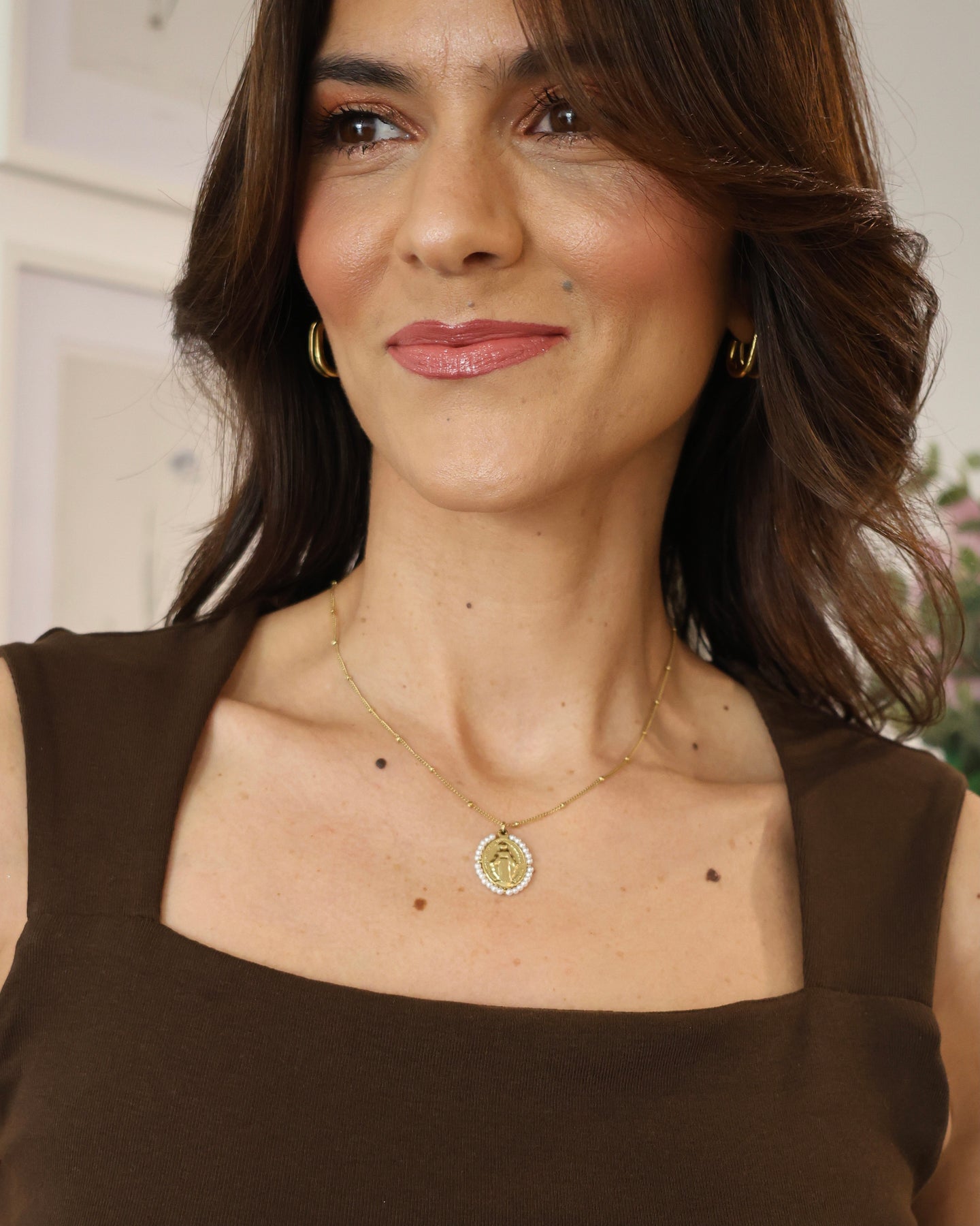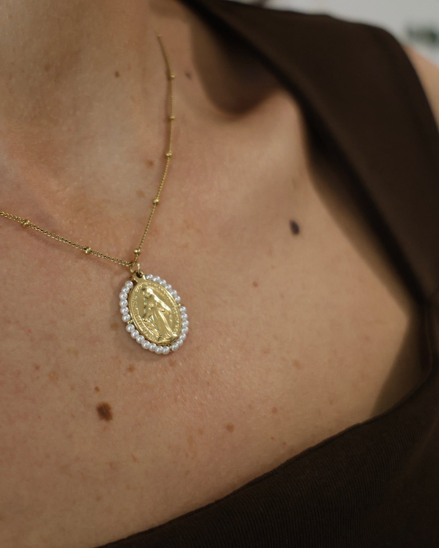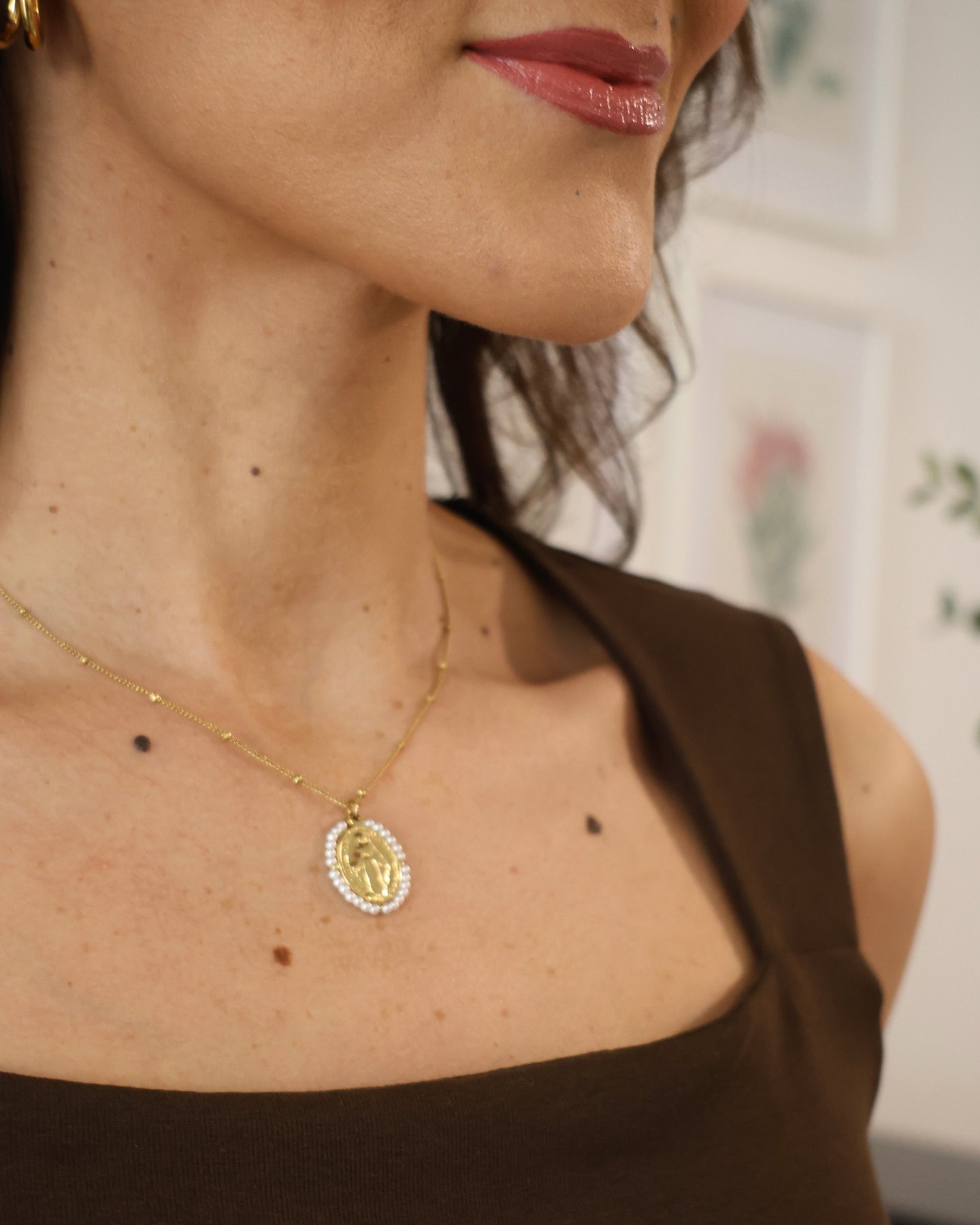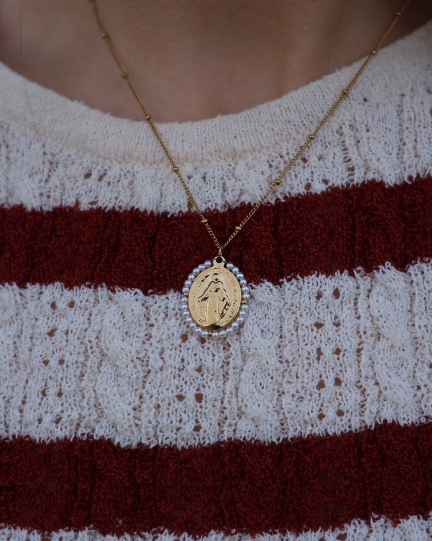 Necklace with a thin chain and oval medal-shaped pendant featuring a religious image. Spring 2026 Collection.