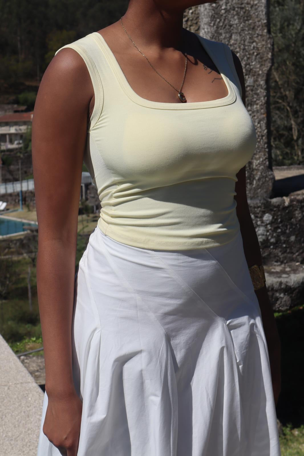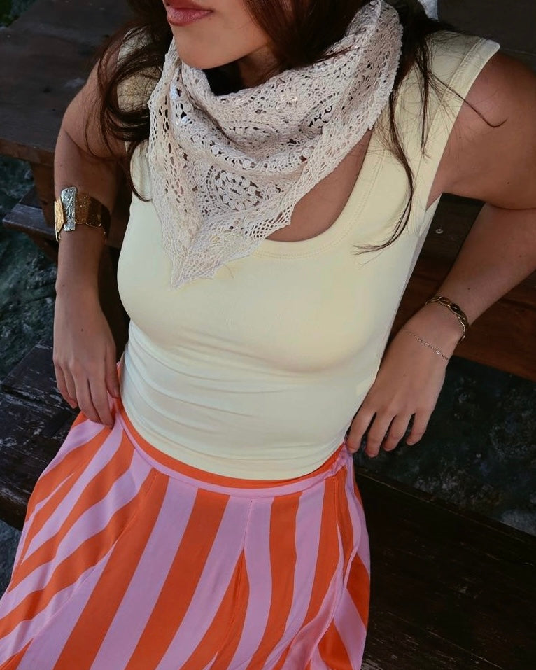 Satin top with straps and lace details.