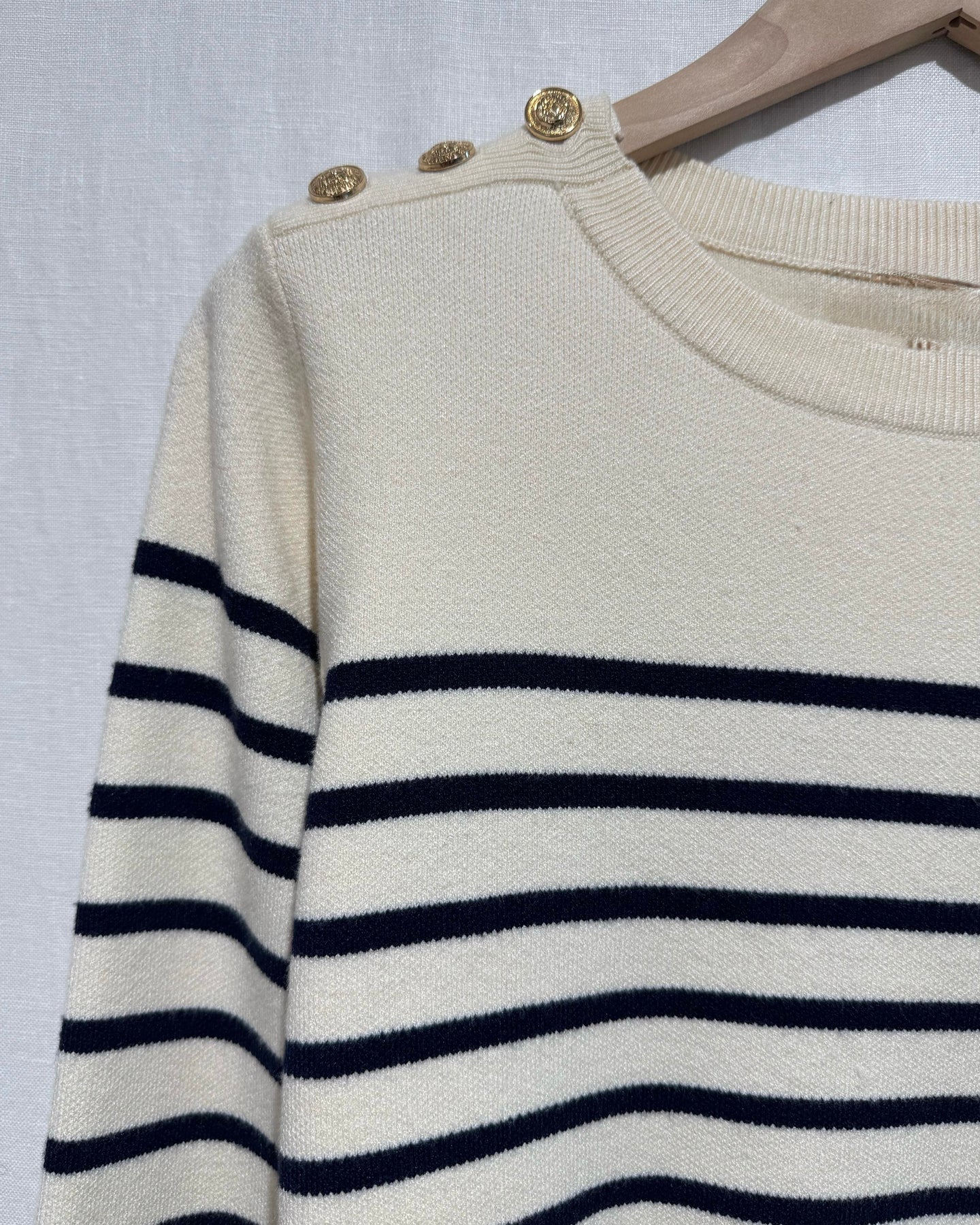 Descrição do produto. Camisola de malha, com listas azul marinho e botões dourados, Nova Coleção Spring 26.