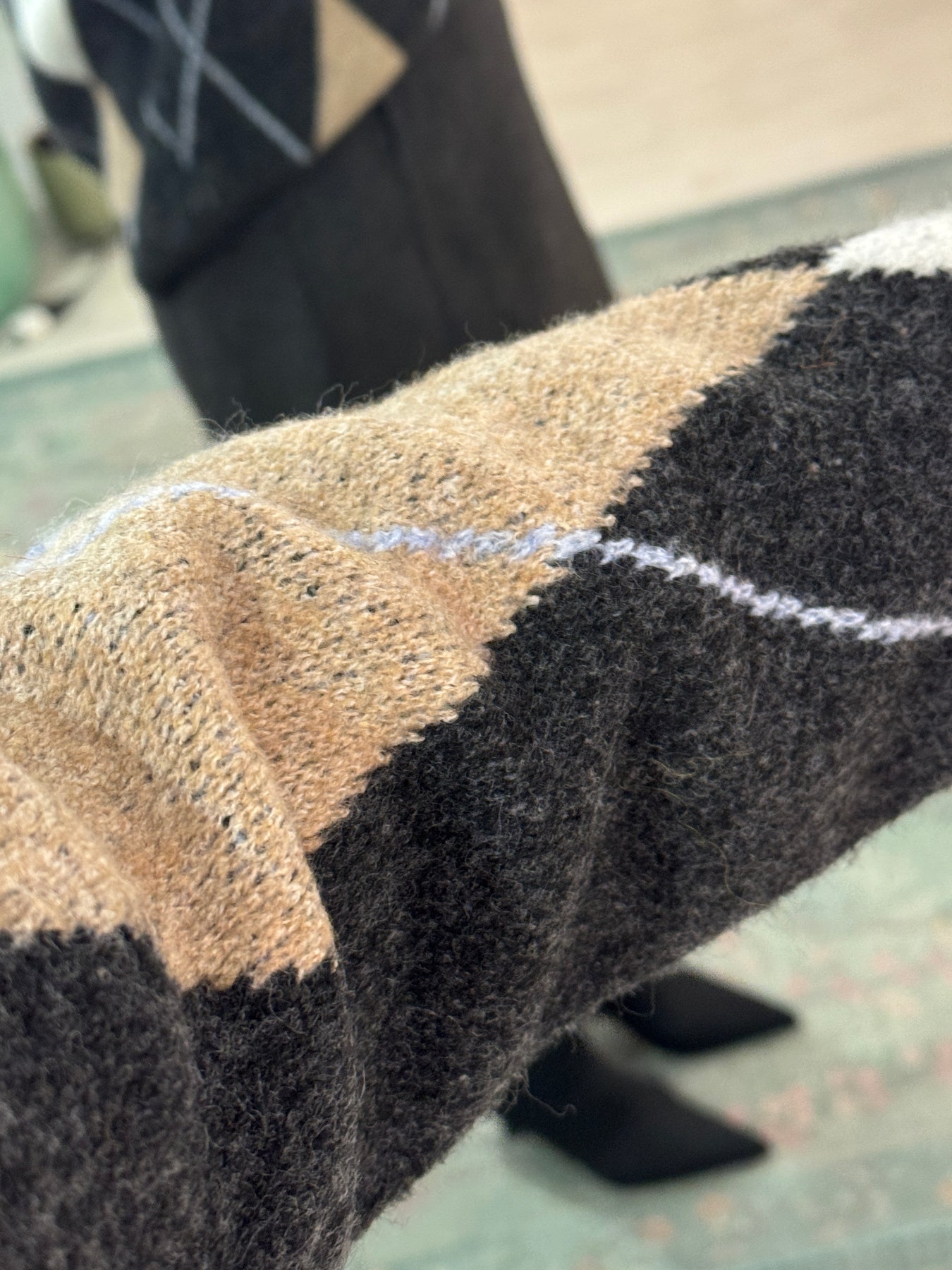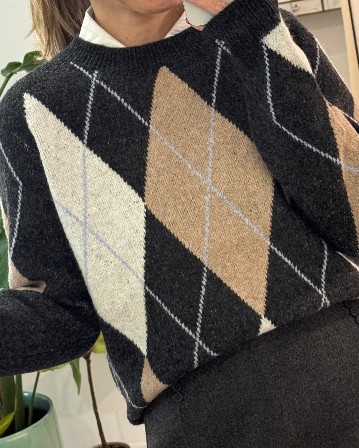 Product description. Sweater made of wool, in knit fabric, polo style, diamond pattern and 3 front buttons, Fall-Winter25 Collection.
