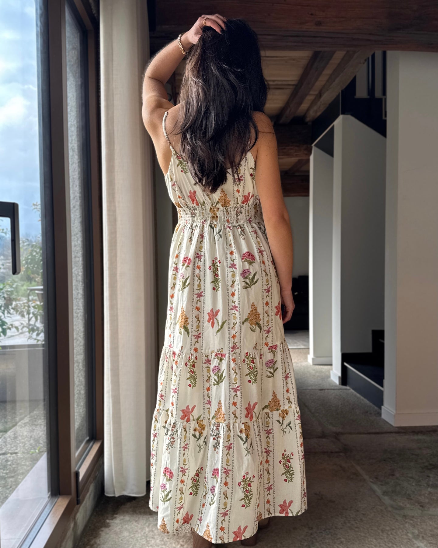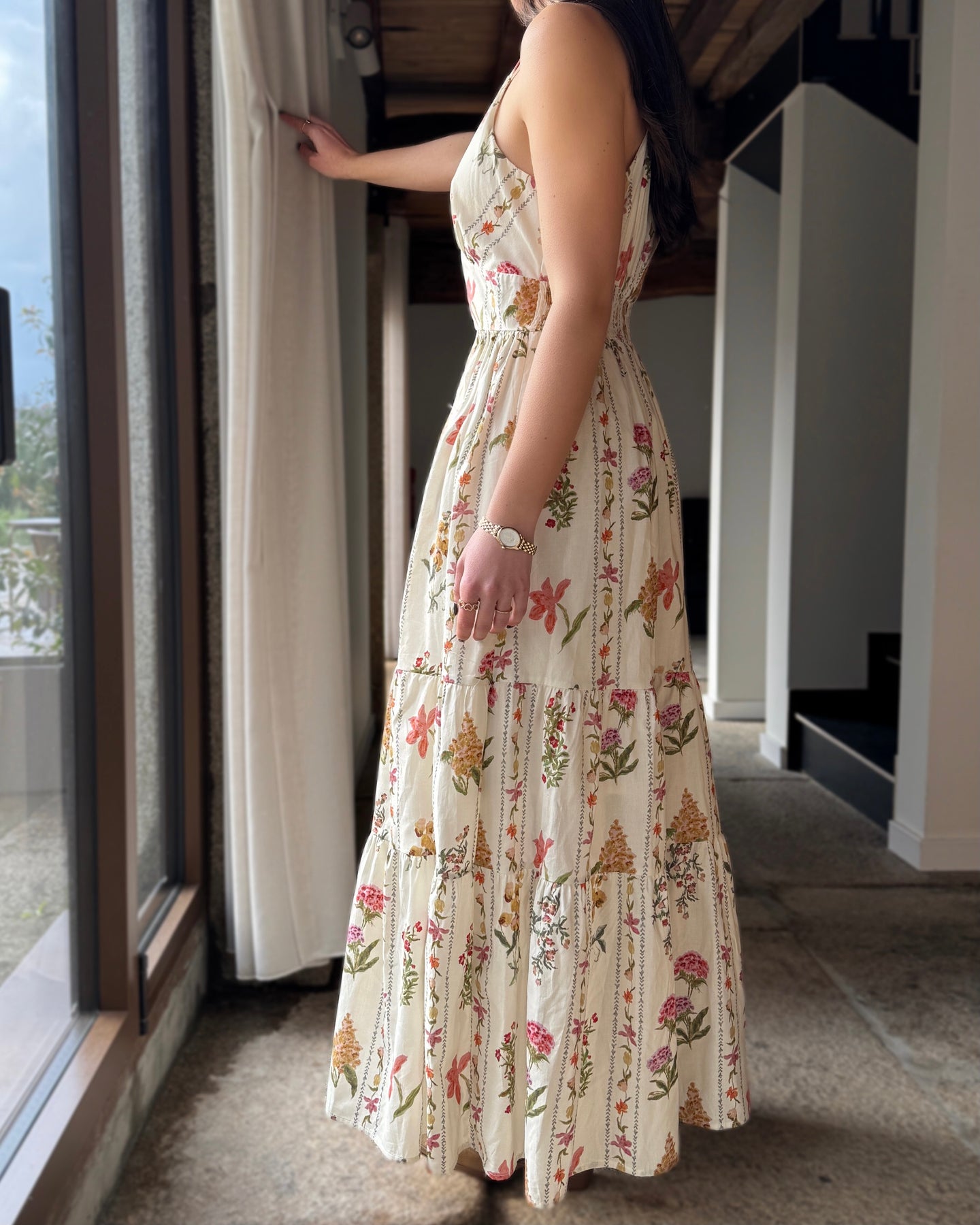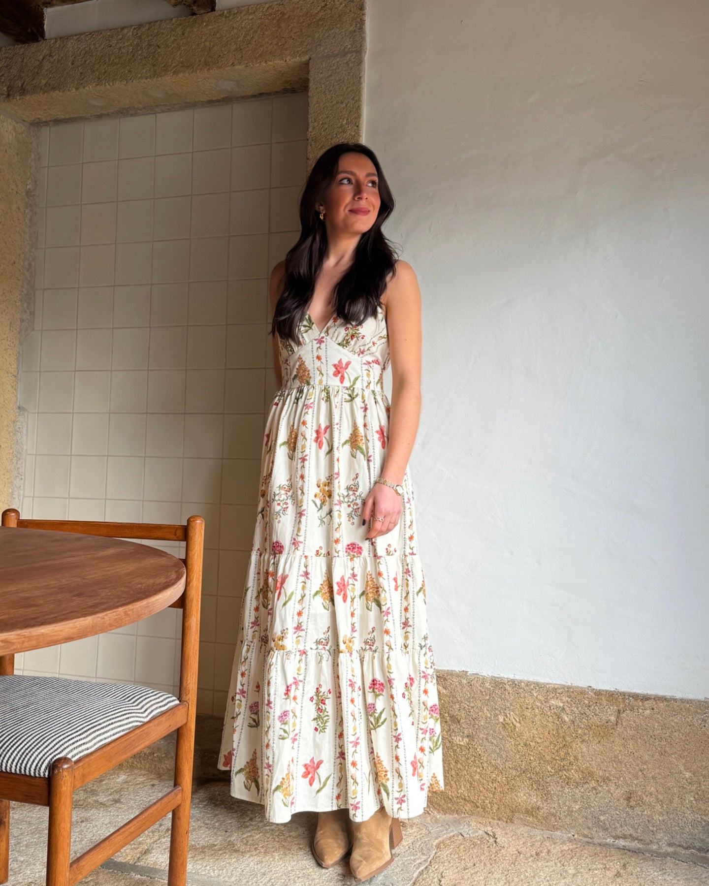 Vestido midi de alças, decote em V, padrão floral, tecido leve e fluído, Nova coleção Spring26.