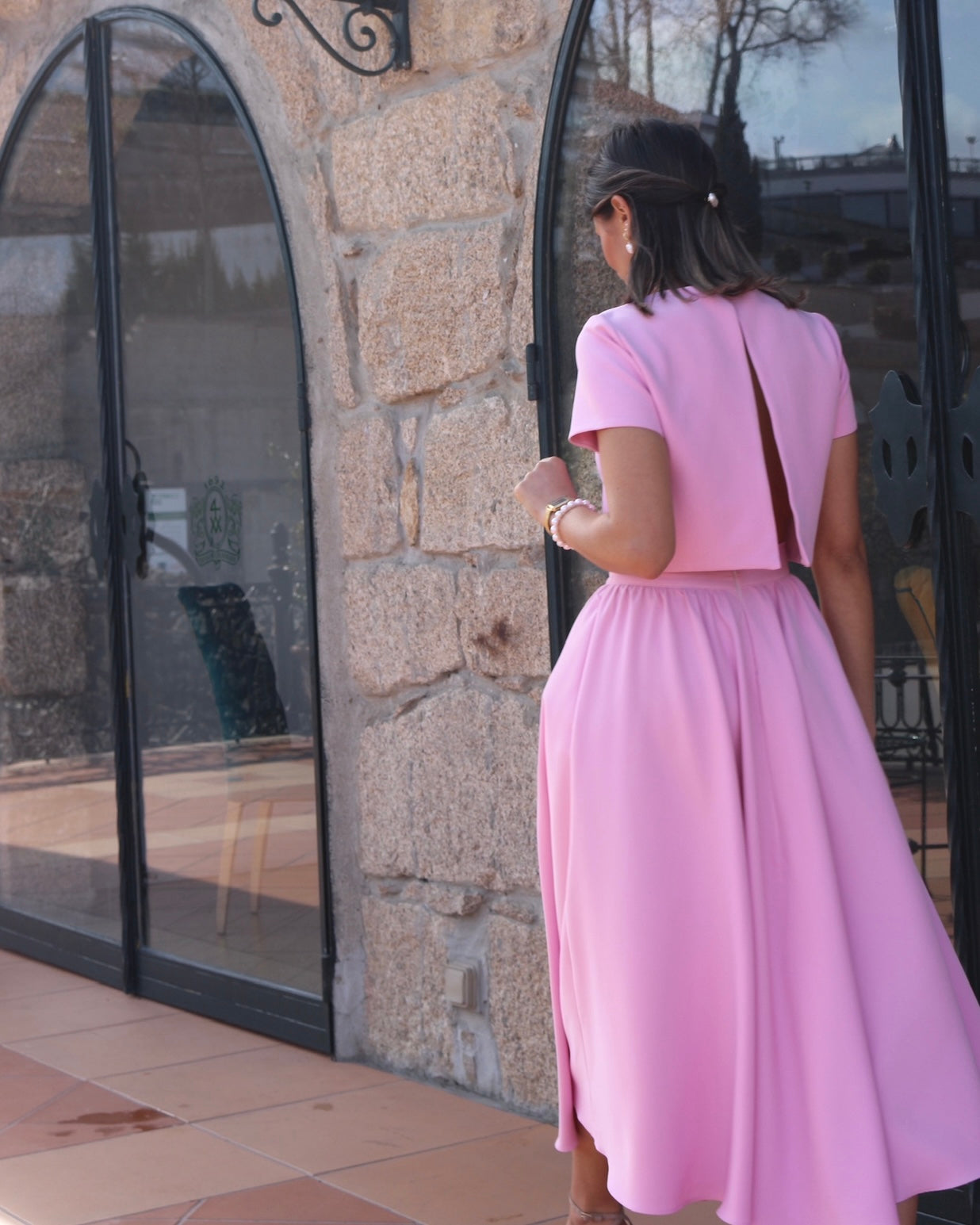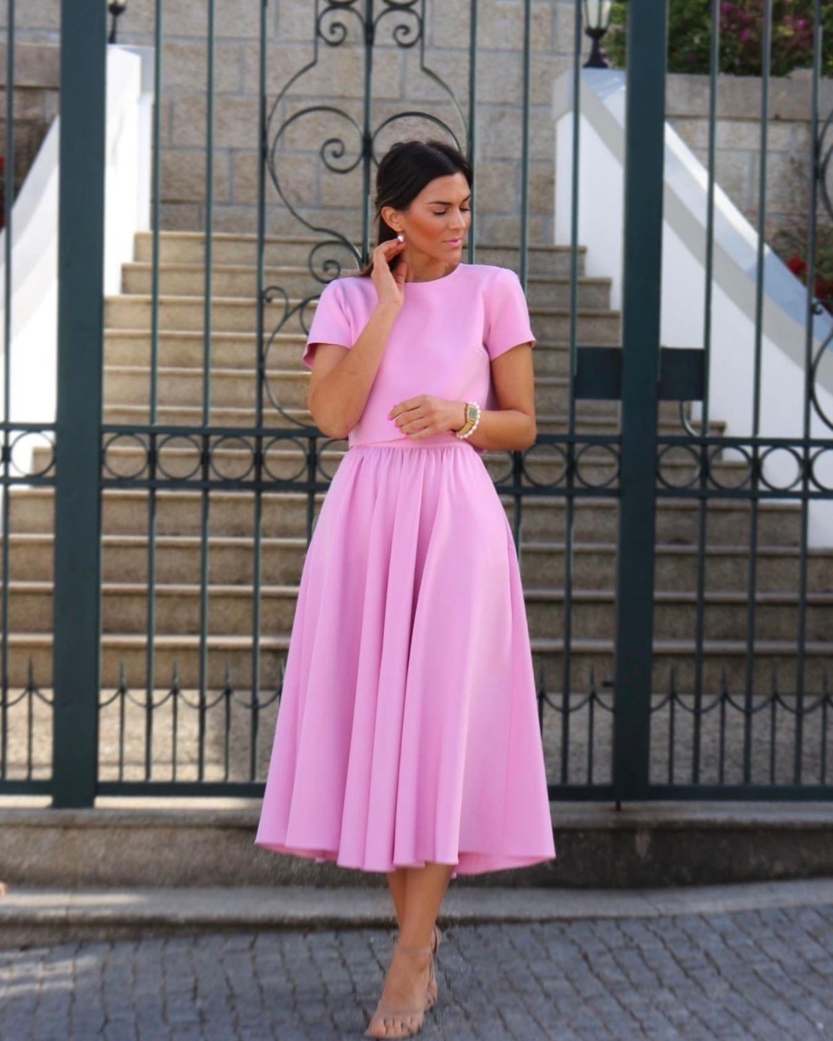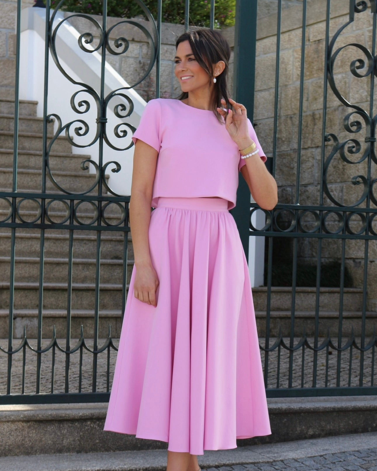 Conjunto de top e saia, top de manga curta e saia midi com efeito rodado. Perfeito para Festas.