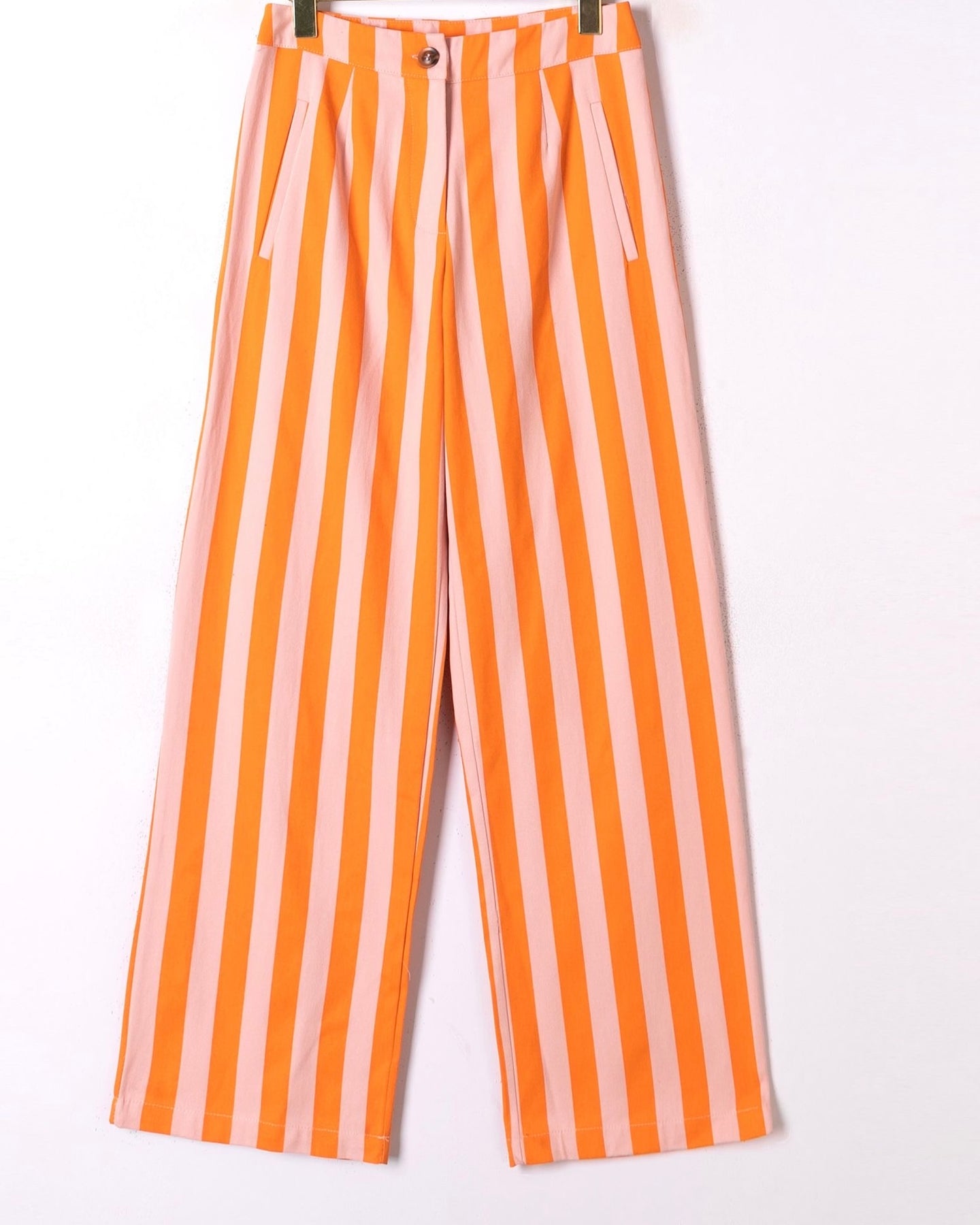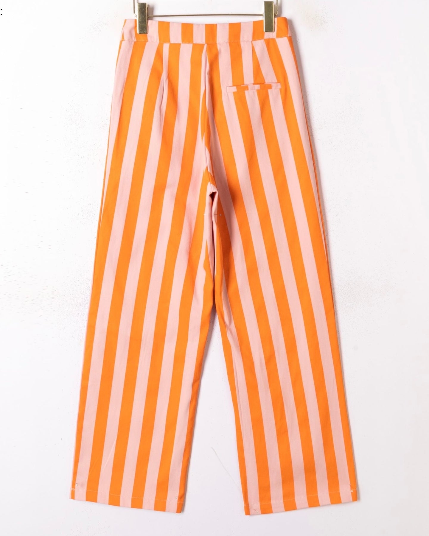 Jeans tecido estilo lona, com listas laranja e rosa, cintura subida, Nova Coleção Spring26.