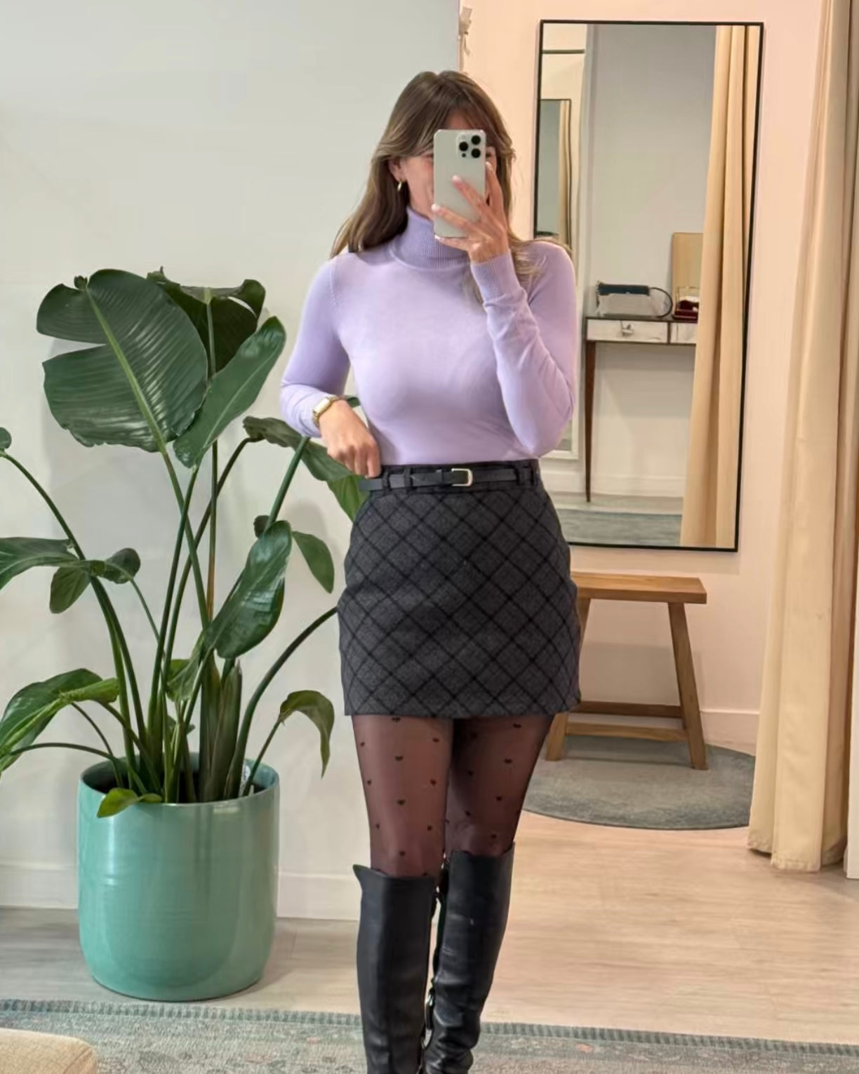 Descrição do produto. Saia com padrão xadrez, efeito calção por baixo e cinto incluído, Nova Coleção Spring26.