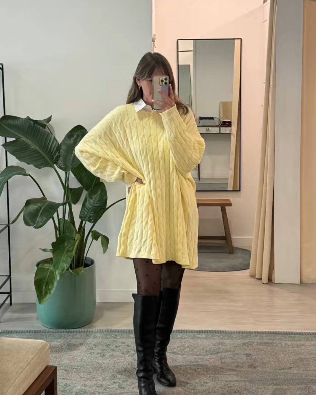 Vestido de malha entrançada, gola redonda e corte oversize, Nova coleção Spring26.