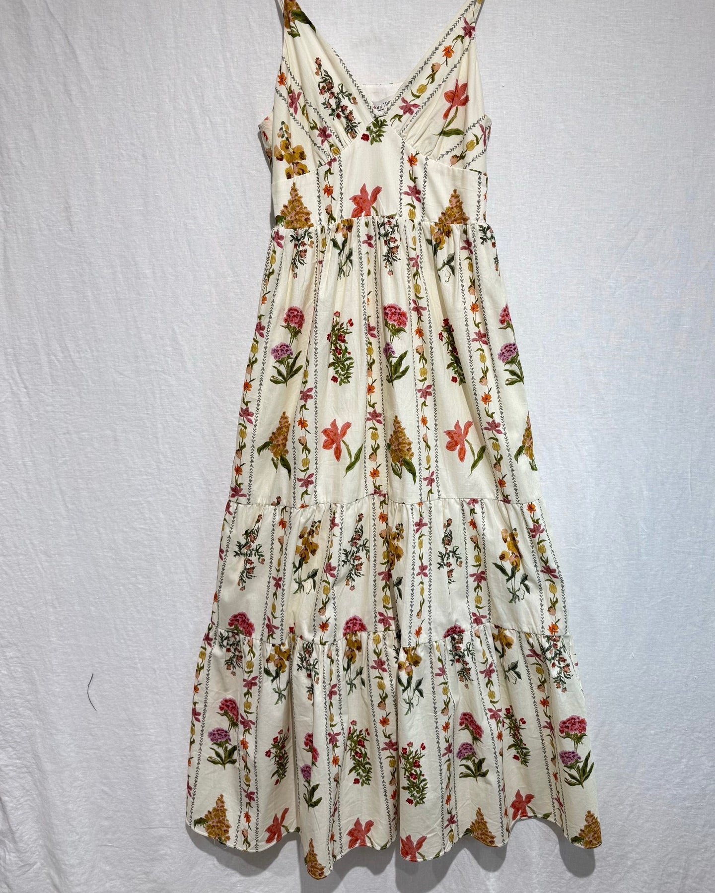 Vestido midi de alças, decote em V, padrão floral, tecido leve e fluído, Nova coleção Spring26.