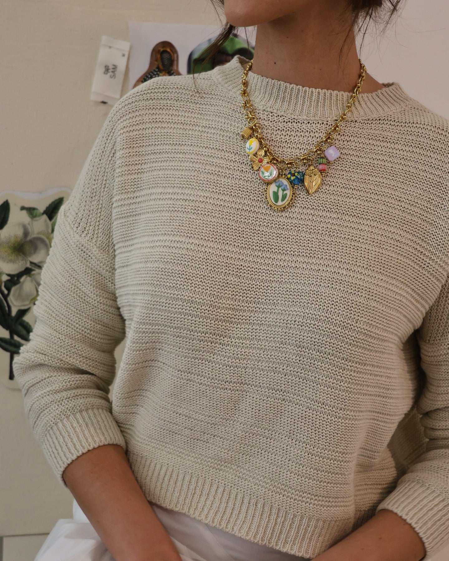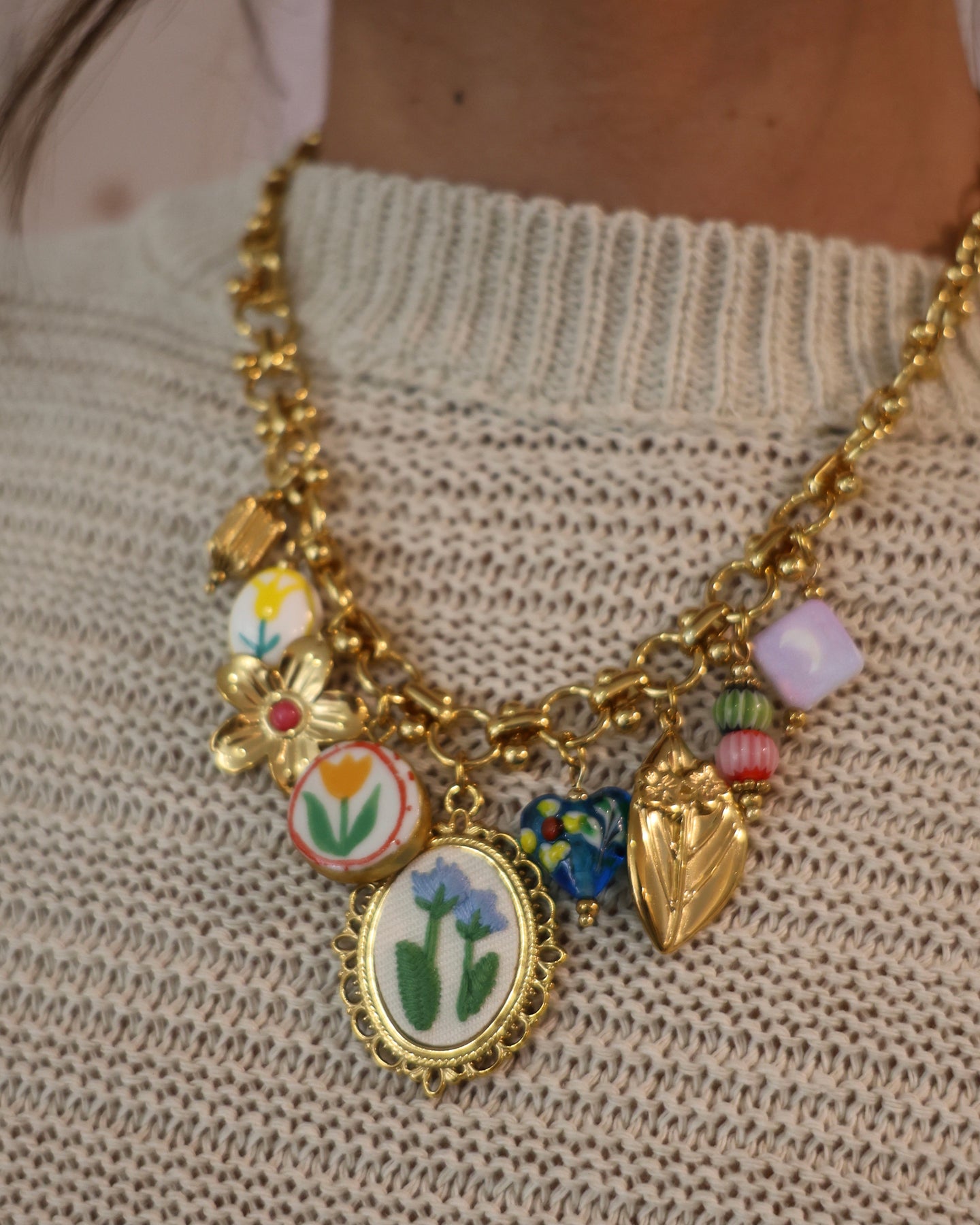 Collar dorado con colgante bordado y otros colgantes, Colección Primavera 2026 .