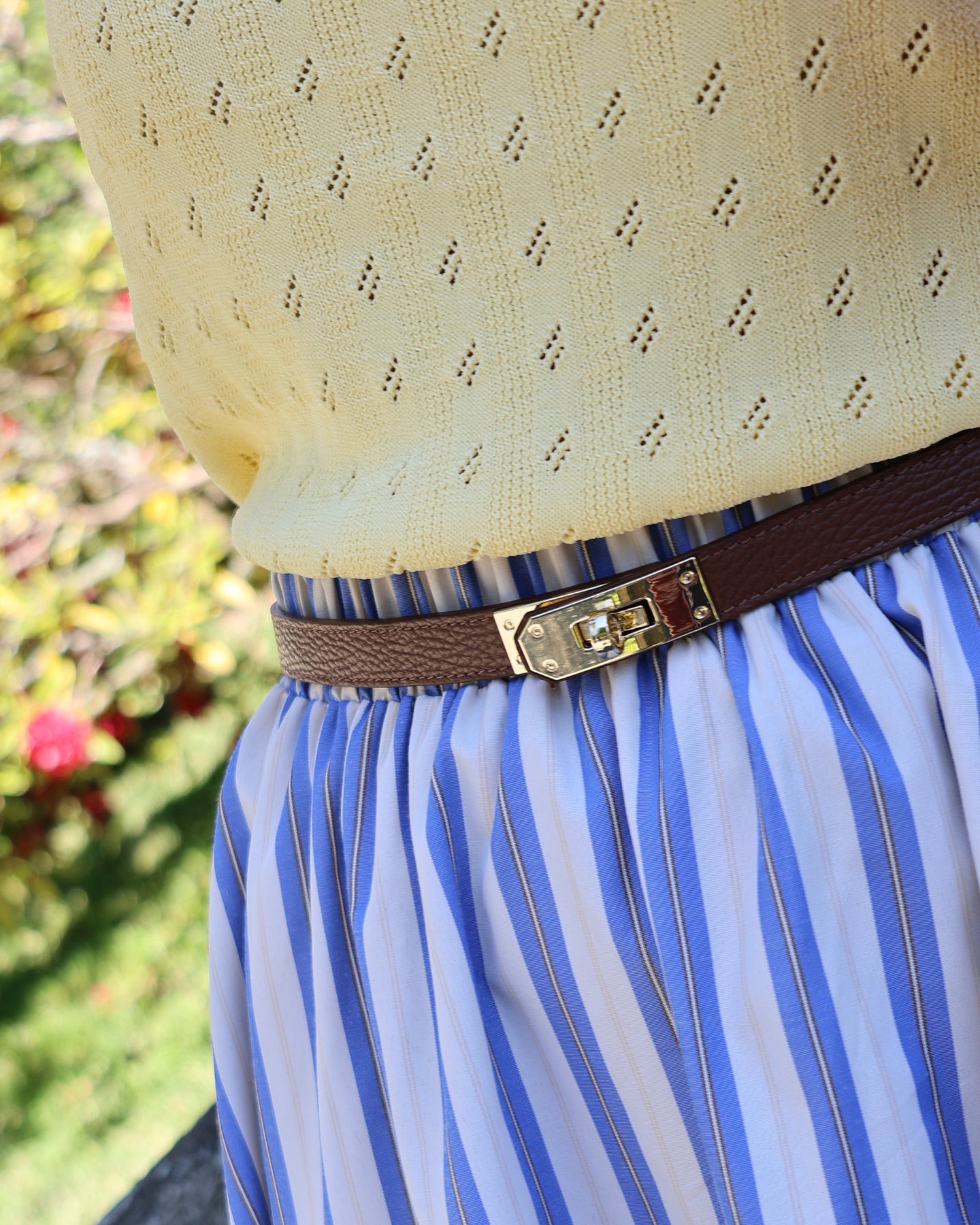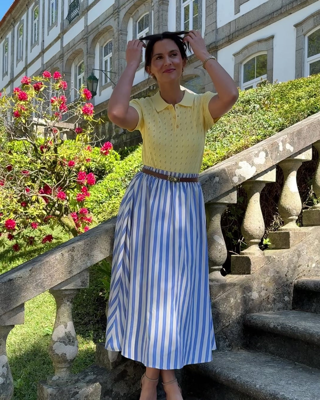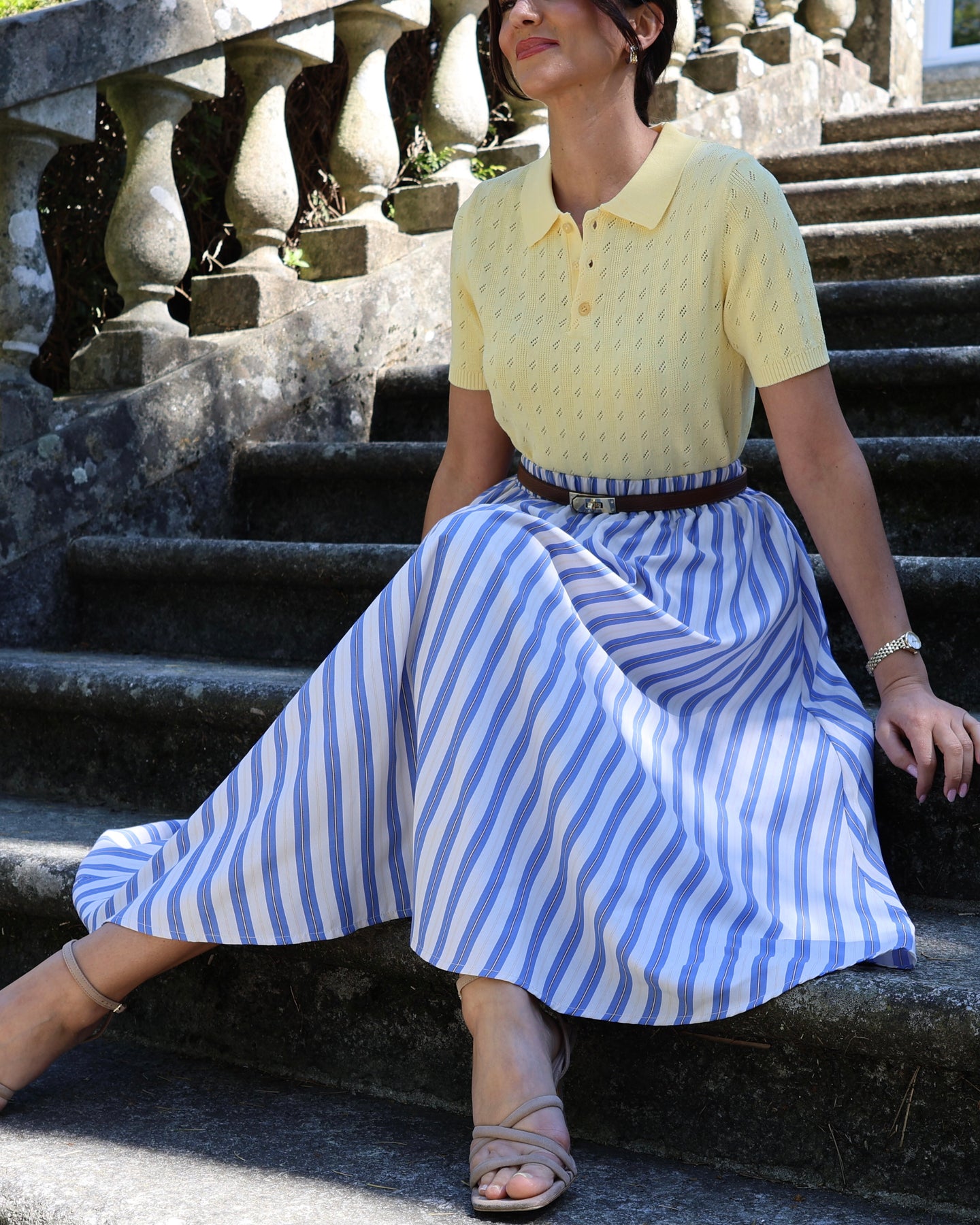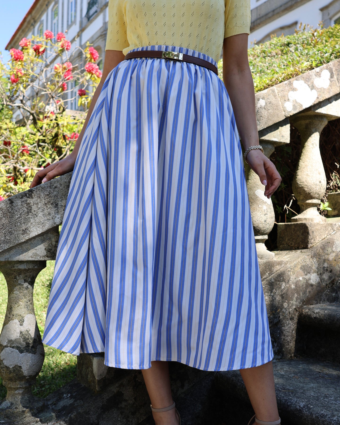 Saia midi com listas azuis e amarelas, elástico na cintura e forro interior. Coleção Primavera 2026.