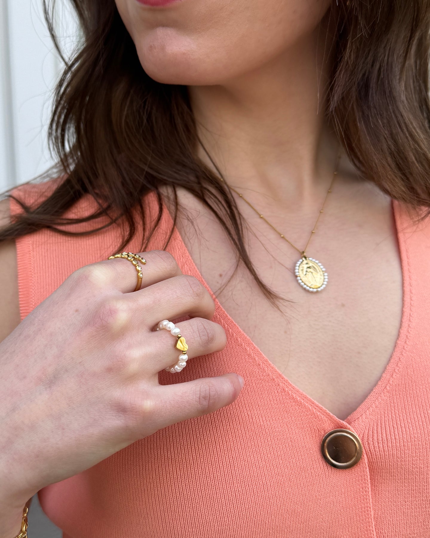 Anel ajustável com pérolas e coração dourado. Coleção Primavera 2026.