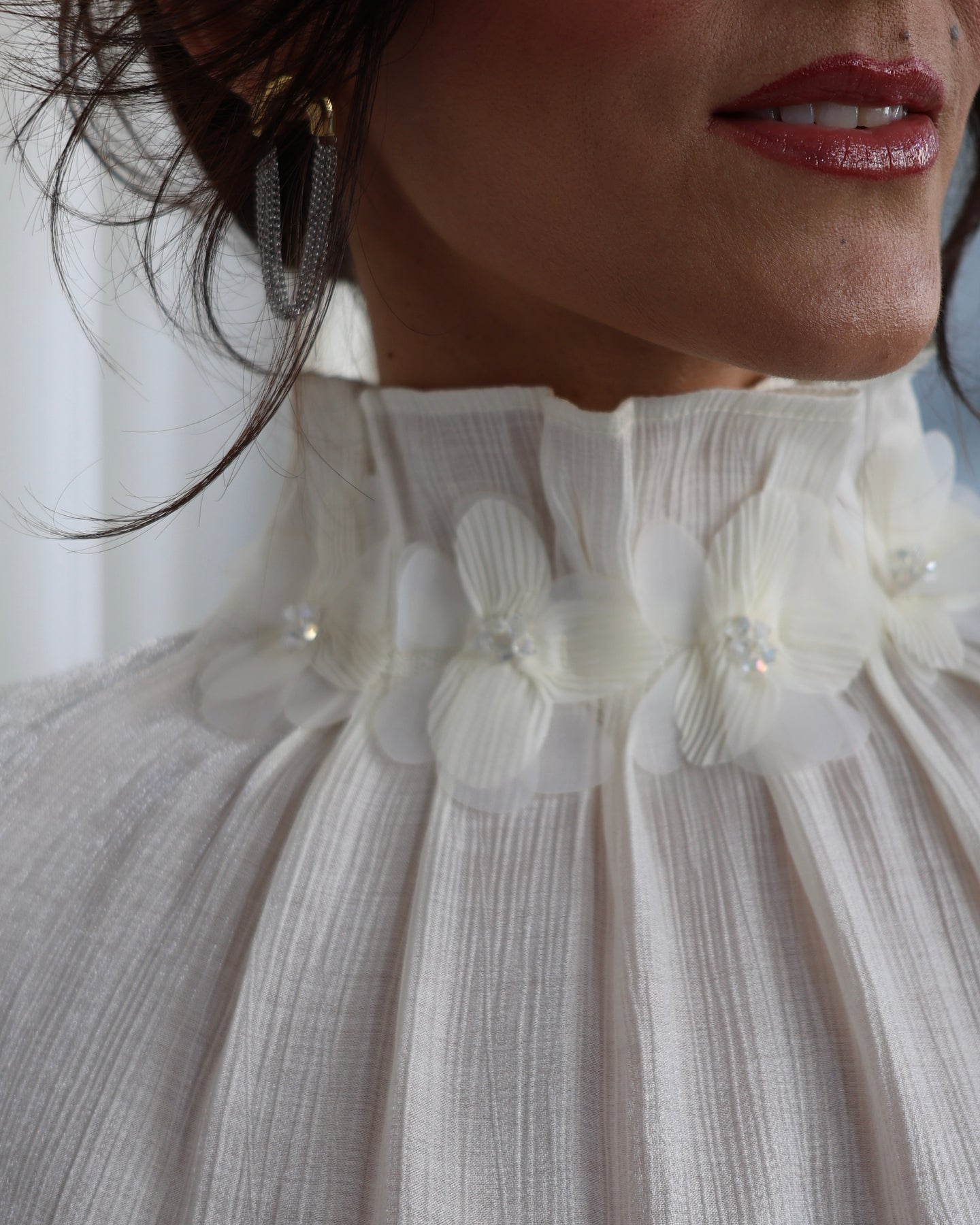 Blusa elegante com detalhes na gola em forma de flor, punhos elegantes com botões forrados, Nova Coleção Spring26.