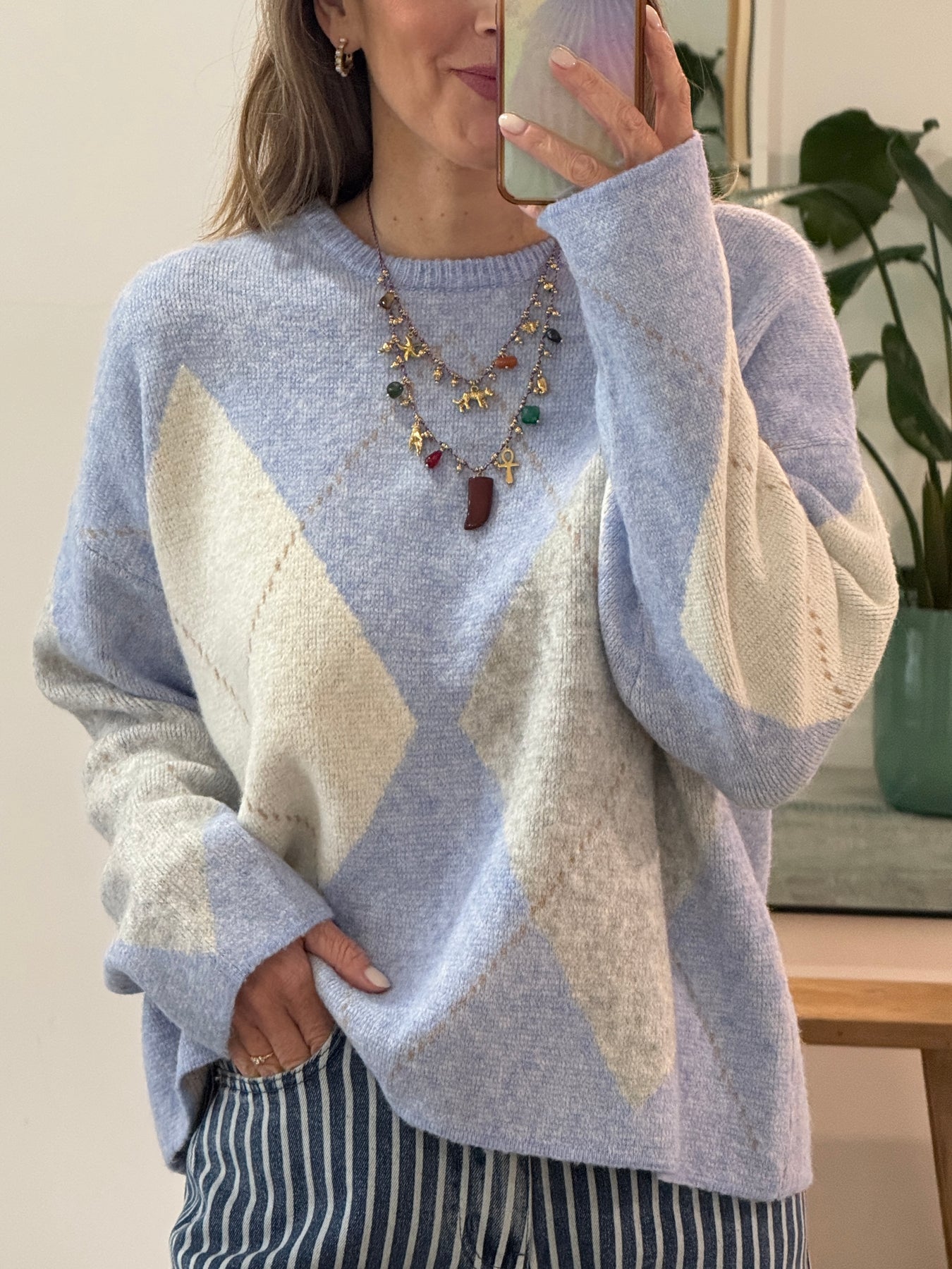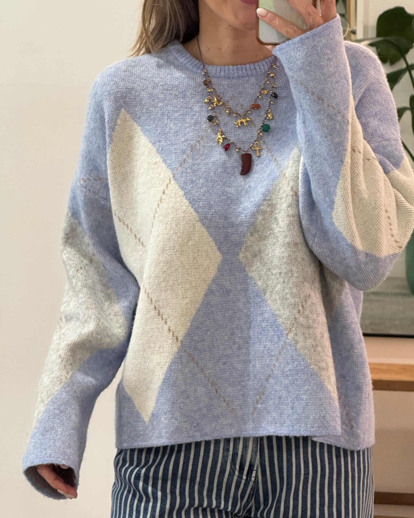 Descrição do produto. Camisola com padrão losango á frente e malha lisa atrás, Nova Coleção Spring26.